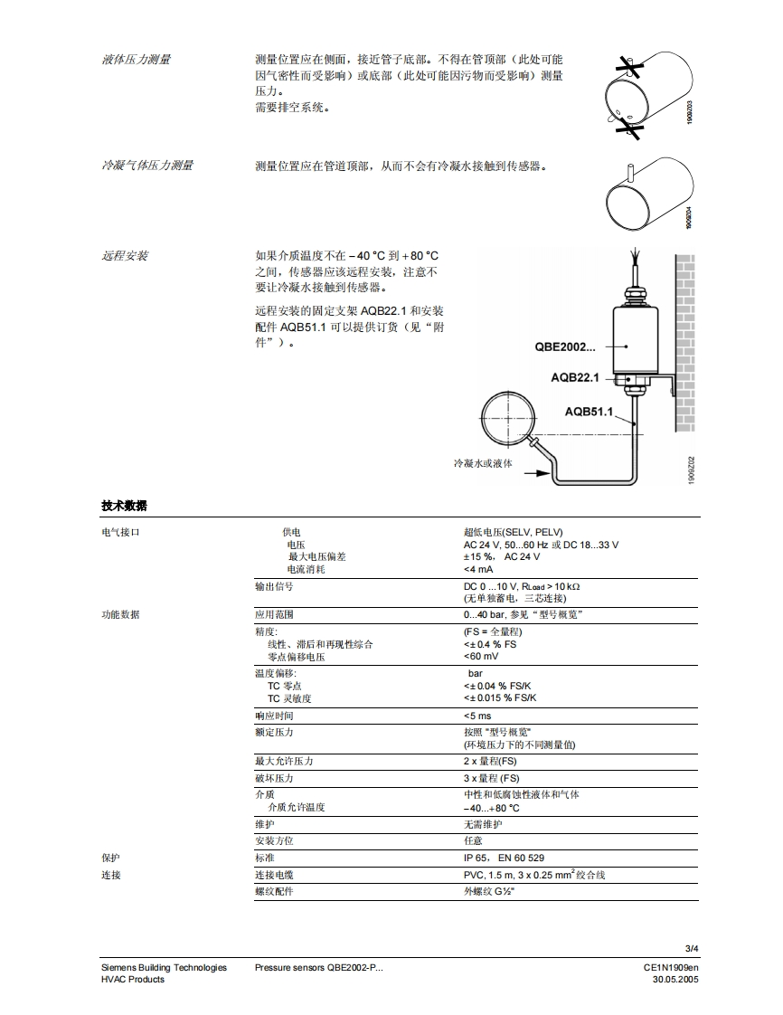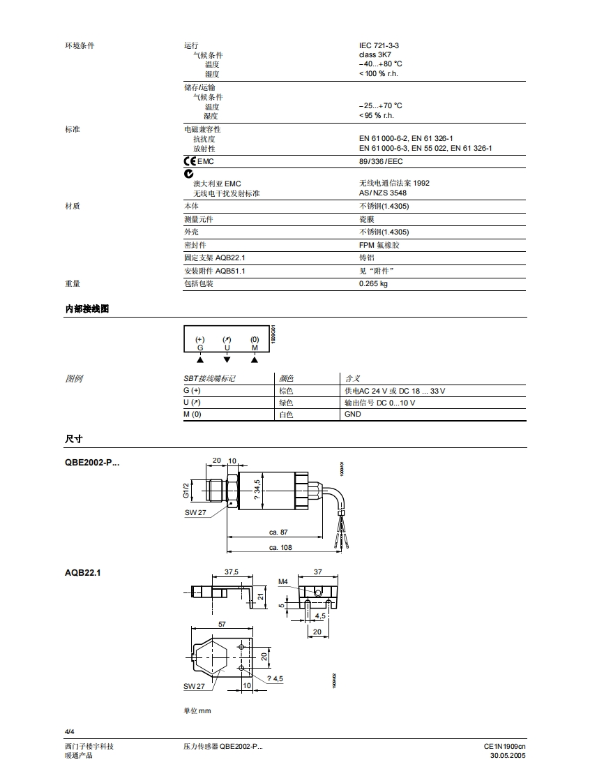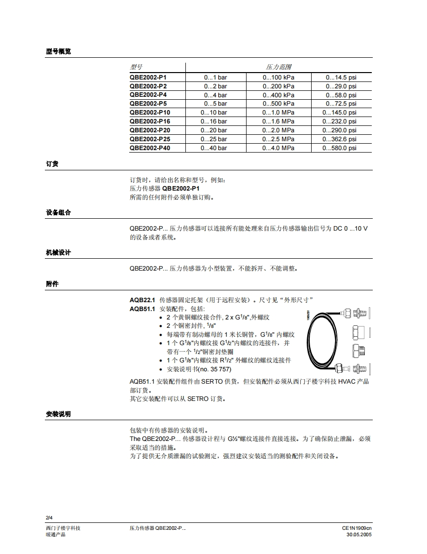 SIEMENS济南工达孔功24小时为您服务!www.cngdkj.com电话:18653198028QQ:1319331276西门子全国最大合作伙伴!压力传感器QBE2002-P.用于液体和气体介质·压阻测量系统。DC0.10V输出信号·测量不受温度变化影响·高温下的稳定性高·无机城老化和漏电·外螺纹G2"。卓越的EMC特性用途QBE2002-P..压力传感器适用于HVAC应用中的静态和动态绝对压力的测量,特别是用于液体和气体(蒸汽)作介质的液压和气动系统。技术设计QBE2002-P..压力传感器采用压力电阻测量原理运行。陶瓷膜片(厚膜混合工艺)通过与介质直接接触测量压力。测量可以转换成直流线性DC0.10V的信号。的信号。CE1N1909cn西门子楼字科技30.05.2005暖通空调产品