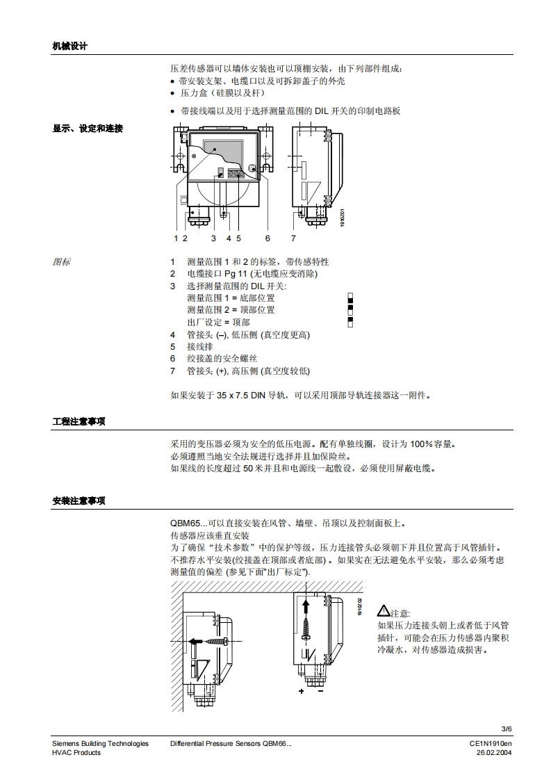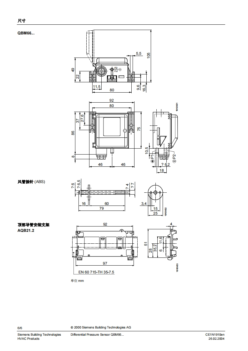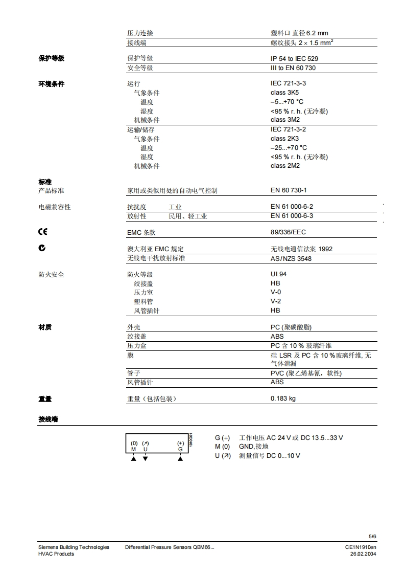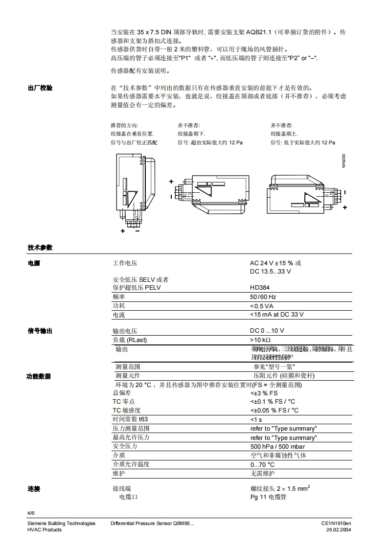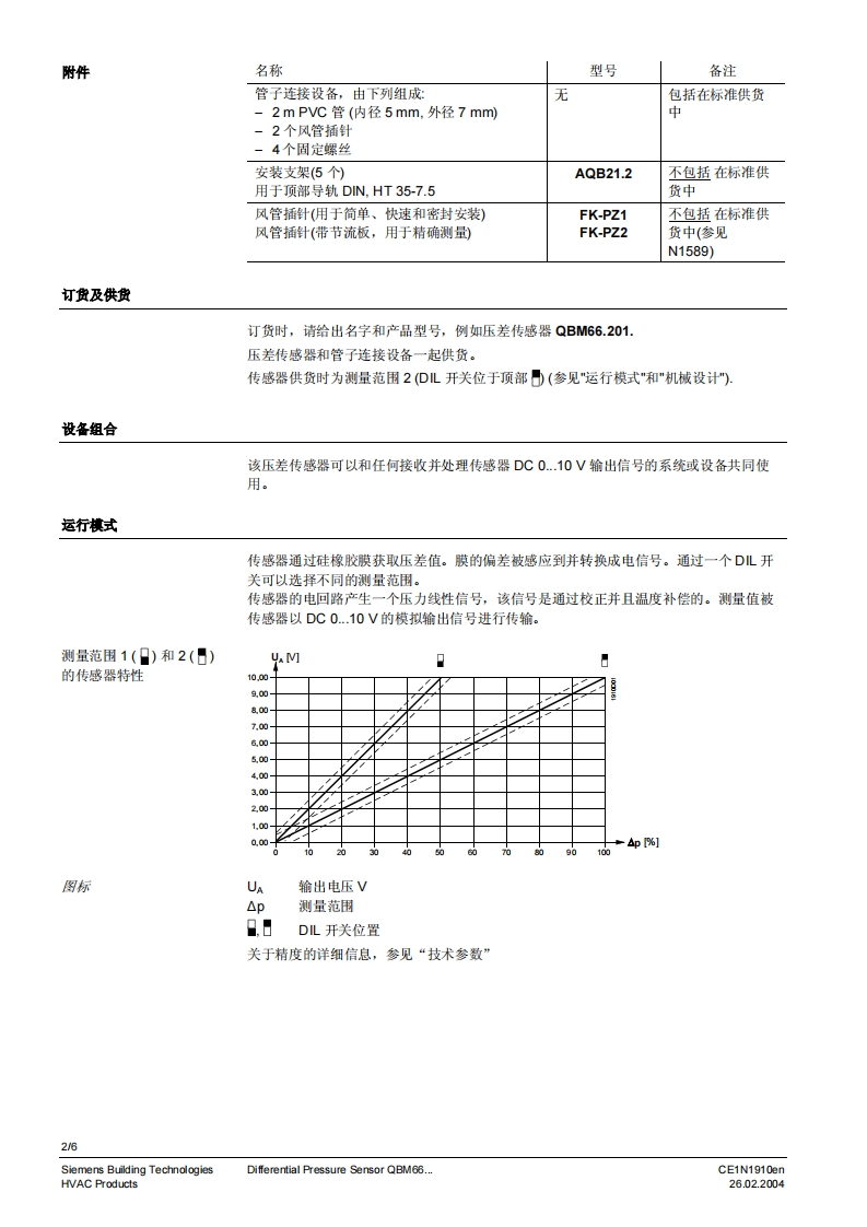 SIEMENS1910压差传感器QBM66...用于空气和无腐蚀性气体·压力线性特性,测量范围可调·工作电压AC24V或者DC13.5..33V·输出信号DC0.10V·供货时带管子连接设各用途用于获取暖通空调中空气和非腐蚀性气体的压差值。压若传感器用于·获取和周围环境压力之间的正压或者负压值大小·监测过滤器并控制风机·测量不同房间的压差型号一览型号测量范围过压范围输出信号范围1范围2PmaxQBM66.2010.100Pa0.200Pa±5.000PaDC0...10VQBM66.2020..250Pa0.500Pa±10.000PaDC0..10VQBM66.2030..1.500Pa0.3.000Pa±20.000PaDC 0...10VCE1N1910enSiemens Building Technologies26.02.2004HVAC Products
