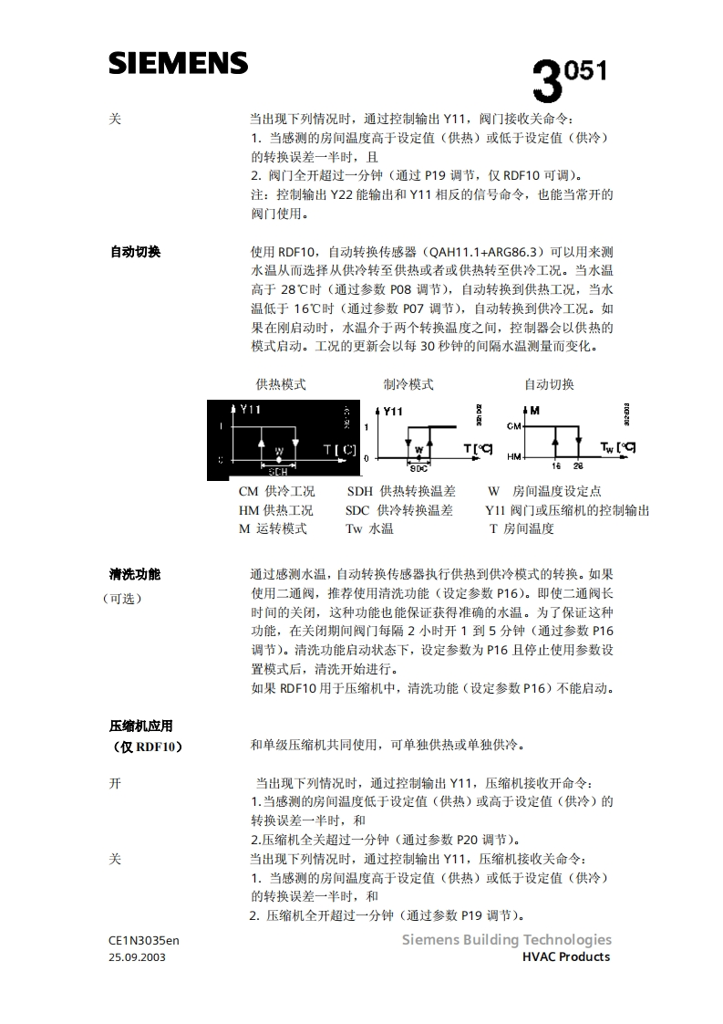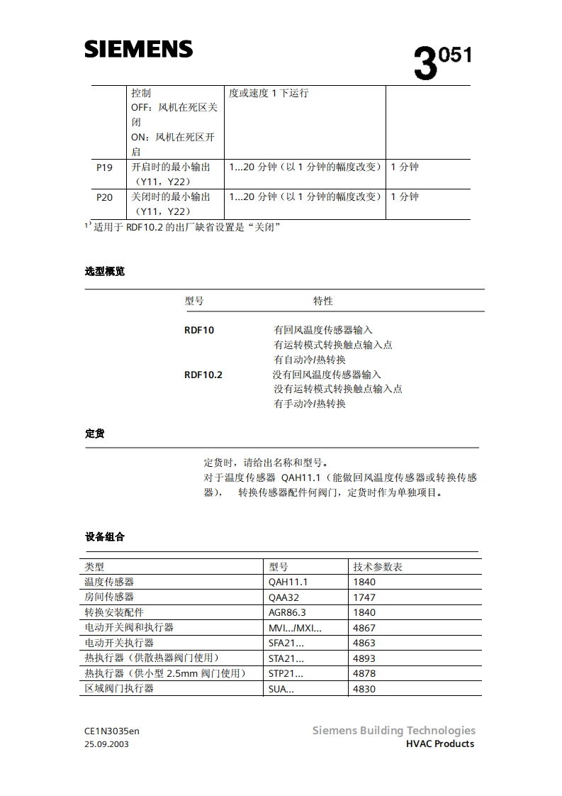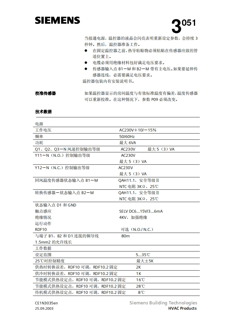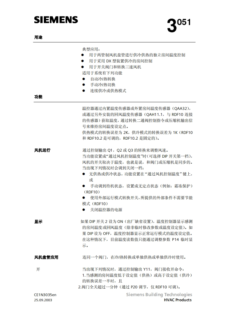 SIEMENS3051RDF10RDF10.2带液晶显示的房间温度控制器RDF10...两管制风机盘管直接膨胀式的压缩机输出开关信号给阀门执行器输出开关信号给单分段压缩机输出开关信号给三风速机按房间或回风温度进行控制(RDF10)自动冷/热转换(RDF10)手动冷/热转换(RDF10.2)工作棋式:正常,节能和待机(RDF1O)工作模式:正常和关闭(RDF10.2)用于远处控制的工作模式转换输入(RDF10)防止湿度损环功能(RDF10)可选择安装和控制参数(RDF10)显示房间温度和可选温度值(RDF10)最小和最大的温度设定值(RDF10)工作电压AC230VCE1N3035enSiemens Building Technologies25.09.2003HVAC Products