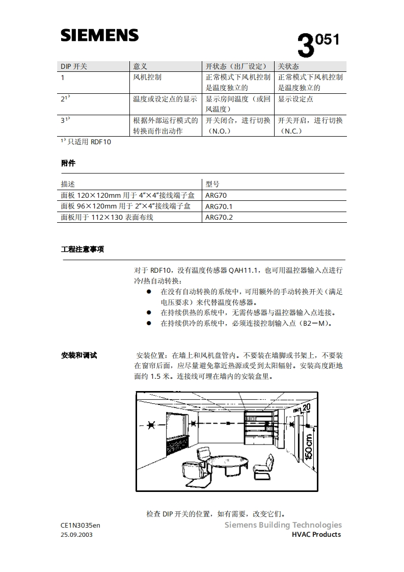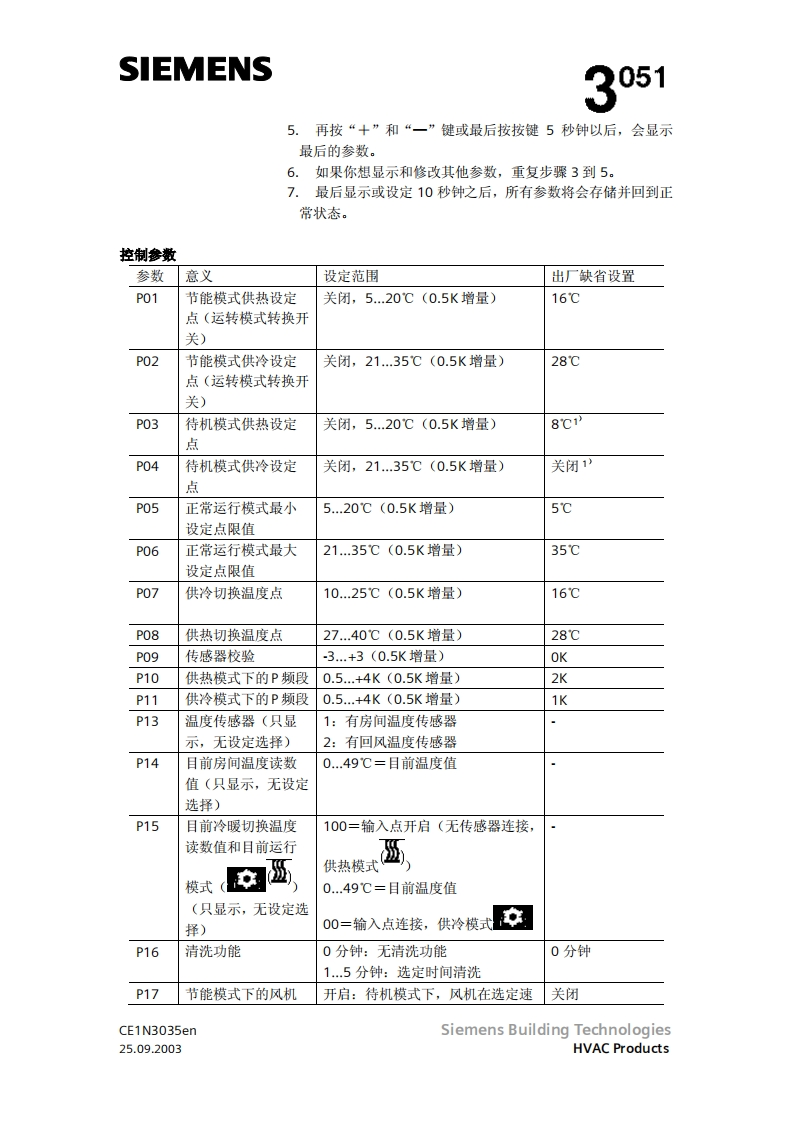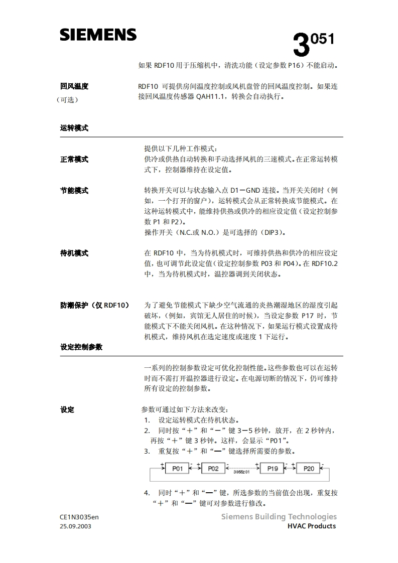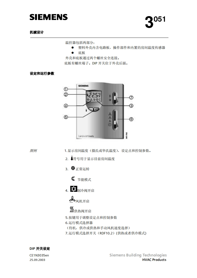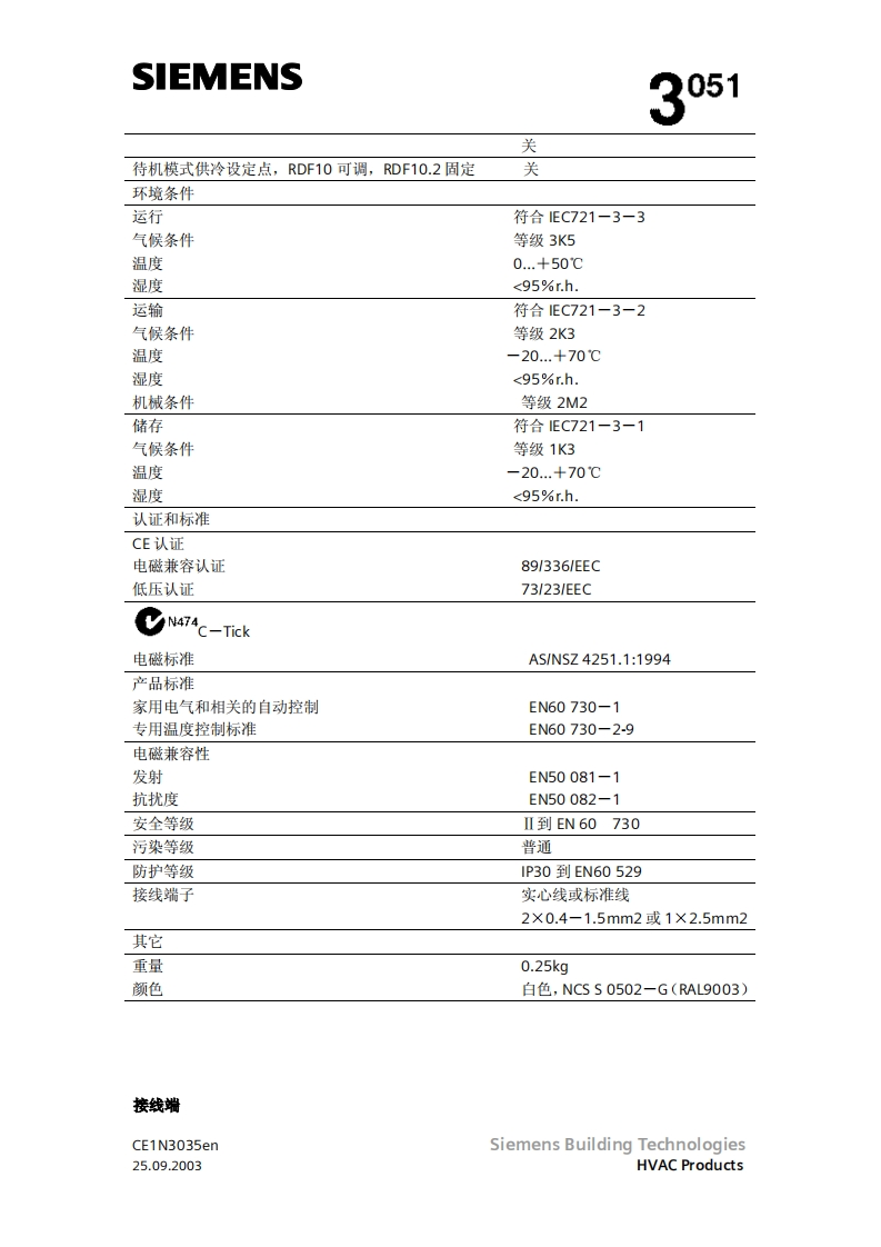 SIEMENS3051RDF10RDF10.2带液晶显示的房间温度控制器RDF10...两管制风机盘管直接膨胀式的压缩机输出开关信号给阀门执行器输出开关信号给单分段压缩机输出开关信号给三风速机按房间或回风温度进行控制(RDF10)自动冷/热转换(RDF10)手动冷/热转换(RDF10.2)工作棋式:正常,节能和待机(RDF1O)工作模式:正常和关闭(RDF10.2)用于远处控制的工作模式转换输入(RDF10)防止湿度损环功能(RDF10)可选择安装和控制参数(RDF10)显示房间温度和可选温度值(RDF10)最小和最大的温度设定值(RDF10)工作电压AC230VCE1N3035enSiemens Building Technologies25.09.2003HVAC Products