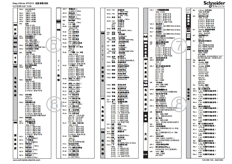 Ea写Altivar ATV310完整参数列表Schneider标注的案为厂设定植Electric217道刀011嘴龙菜单0-9/DC本地0-0mW月考程银示终编1内口静网填xy都制体地况0o0C0m/M+4mA)41电拆定者的1%纯平0-0mw'20n)卫3电平有监机I童牌代码-10(00则高电平有制体地竹使04电电流【16月划程量示锋编达1可的厚机相达州电地网植料帕病重01B框时间域时间状0号名00-9,9+0M1配置1o111斜纯美型配入1010可线推011s复U型国调道购购购购000板电平有卫周山高电平有黄单14卫周4高电平有黄010r%)0信号矣4高电平有04速36.1317理1电平有.1护移SE赞大~晚南电平有电机领式率过时ULU电平有0-1m+0浦电机出厂l.4王加速璃(:变桶言成率)电机额定电装70%盟C n)0-6mn00-9,950M19050-5V时间6应⑩1门楚6电填电机姨电堂EOV-60V0V)0正01414韩植粹美型可斜坡粹坐1习自商惊车餐匹阿直掩生入8完整单自游车配0可表为配卫山L]山纯平有错钢植4时的状志卫理1山电平有情制美卫4根14电平有黄快速钟卑配81单0可表分配代有暨现1山电平有黄卫4想1L4能电平有惜FOORD1门负料ww.schneider-clectric.comEAV96129.04W2020