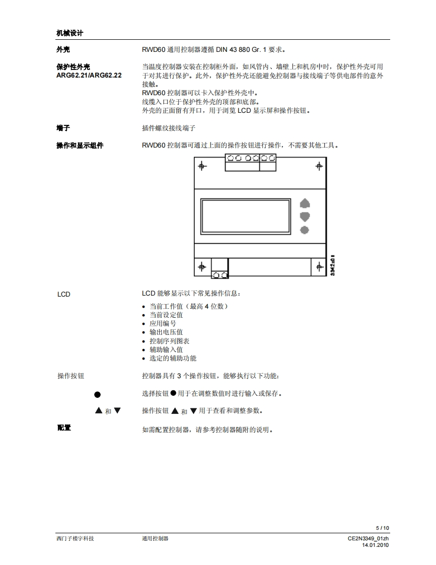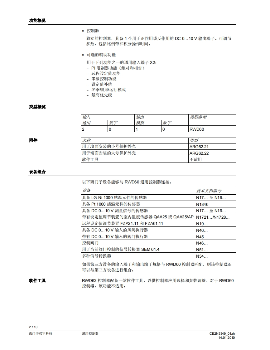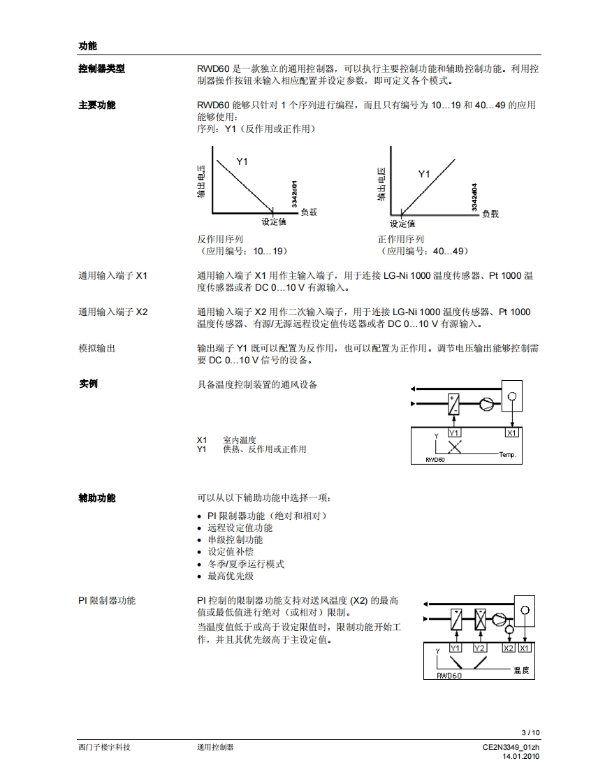 SIEMENS3349回回可可▣可回SIEMENS00220RWD60RWD60通用控制器用于暖通空调与制冷系统的舒适度控制·带P或P川响应的独立电子通用控制器·工作电压为AC24V·控制应用可以通过应用编号进行选择·可以选择有源输入范围·输出范围的限值和方向可以自由分配·2个通用输入增子,用于连接Ni1000、Pt1000温度传感器和DC0..10V信号·可以将单位设定为℃、°F、%,或者不指定单位·1个DC0..10V调节信号输出,正作用或反作用。可以使用控制器上的操作按钮输入或更政所有数据,无需其他工具用途RWD60通用控制器旨在供舒适度控制设备中的暖通空调和制冷系统使用。该控制器可以安装于控制柜中,或者借助ARG62.21ARG62.22外壳,安装于风管内、墙壁上和机房中。RWD60控制器是具备双输出功能的RWD62控制器的简化版本,包括了RWD62控制器的所有特性和功能,但是价格更具竞争性。RWD60面向广阔的单回路、单输出市场。暖通空调与制冷应用该控制器可对以下方面进行测量和控制:温度、相对湿度、绝对湿度、焓值、压差、体积式空气流量和室内空气质量。输入范围的设置区间为-100至8,000。输出电压的最小值和最大值可以是DC0..10V之间的任何数值。CE2N3349_01zh14.01.2010西门子楼宇科技