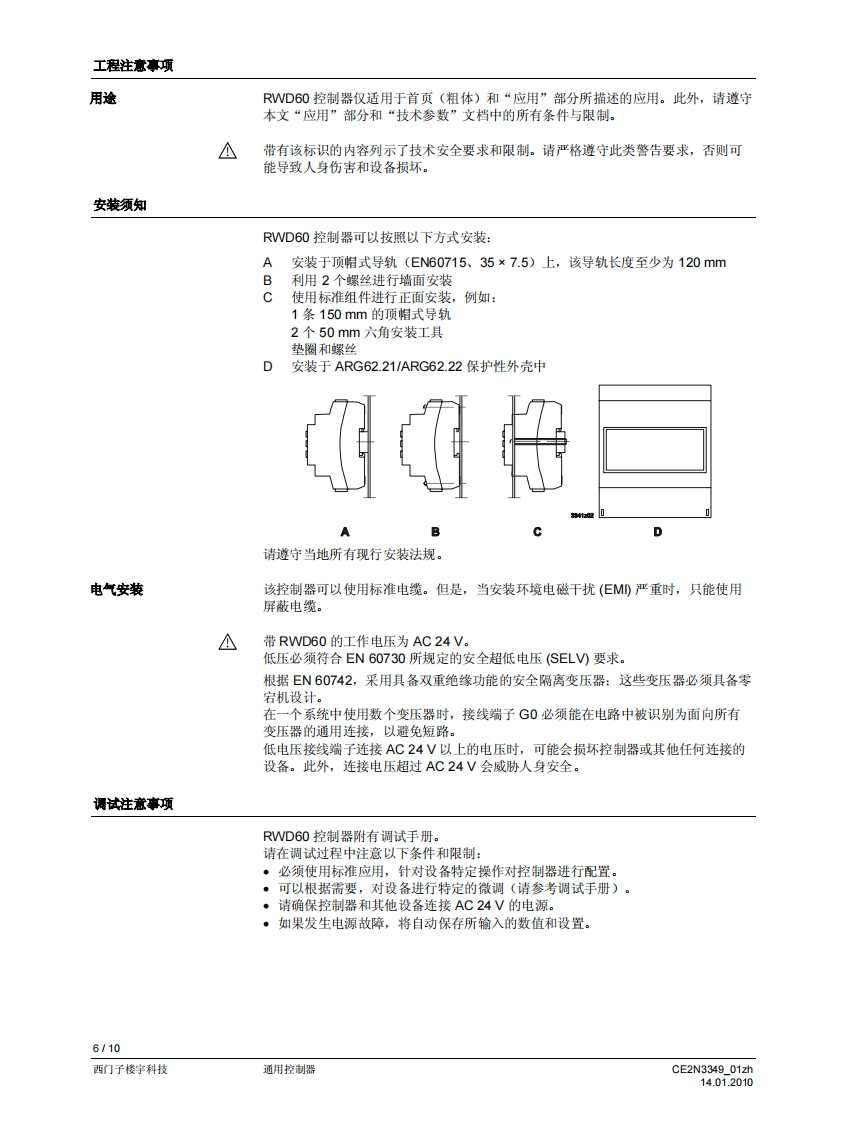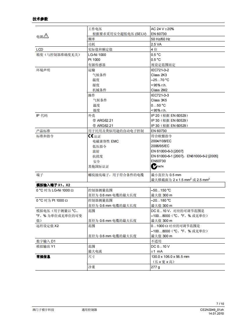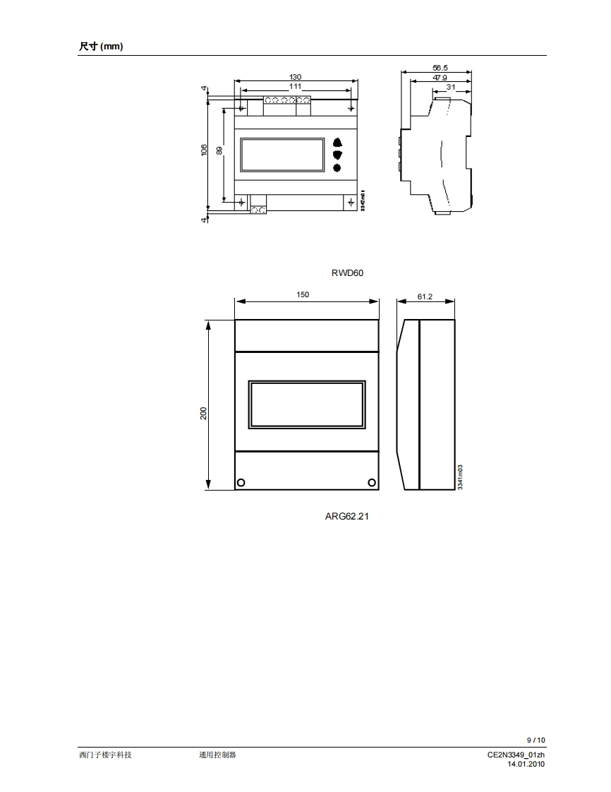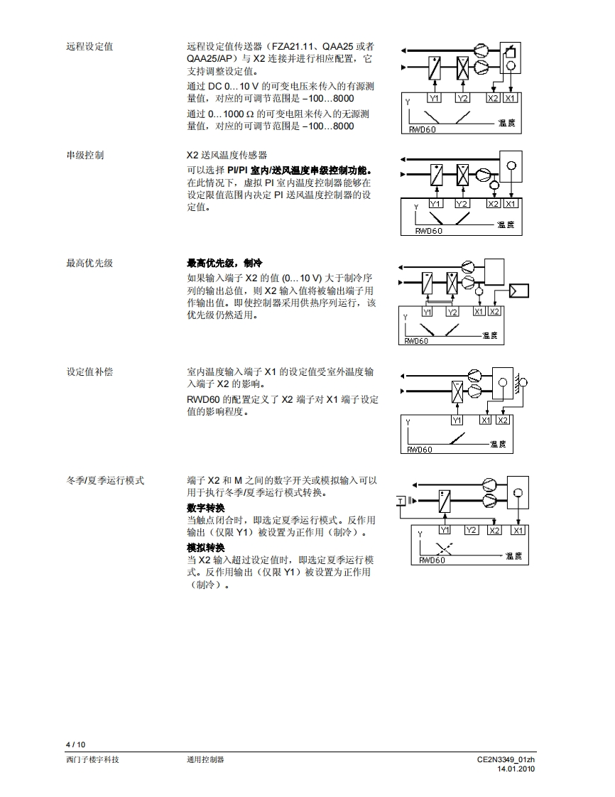 SIEMENS3349回回可可▣可回SIEMENS00220RWD60RWD60通用控制器用于暖通空调与制冷系统的舒适度控制·带P或P川响应的独立电子通用控制器·工作电压为AC24V·控制应用可以通过应用编号进行选择·可以选择有源输入范围·输出范围的限值和方向可以自由分配·2个通用输入增子,用于连接Ni1000、Pt1000温度传感器和DC0..10V信号·可以将单位设定为℃、°F、%,或者不指定单位·1个DC0..10V调节信号输出,正作用或反作用。可以使用控制器上的操作按钮输入或更政所有数据,无需其他工具用途RWD60通用控制器旨在供舒适度控制设备中的暖通空调和制冷系统使用。该控制器可以安装于控制柜中,或者借助ARG62.21ARG62.22外壳,安装于风管内、墙壁上和机房中。RWD60控制器是具备双输出功能的RWD62控制器的简化版本,包括了RWD62控制器的所有特性和功能,但是价格更具竞争性。RWD60面向广阔的单回路、单输出市场。暖通空调与制冷应用该控制器可对以下方面进行测量和控制:温度、相对湿度、绝对湿度、焓值、压差、体积式空气流量和室内空气质量。输入范围的设置区间为-100至8,000。输出电压的最小值和最大值可以是DC0..10V之间的任何数值。CE2N3349_01zh14.01.2010西门子楼宇科技