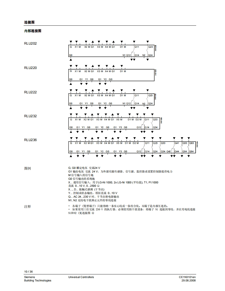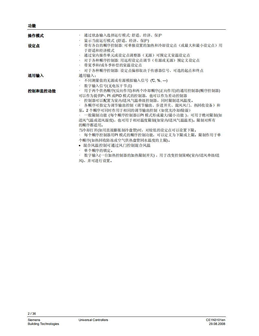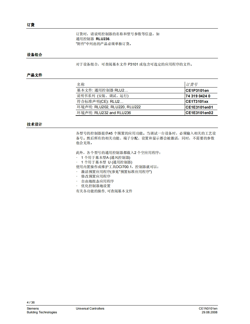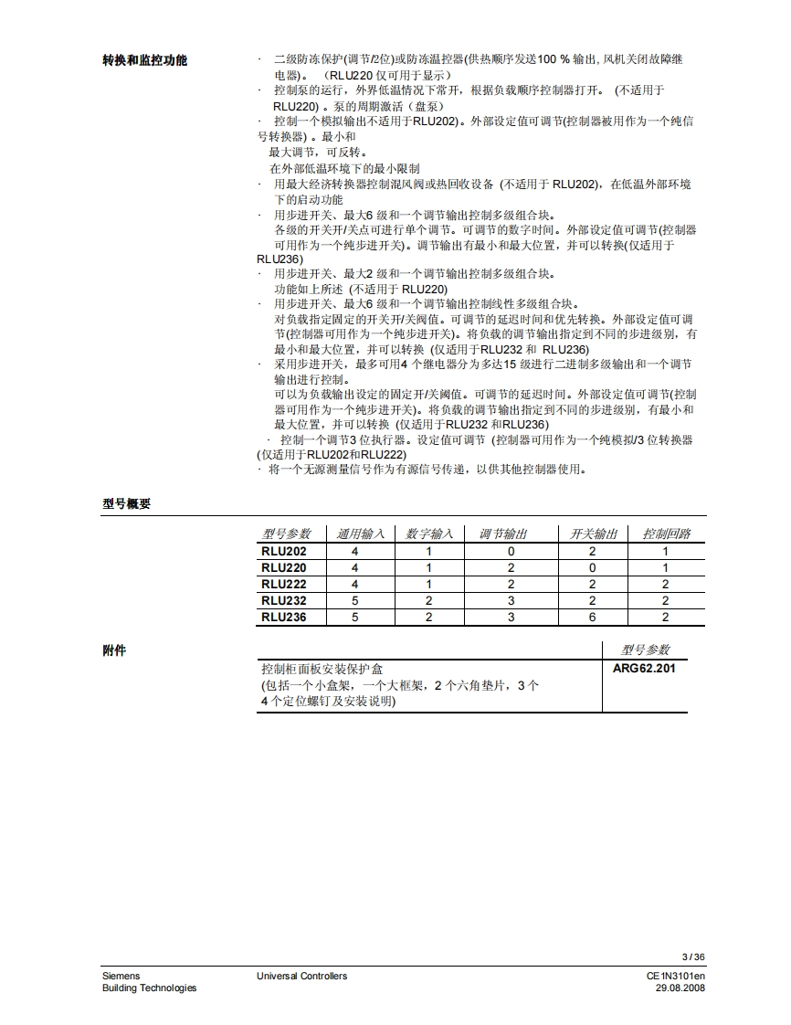 3101iiliil i n i il i ii H11111311131111111HSynco TM 200通用控制器RLU2...带有预置的标准应用自由编程的控制器,以适用于相关合适的工艺类型。P,PL,或PID模式菜单选择操作用途用于从基本到复杂的通风、空调和制冷工艺设备。通用控制器用于处理以下控制变量:温度、相对/绝对湿度、压力/差压、气体流量、室内空气质量和焓值。CE1N3101en29.08.2008Building Technologies