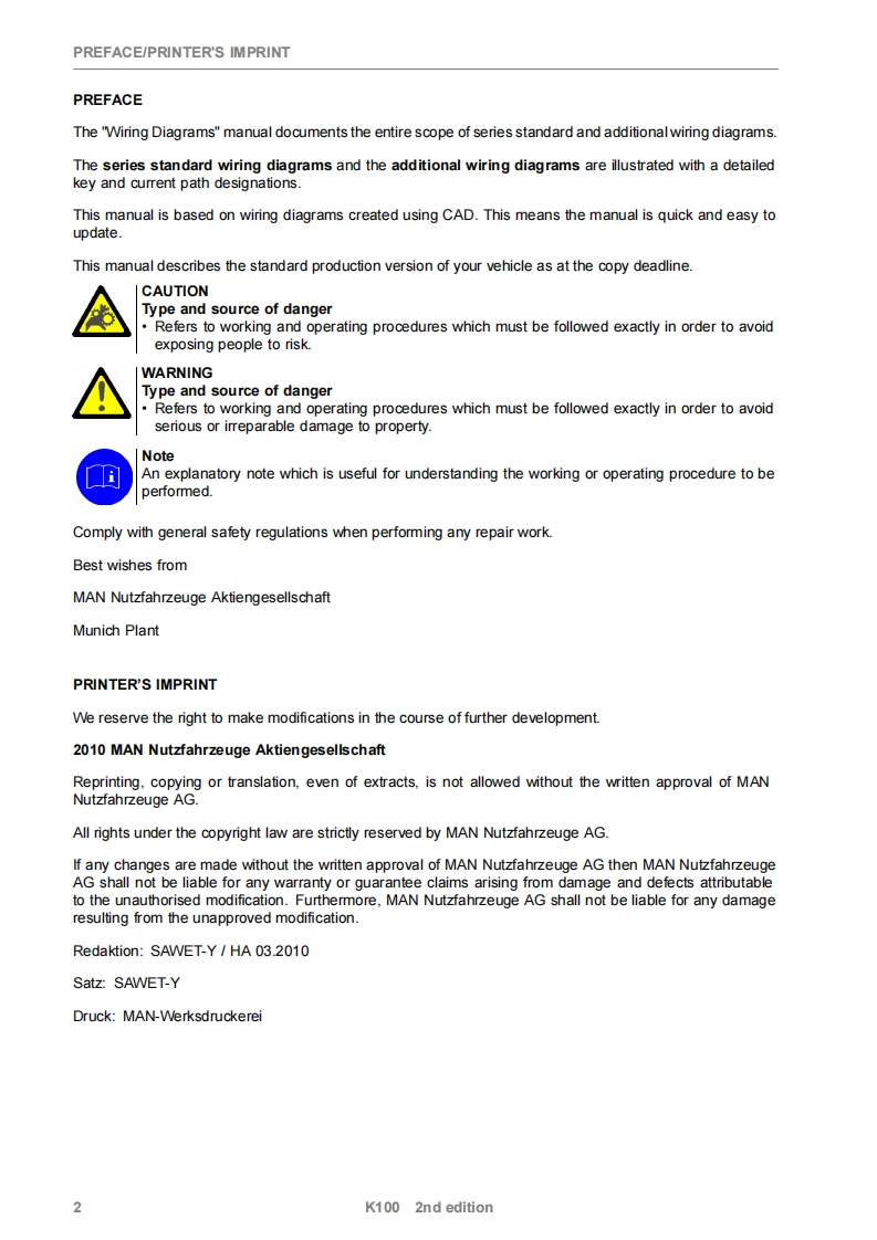 MANKElectrical SystemTGS/TGX06S-1580,06S-158189S-0161,89S-016226X-0150,28X-0006,30X-0273Copy deadline:03.2010Wiring Diagrams81.99298-66022nd editionK100MAN Nutzfahrzeuge AktiengesellschaftSchaltplane K100,2.AusgabeDachauer Str.667Elektrische Anlage80995 MUNCHENTGS/TGXoderEnglisch-Postfach 50 06 20Printed in Germany80976 MUNCHEN