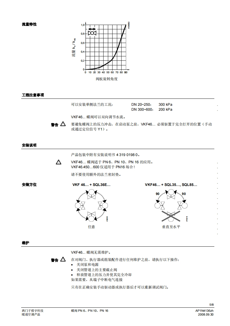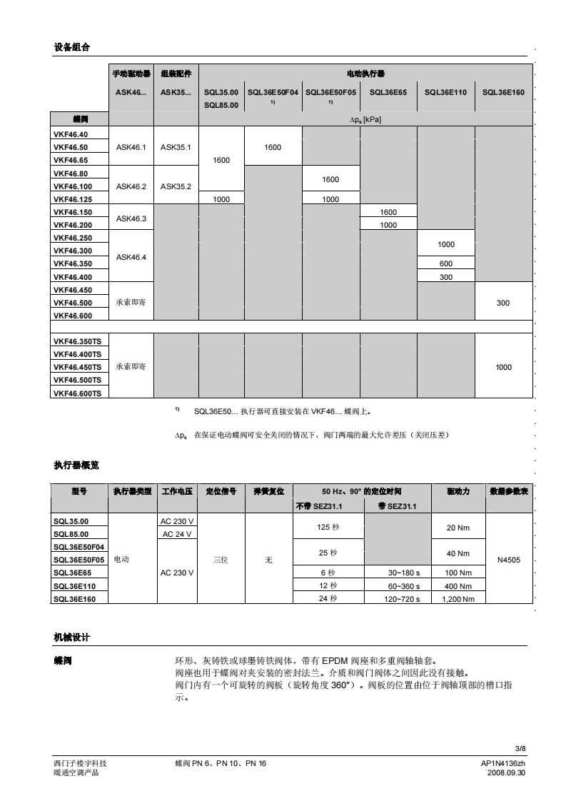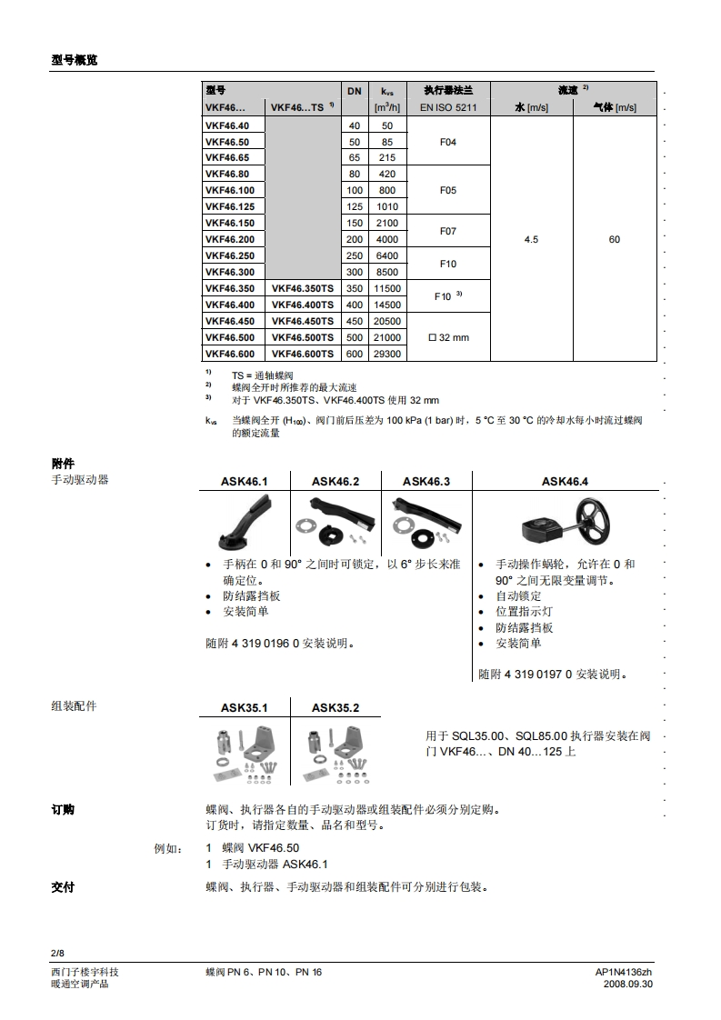 SIEMENS4136蝶阀PN6、PN10、PN16VKF46.VKF46...TS灰特铁阀体EN-GJL-250(到DN300)。球量0铁阀体EN-GJS-400-15(DN350及以上)DN40-600·ks50-29300m3h。适用于符合IS07005的PN6、PN10、PN16配对法兰密封性符合EN12266-1,泄漏率A·无需维护。可选ASK46..手动驱动器(到DN400)·可选配电动执行器SQL35.00、SQL85.00或SQL36E..用途用于在暖通空调系统、造船和发电站技术中作为电动、手动控制或截止阀使用·用于开式和闭式系统中·用于两位控制(开/关)·用于三位控制·用于锅炉、制冷机和冷却塔的顺序循环·换热器或整个换热站水流的量开/关选择控制AP1N4136zh西门子楼宇科技2008.09.30暖通空调产品
