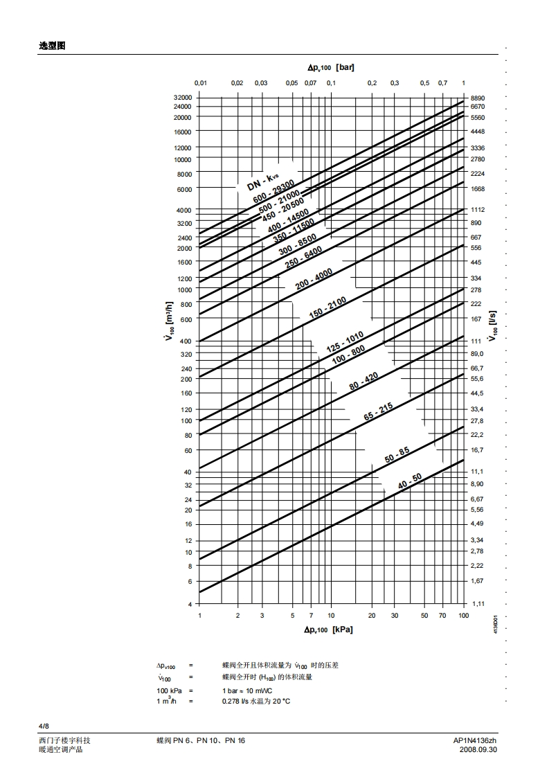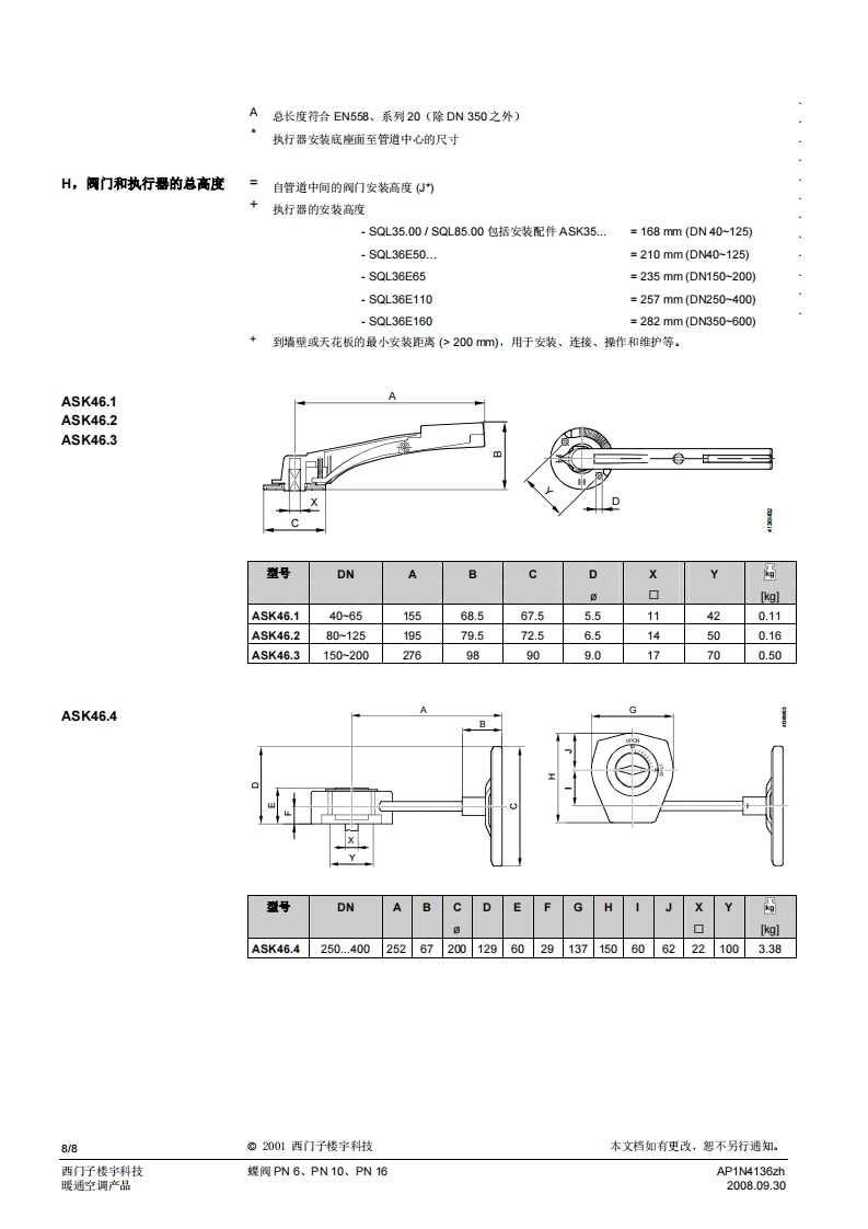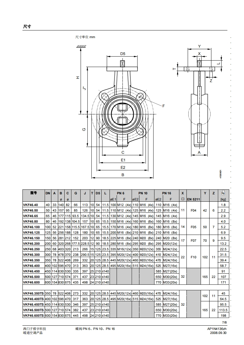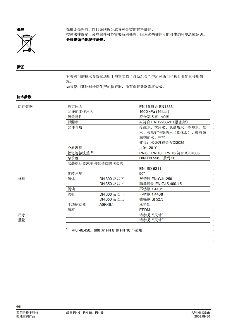 SIEMENS4136蝶阀PN6、PN10、PN16VKF46.VKF46...TS灰特铁阀体EN-GJL-250(到DN300)。球量0铁阀体EN-GJS-400-15(DN350及以上)DN40-600·ks50-29300m3h。适用于符合IS07005的PN6、PN10、PN16配对法兰密封性符合EN12266-1,泄漏率A·无需维护。可选ASK46..手动驱动器(到DN400)·可选配电动执行器SQL35.00、SQL85.00或SQL36E..用途用于在暖通空调系统、造船和发电站技术中作为电动、手动控制或截止阀使用·用于开式和闭式系统中·用于两位控制(开/关)·用于三位控制·用于锅炉、制冷机和冷却塔的顺序循环·换热器或整个换热站水流的量开/关选择控制AP1N4136zh西门子楼宇科技2008.09.30暖通空调产品