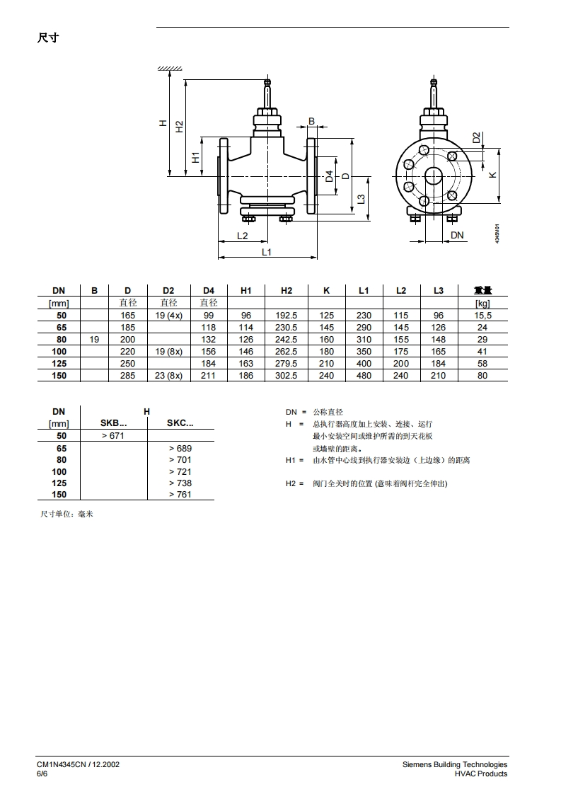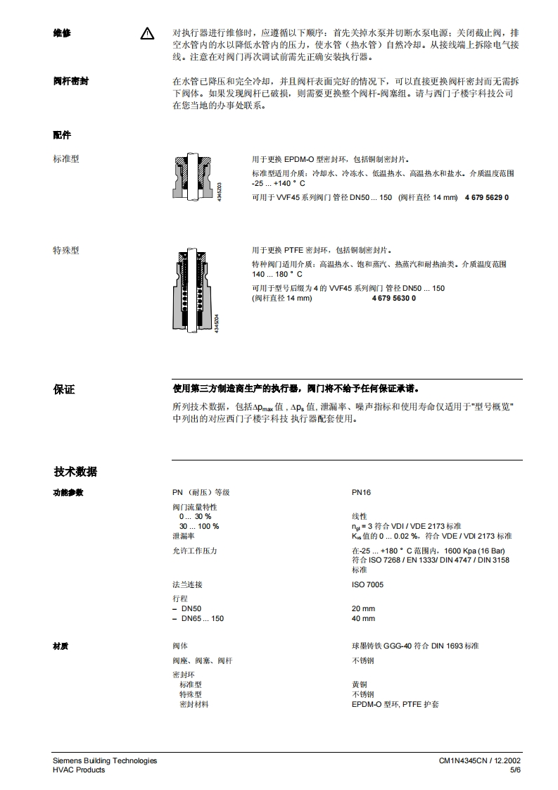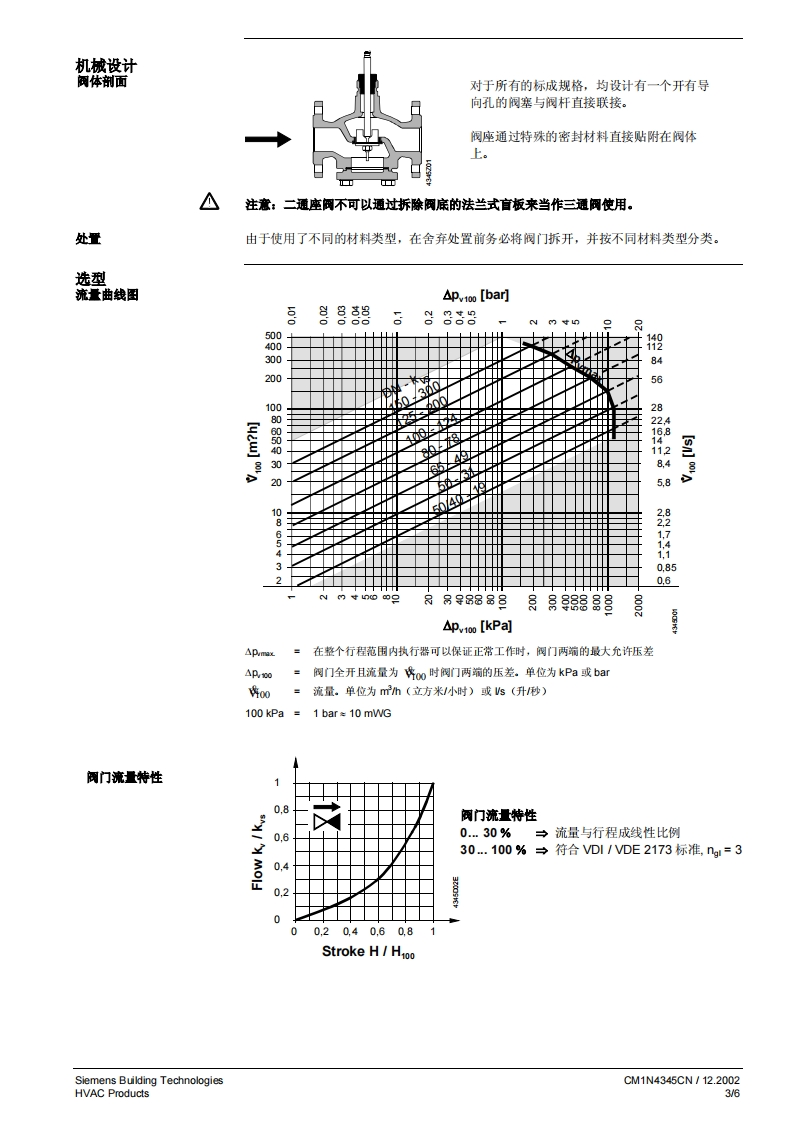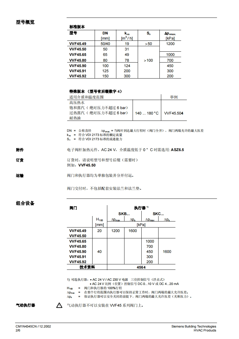 SIEMENS4345二通阀法兰连接,PN16VVF45...法兰连接二通阀,附压等级PN16·阀体:球量铸铁GGG-40·公称直径:DN50..150mm·流量Ks:19.300m3h·阀杆行程:20或40mm·可与SKB系列、SKC系列执行器配合安装·公称直径DN15.40mm的同类阀门,请参见技术资料4373用途适用于区域供热系统、暖通空调系统中作为符合DIN32730标准的控制阀或安全截止阀。适用于开式系统和闭式系统。介质采用标准密封的标准阀门适用于以下介质:冷却水冷冻水低压热水-25..+140°C高压热水防冻水,最大不能超过体积的50%)到盐水)采用特殊密封的特殊阀门适用于以下介质:高温热水饱和蒸汽(绝对压力不超过6bar)140.180℃过热蒸汽(绝对压力不超过6bar)耐热油制冷剂不适用31)介质温度低于0°C时:需要ASZ6.5阀杆加热元件来防止密封套内的阀杆冻结2)防冻水和盐水:最低-10°C符合DN3158标准(压力容器1)或最低-25°C符合DN3158标准(压力容器)3)对于这些应用,应使用带电磁式执行器的特制制冷剂阀,请参见技术资料4700…4799Siemens Building TechnologiesCM1N4345CN/12.2002HVAC Products1/6