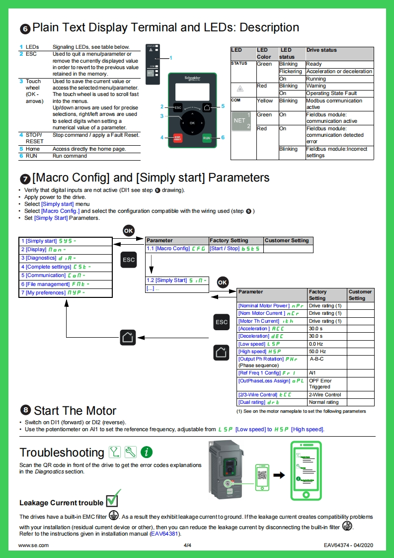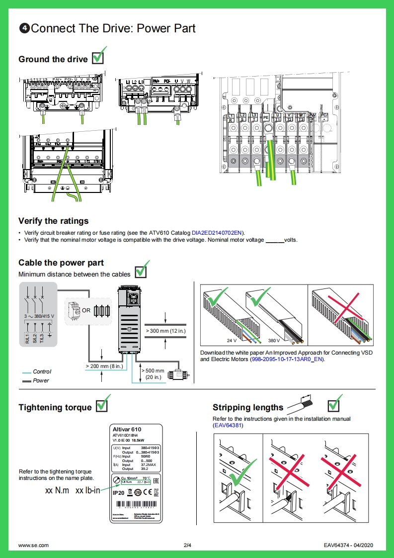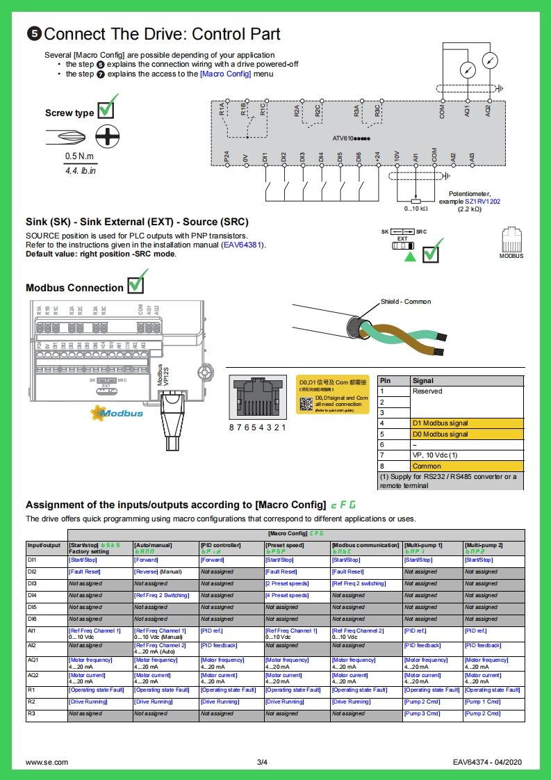 ENGLISHGetting Started with Easy Altivar ATV610EAV6437406①Download The ManualsYou must have detailed information to be able to carry out the installation andcommissioning.This information can be found in the following manuals thatcan be downloaded on www.se.comVerify the Keyor scan the QR code in front of the Drive.2▣Points of yourThe ATV610 Installation manual (EAV64381)installation,The ATV610 Programming manual (EAV64387)identifiedThe Getting Started manual does not replace the Installationby this symbol.and the Programming manuals.AA DANGERHAZARD OF ELECTRIC SHOCK,EXPLOSION,OR ARC FLASHOnly appropriately trained persons who are familiar with and understand the contents of this manual and all other pertinent product documentation and whohave received safety training to recognize and avoid hazards involved are authorized to work on and with this drive system.Installation,adjustment,repair andmaintenance must be performed by qualified personnel.The system integrator is responsible for compliance with all local and national electrical code requirements as well as all other applicable regulations withrespect to grounding of all equipment.Many components of the product,including the printed circuit boards,operate with mains voltage.Only use properly rated,electrically insulated tools and measuring equipment.Do not touch unshielded components or terminals with voltage present..Motors can generate voltage when the shaft is rotated.Prior to performing any type of work on the drive system,block the motor shaft to prevent rotation.AC voltage can couple voltage to unused conductors in the motor cable.Insulate both ends of unused conductors of the motor cable.Do not short across the DC bus terminals or the DC bus capacitors or the braking resistor terminals.Before performing work on the drive system:Dis connect all power,including external control power that may be present.Take into account that the circuit breaker or main switch does not de-energizeall circuits.Place a Do Not Tum On label on all power switches related to the drive systemLock all power switches in the open position.Wait 15 minutes to allow the DC bus capacitors to discharge.Follow the instructions given in the chapter "Verifying the Absence of Voltage"in the installation manual of the productBefore applying voltage to the drive system:Verify that the work has been completed and that the entire installation cannot cause hazards.If the mains input terminals and the motor output terminals have been grounded and short-circuited,remove the ground and the shortcircuits on the mainsinput terminals and the motor output terminals.Verify proper grounding of all equipment..Verify that all protective equipment such as covers,doors,grids is installed andor closed.Failure to follow these instructions will result in death or serious injury.Electrical equipment should be installed,operated,serviced,and maintained only by qualified personnel.No responsibility is assumed by Schneider Electric for aryconsequ