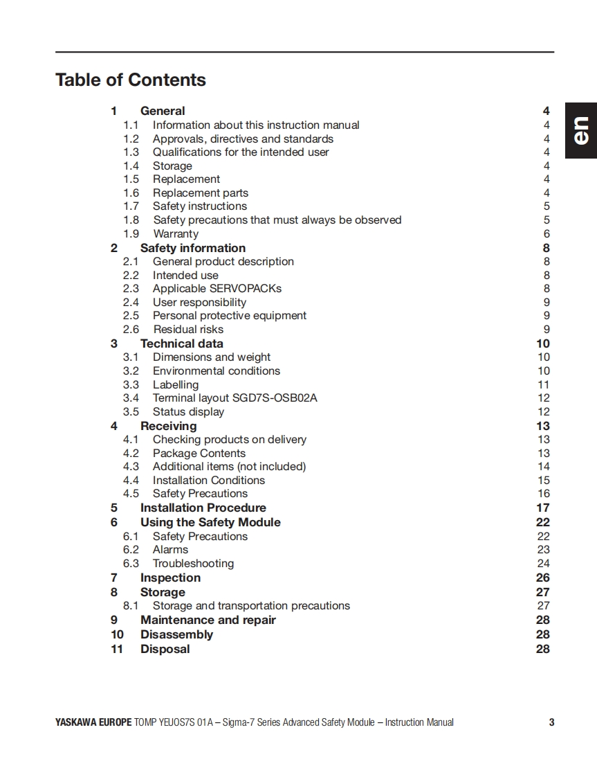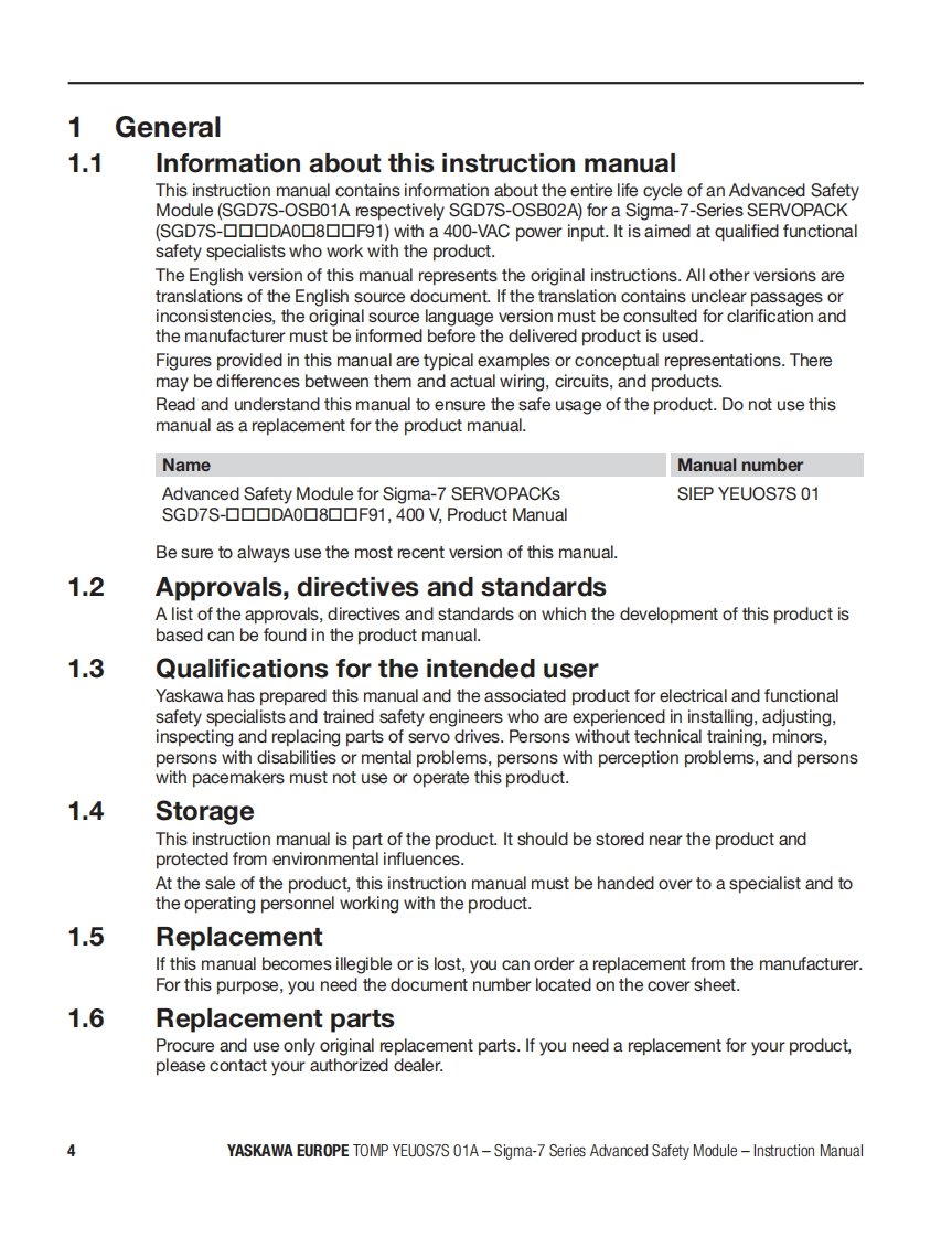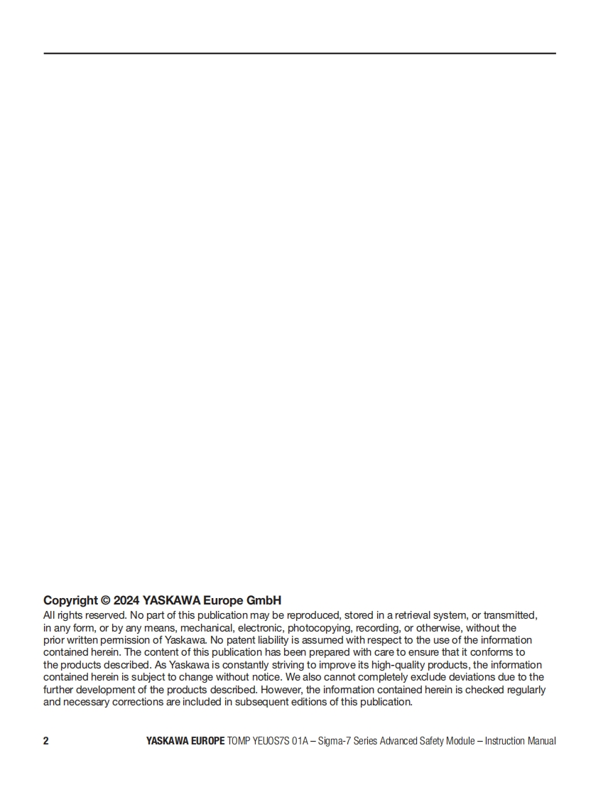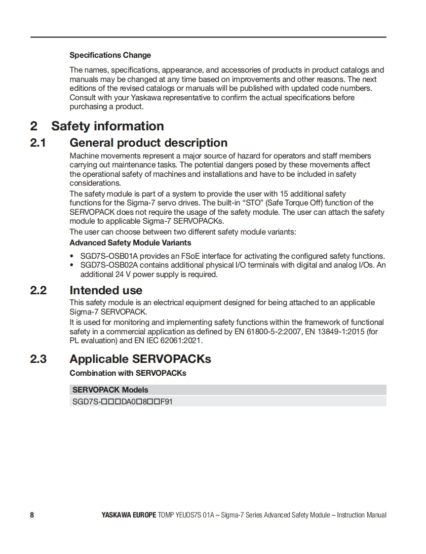 YASKAWAAdvanced Safety Module品for Sigma-7 SERVOPACK SGD7S-☐▣☐DA0▣8☐☐F91,400VInstruction ManualModel:SGD7S-OSBO1AgSGD7S-OSB02ATo properly use the product,read this manual thoroughly and retain for easyreference,inspection,and maintenance.Ensure the end user receives this manual中出出8a9中E台Manual No.TOMP YEUOS7S 01A