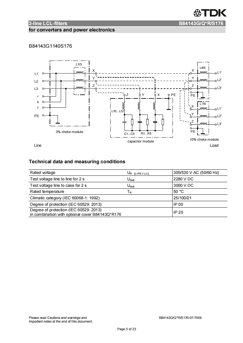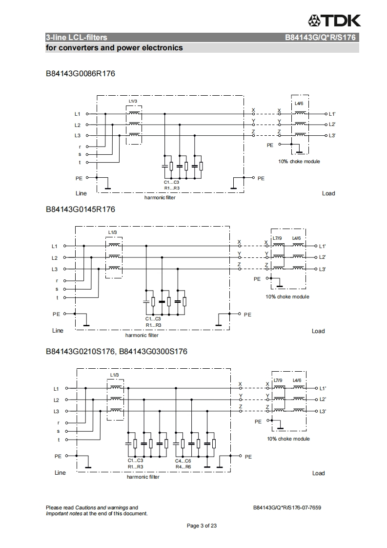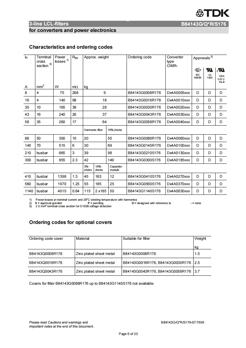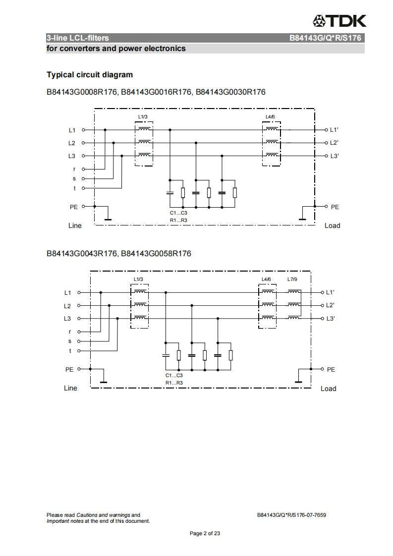 公TDKDatasheet3-line LCL-filtersfor converters and power electronics305/530V,50/60Hz,8..1140A,50COrdering code:B84143G/Q*R/S176Date:2015-12-15Version:07EPCOS AG 2015.Reproduction,publication and dissemination of this publication,enclosures hereto and theinfommation contained therein without EPCOS'prior express consent is prohibited.EPCOS AG is a TDK Group CompanyPage 1 of 23