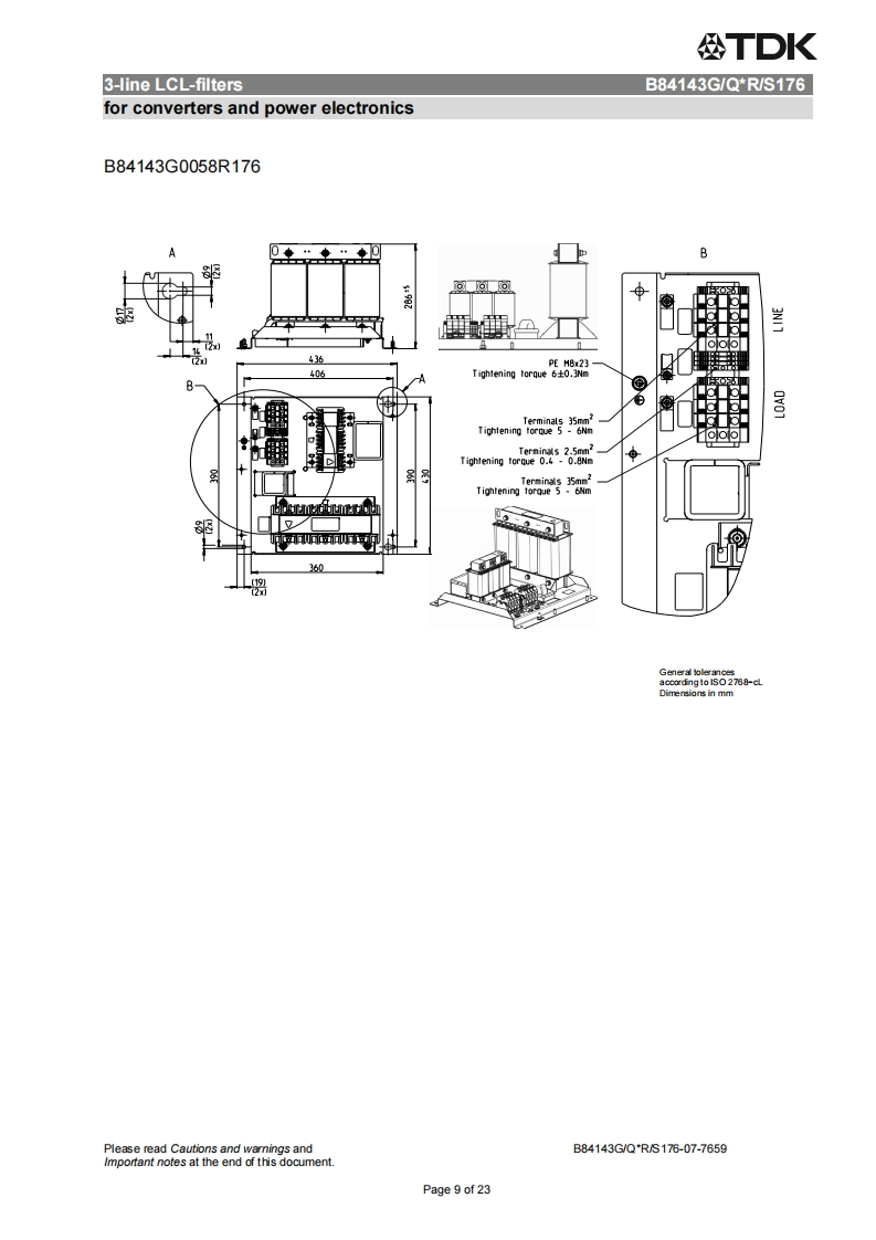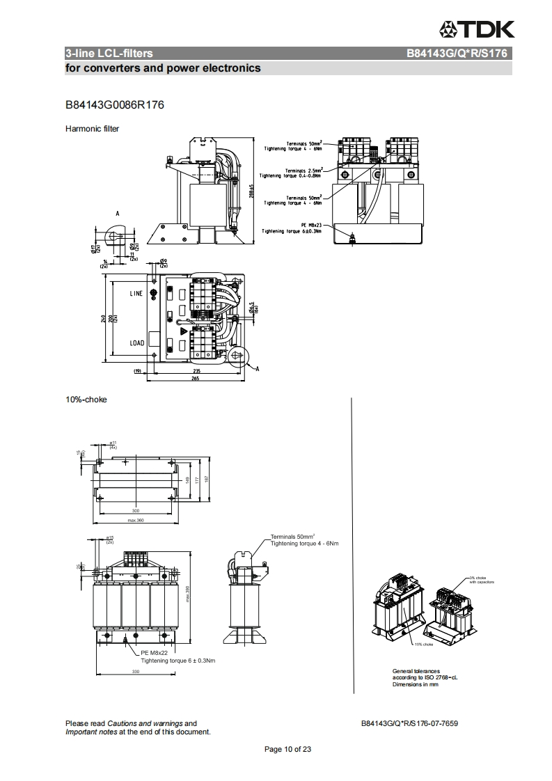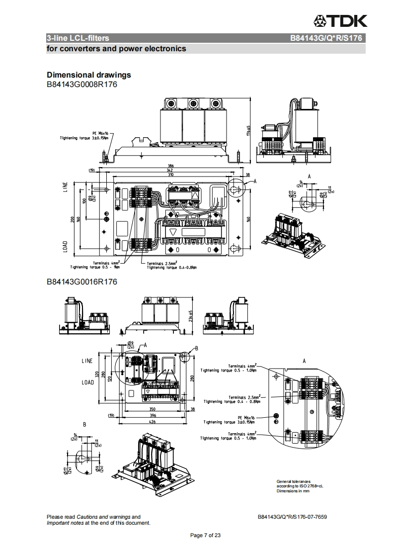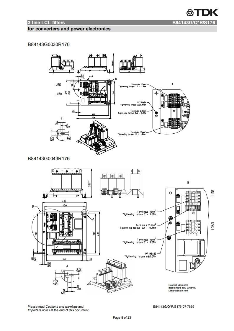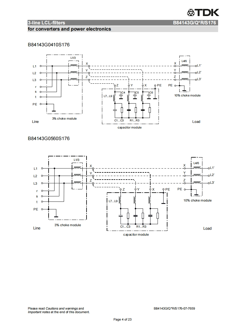公TDKDatasheet3-line LCL-filtersfor converters and power electronics305/530V,50/60Hz,8..1140A,50COrdering code:B84143G/Q*R/S176Date:2015-12-15Version:07EPCOS AG 2015.Reproduction,publication and dissemination of this publication,enclosures hereto and theinfommation contained therein without EPCOS'prior express consent is prohibited.EPCOS AG is a TDK Group CompanyPage 1 of 23
