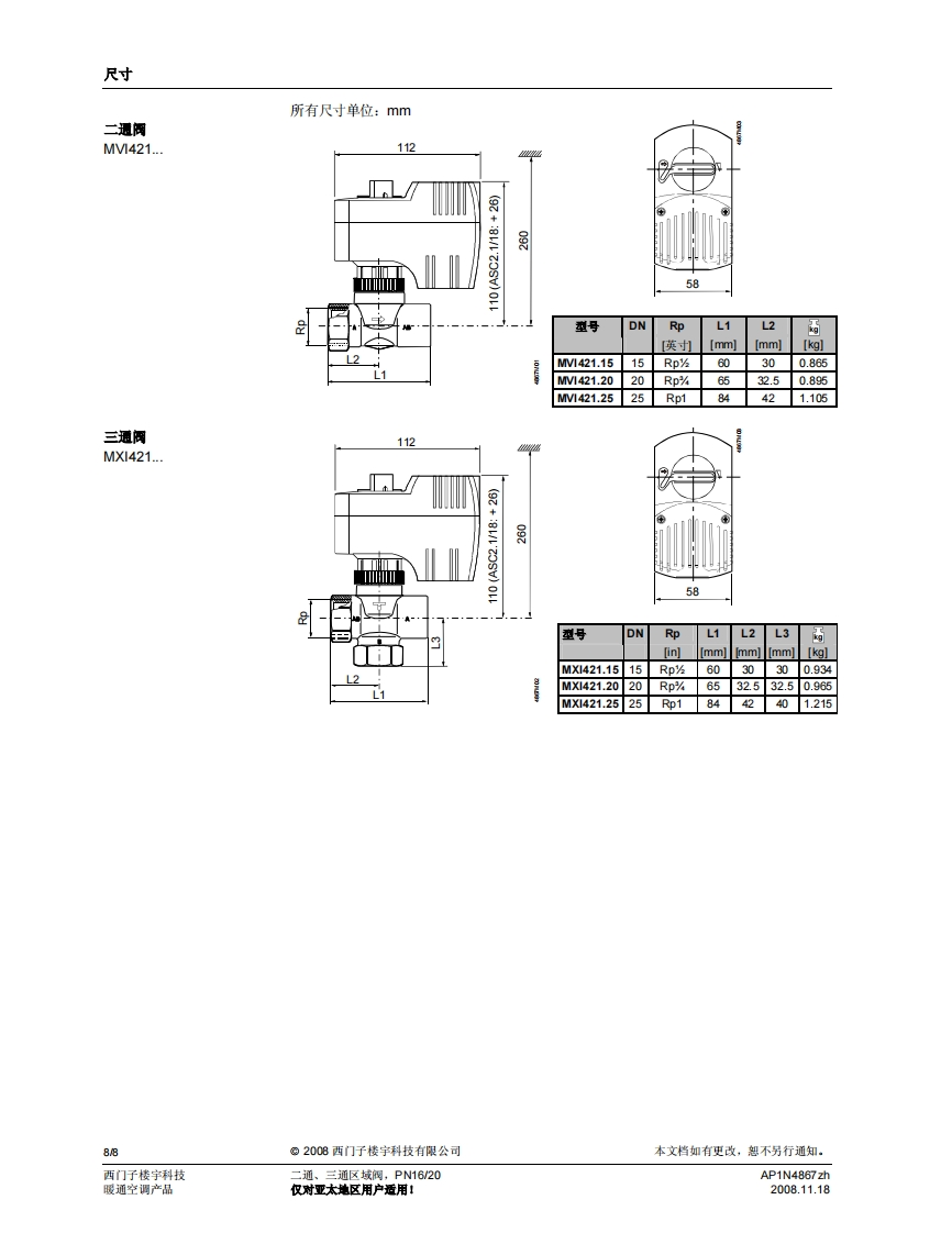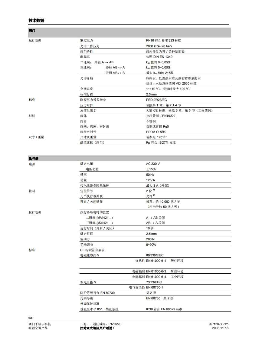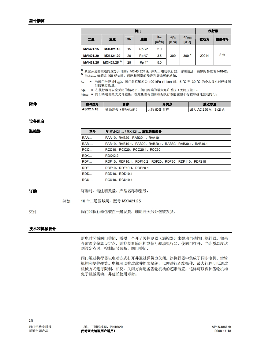 SIEMENS济南工达孔功24小时为您服务!www.cngdkj.com电话:18653198028QQ:1319331276西门子全国最大合作伙伴!二通阀MW1421.15至W1421.25三通阀MX1421.15至MX1421.25acvatix二通及三通区域阀,MV1421.PN16/20MXI421...最高耐压2000kPa工作电压AC230V,2位控制信号·弹簧复位·聚驱动力200N藕接螺母直接连接,无需任何工具符合人体工学设计的手动调节钮辅助开关,型号ASC2.118(可选)热压黄铜阀体(EN1982·DN15、DN20和DN25·ks=2-5m3h·内娜纹连接Rp..符合S07-1应用·在通风和空调系统中对闭式环路中水系统末端机组进行控制,例如,诱导器、风机盘管机组、小型再热器和小型冷却器,可以用于:-带有一个可加热或冷却的热交换器的两管制系统一带有两个单独加热和冷却的热交换器的四管制系统·用于闭环区域加热系统,例如:一建筑物不同的楼层-公寓一单独房间-地板加热AP1N4867zh仅对亚太地区用户适用!西门子楼字科技2008.11.18暖通空调产品