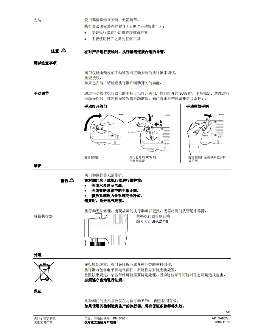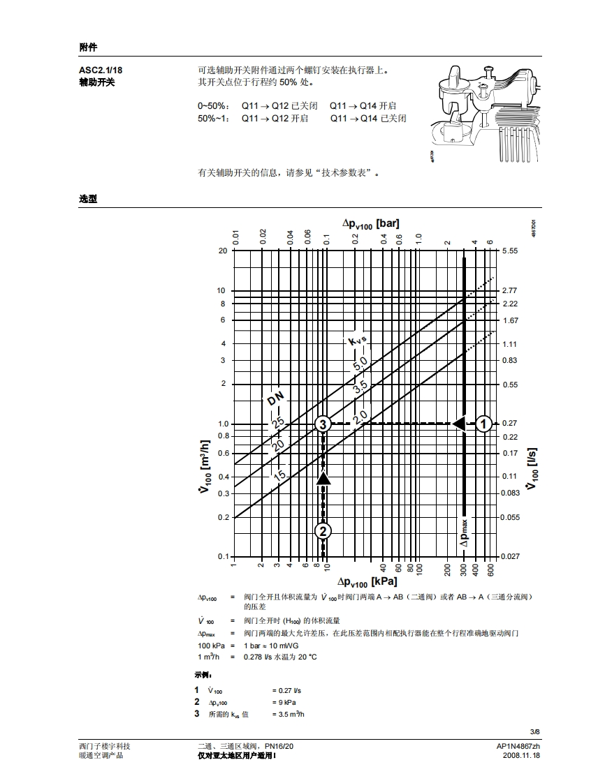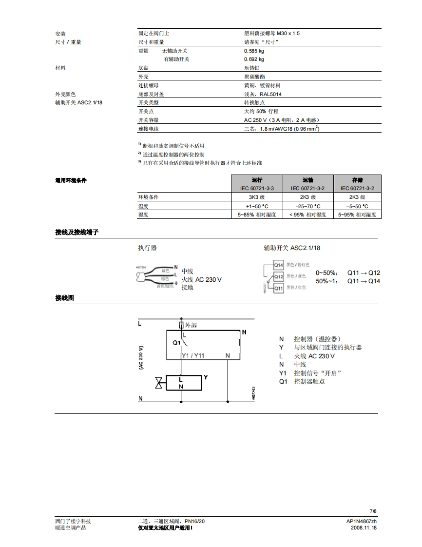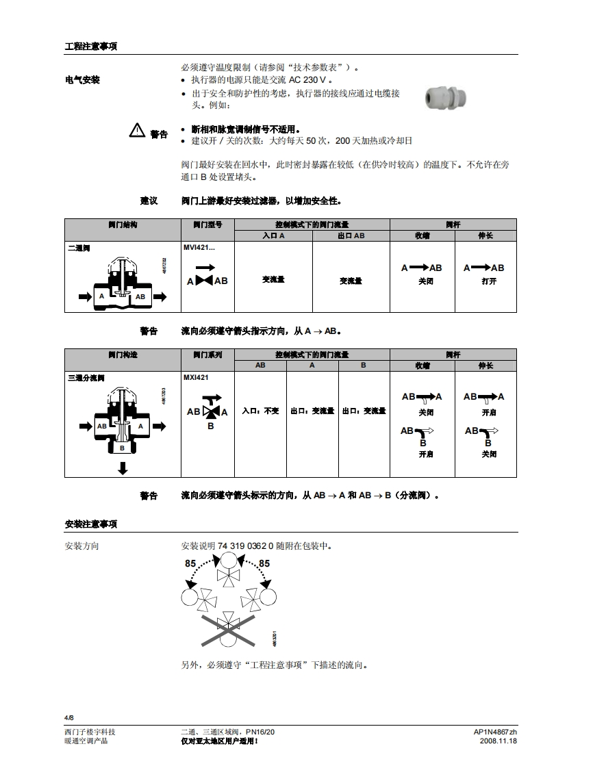 SIEMENS济南工达孔功24小时为您服务!www.cngdkj.com电话:18653198028QQ:1319331276西门子全国最大合作伙伴!二通阀MW1421.15至W1421.25三通阀MX1421.15至MX1421.25acvatix二通及三通区域阀,MV1421.PN16/20MXI421...最高耐压2000kPa工作电压AC230V,2位控制信号·弹簧复位·聚驱动力200N藕接螺母直接连接,无需任何工具符合人体工学设计的手动调节钮辅助开关,型号ASC2.118(可选)热压黄铜阀体(EN1982·DN15、DN20和DN25·ks=2-5m3h·内娜纹连接Rp..符合S07-1应用·在通风和空调系统中对闭式环路中水系统末端机组进行控制,例如,诱导器、风机盘管机组、小型再热器和小型冷却器,可以用于:-带有一个可加热或冷却的热交换器的两管制系统一带有两个单独加热和冷却的热交换器的四管制系统·用于闭环区域加热系统,例如:一建筑物不同的楼层-公寓一单独房间-地板加热AP1N4867zh仅对亚太地区用户适用!西门子楼字科技2008.11.18暖通空调产品