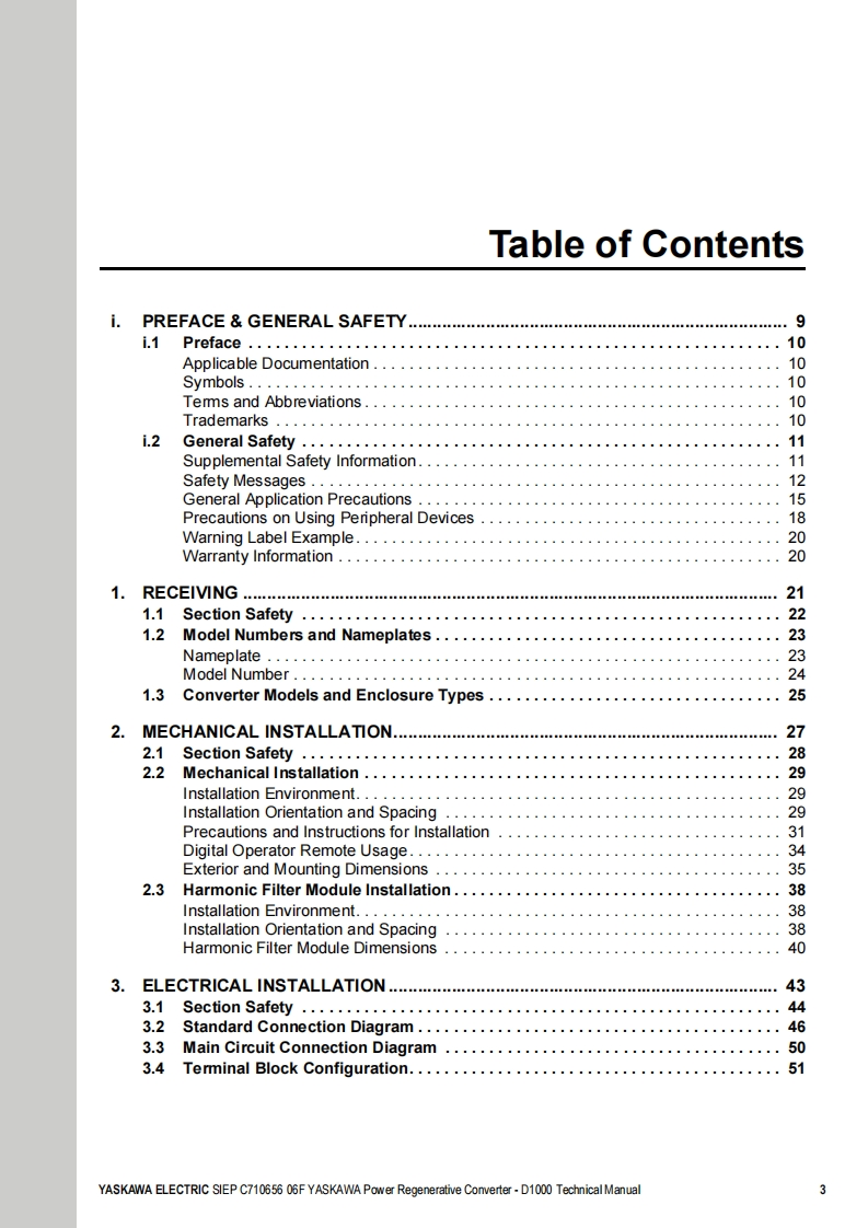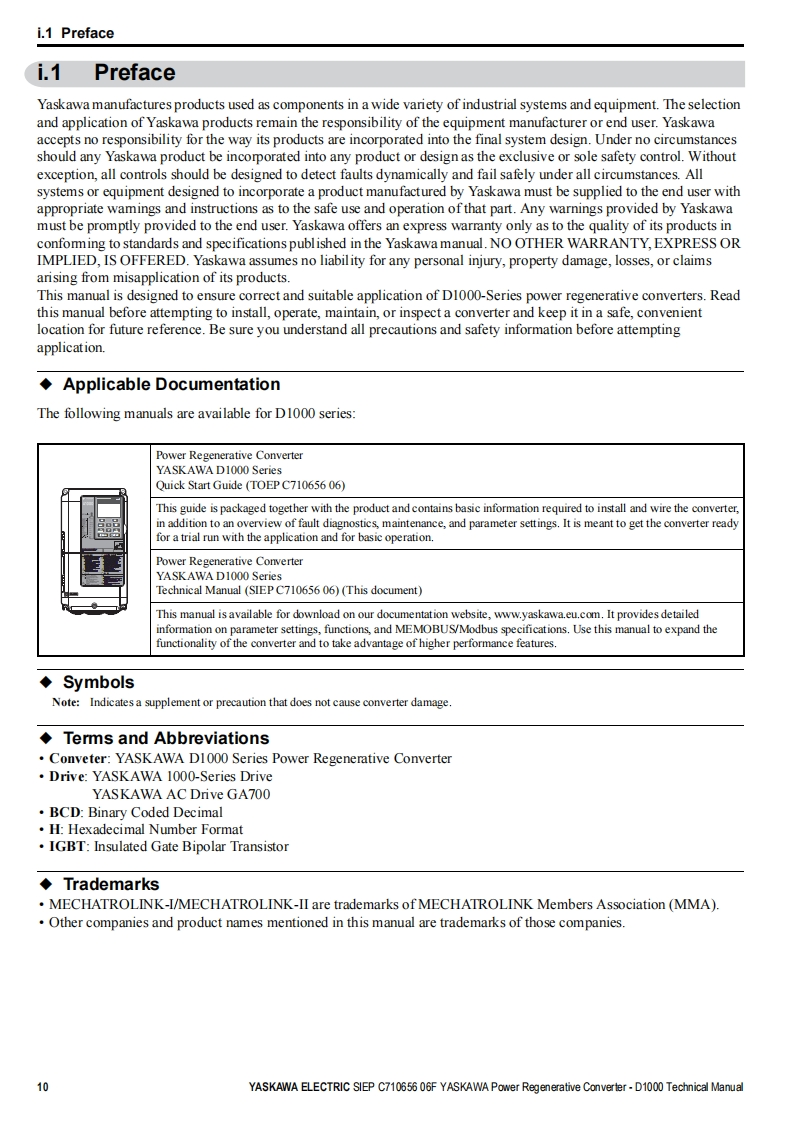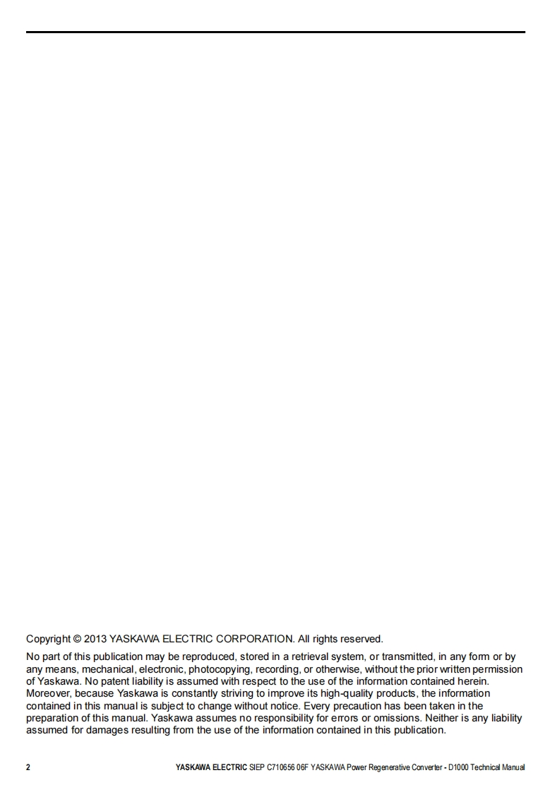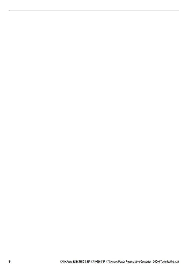 YASKAWAPower Regenerative ConverterYASKAWA D1000 SeriesTechnical ManualType:CIMR-DCModels:200 V Class,Three-Phase Input:5 to 130 kW400 V Class,Three-Phase Input:5 to 630 kWTo properly use the product,read this manual thoroughly and retainfor easy reference,inspection,and maintenance.Ensure the end userreceives this manual.ReceivingMechanical InstallationElectrical Installation3Start-Up Programming4OperationTroubles hooting5Periodic InspectionMaintenanceStandard Configuration Devices.Peripheral Devices,and OptionsSpecificationsParameter ListBME MO BUS/Mod busCommunicationsCMANUAL NO.SIEP C710656 06FStandards ComplianceD
