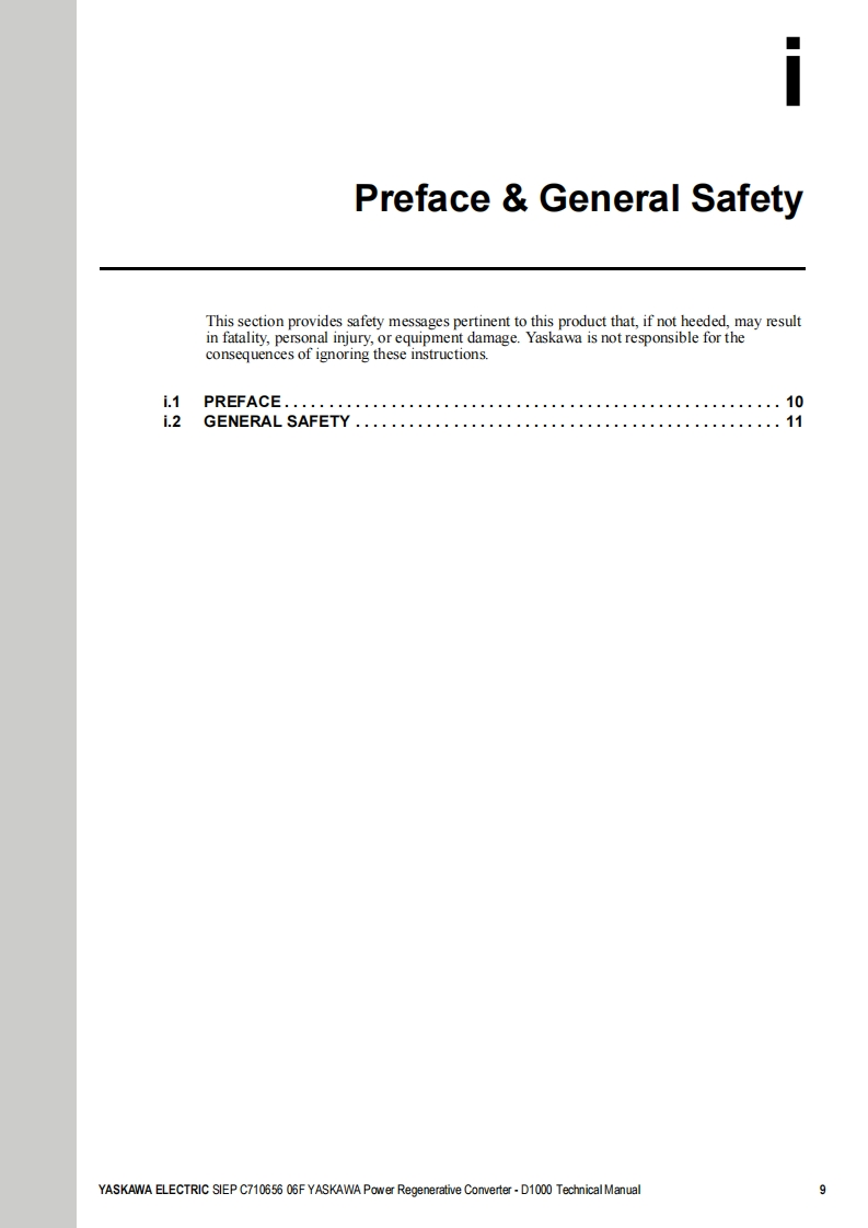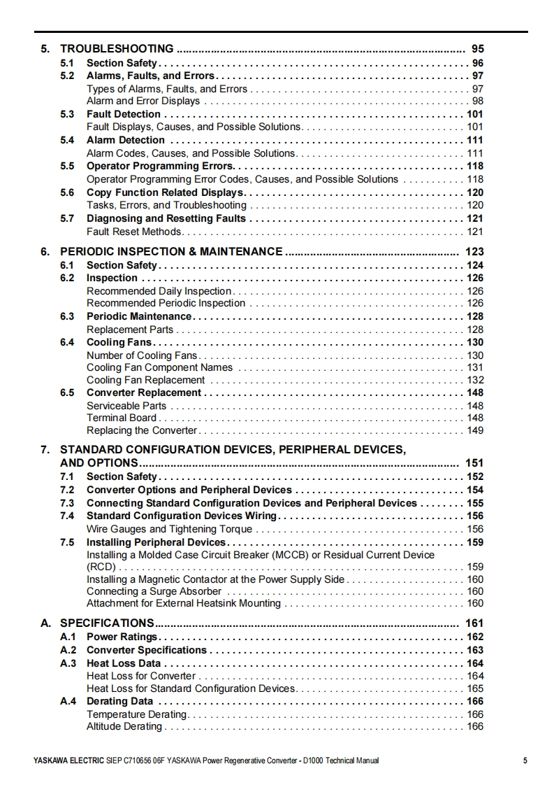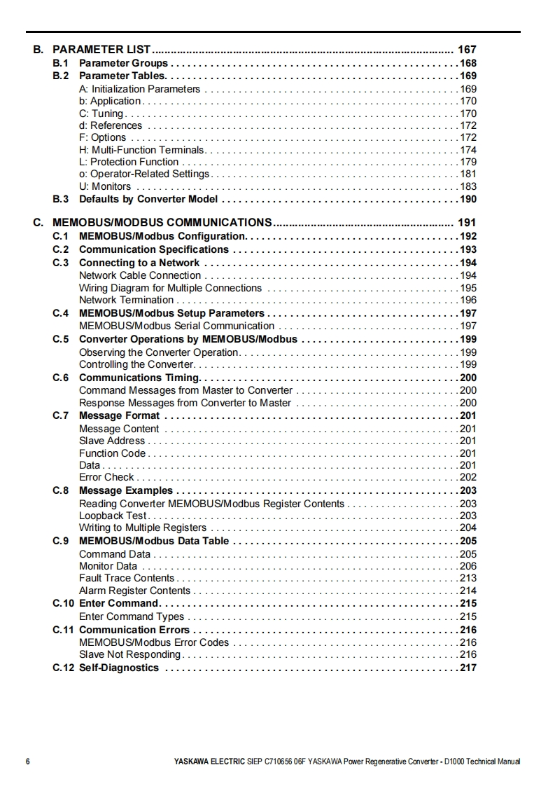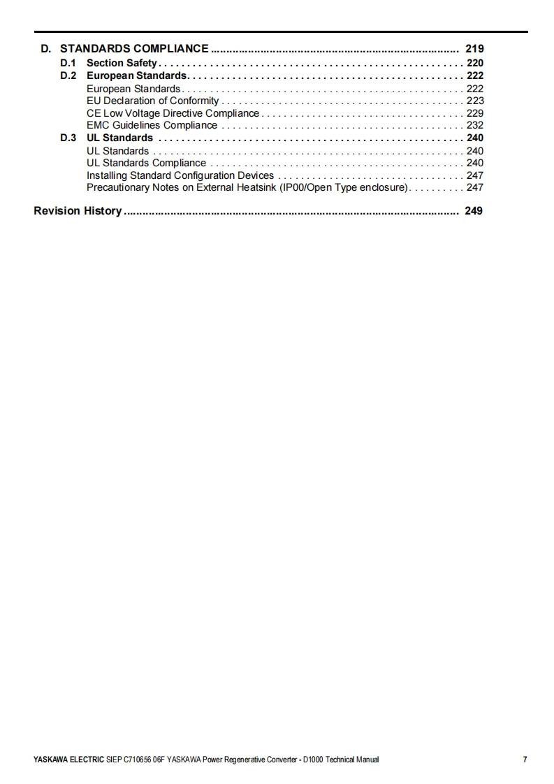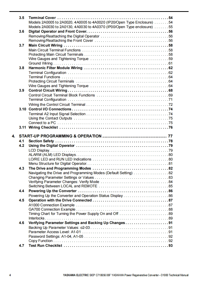 YASKAWAPower Regenerative ConverterYASKAWA D1000 SeriesTechnical ManualType:CIMR-DCModels:200 V Class,Three-Phase Input:5 to 130 kW400 V Class,Three-Phase Input:5 to 630 kWTo properly use the product,read this manual thoroughly and retainfor easy reference,inspection,and maintenance.Ensure the end userreceives this manual.ReceivingMechanical InstallationElectrical Installation3Start-Up Programming4OperationTroubles hooting5Periodic InspectionMaintenanceStandard Configuration Devices.Peripheral Devices,and OptionsSpecificationsParameter ListBME MO BUS/Mod busCommunicationsCMANUAL NO.SIEP C710656 06FStandards ComplianceD