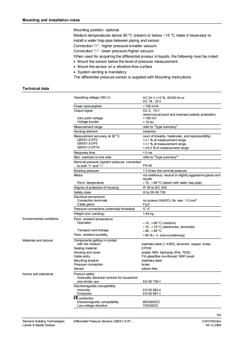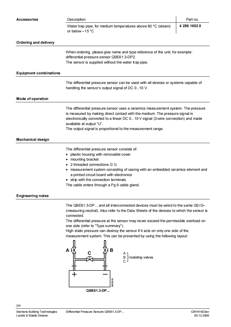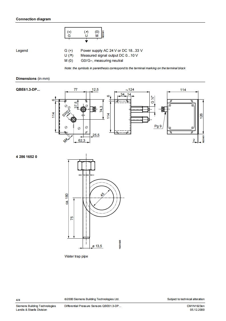 SIEMENS济南工达孔功24小时为您服务!www.cngdkj.com电话:18653198028QQ:1319331276西门子全国最大合作伙伴!6Differential pressuresensorsQBE61.3-DP...for neutral or slightly aggressive gases and liquidsOperating voltage AC 24 V or DC 18...33 V.Output signal DC 0...10 VConnecting male thread G%".3 versions covering a total differential pressure range of 0...10 barCeramics measurement systemHigh level of safety against overpressuresUseFor acquiring the differential pressures in HVAC plant.Suited for use with the following types of media:Neutral or slightly aggressive gasesNeutral or slightly aggressive heating water and cold water(with or without additives,such as hydrazine or glycol)Type summaryMeasurement rangeMax.overload on one sideNominalType referencebar][bar]pressure0.2±12PN 40QBE61.3-DP20.5±20PN40QBE61.3-DP50.10±20PN 40QBE61.3-DP10CM1N1923enSiemens Building Technologies05.12.2000Landis Staefa Division