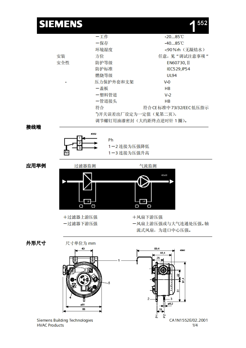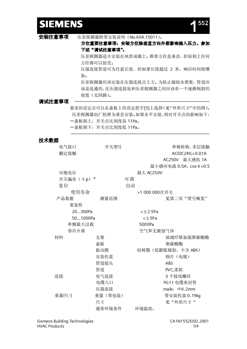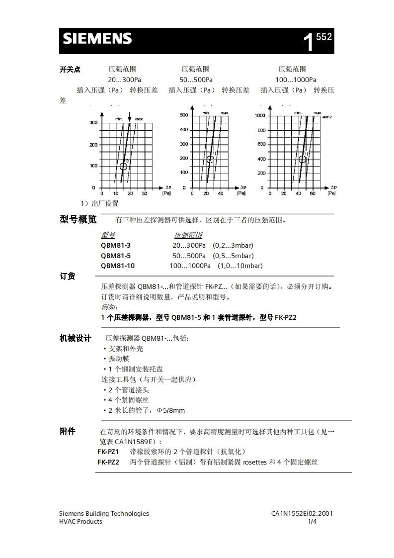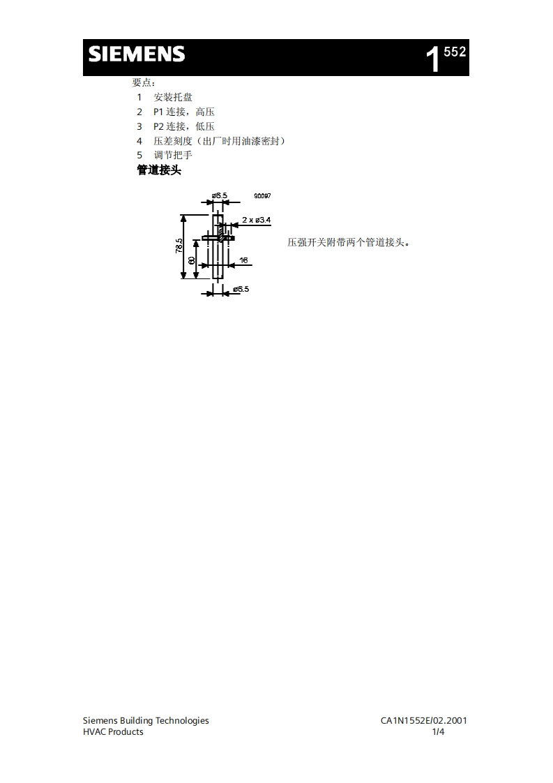济南工达孔功SIEMENS24小时为您服务!www.cngdkj.com电话:18653198028压差探测器QQ:1319331276用于监测空气压力西门子全国最大合作伙伴!适用于通风空调系统·用于监测空气过滤器,气流,风扇皮带·用于监测洁净室,厨房等压强·安装简便用途QBM81压差探测器用来监控通风空调系统中的压差,低压或过压。通过测量压差,监测空气过滤器,主导气流,被损坏皮带以及洁净室和厨房等房间的过压等。功能不同压强相连处产生的压差偏转弹性振动膜。这种特殊的隔膜确保了转换点长期的稳定性。每种型号都刻有适合高精度调节的单独刻度。可选调节功能见下页3幅图。功能图开关状态40EB阳5ASiemens Building TechnologiesCA1N1552E/02.2001HVAC Products1/4