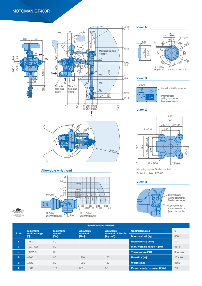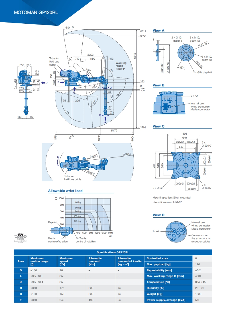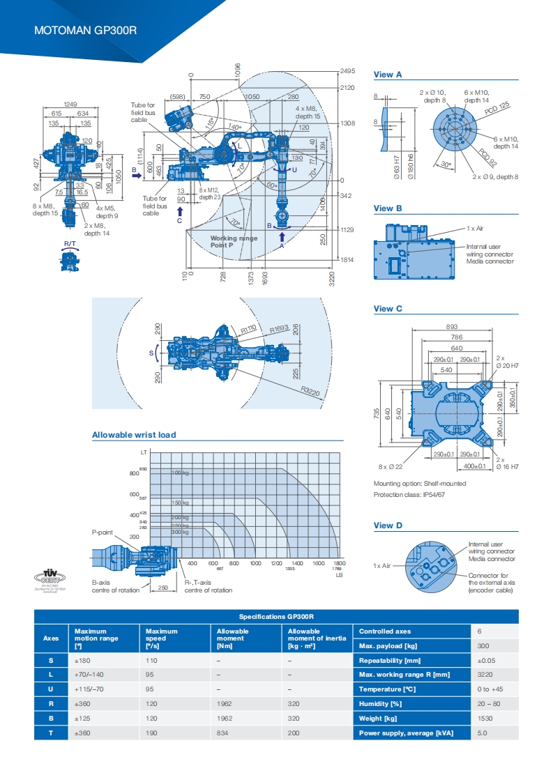 YASKAWAVMOT○ANGP-Shelftype-seriesHandling General Applicationswith the Shelftype GP-seriesMOTOMAN GP120RL,GP165R,GP200R,GP300R,GP400R and GP400R-A10The flexible MOTOMAN GP120RL.GP165R.GP200R.GP300R.GP400R and GP400R-A10 are 6-axis shelf-mounted robotsDue to this higher position they are able to unload work piecesfrom above.This saves precious floor space and ensures thatKEY BENEFITSthe space required for tool changing is kept free.Furthermorethe internal cable routing extends the service life of the robotsFlexible and powerful (120-400 kg payload)increases safety and reduces cycle times.These robots offerMinimum space requirementshigh productivity,reliability and maximum performance in the。Shef-mounted:areas of handling,machine tending and press brake tending.-Extended working rangeSimple gripping of componentsThe GP-Shelftype-series are controlled by the compact highPossibility of mounting on machineperformance MOTOMAN YRC1000 controller.It is availablewith the optional Functional Safety Unit (FSU)that offers awide range of new safety functions.YASKAWAMOTOMAN GP165RControlled byYRC1000www.yaskawa.eu
