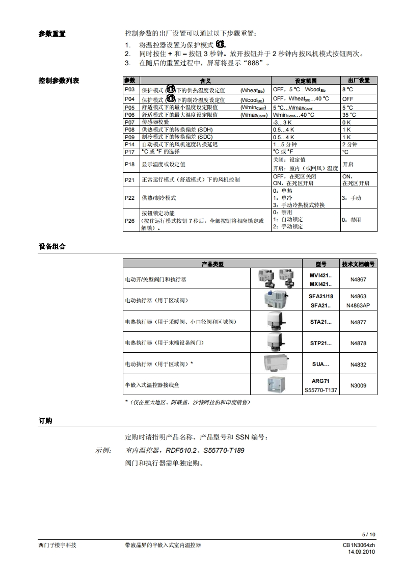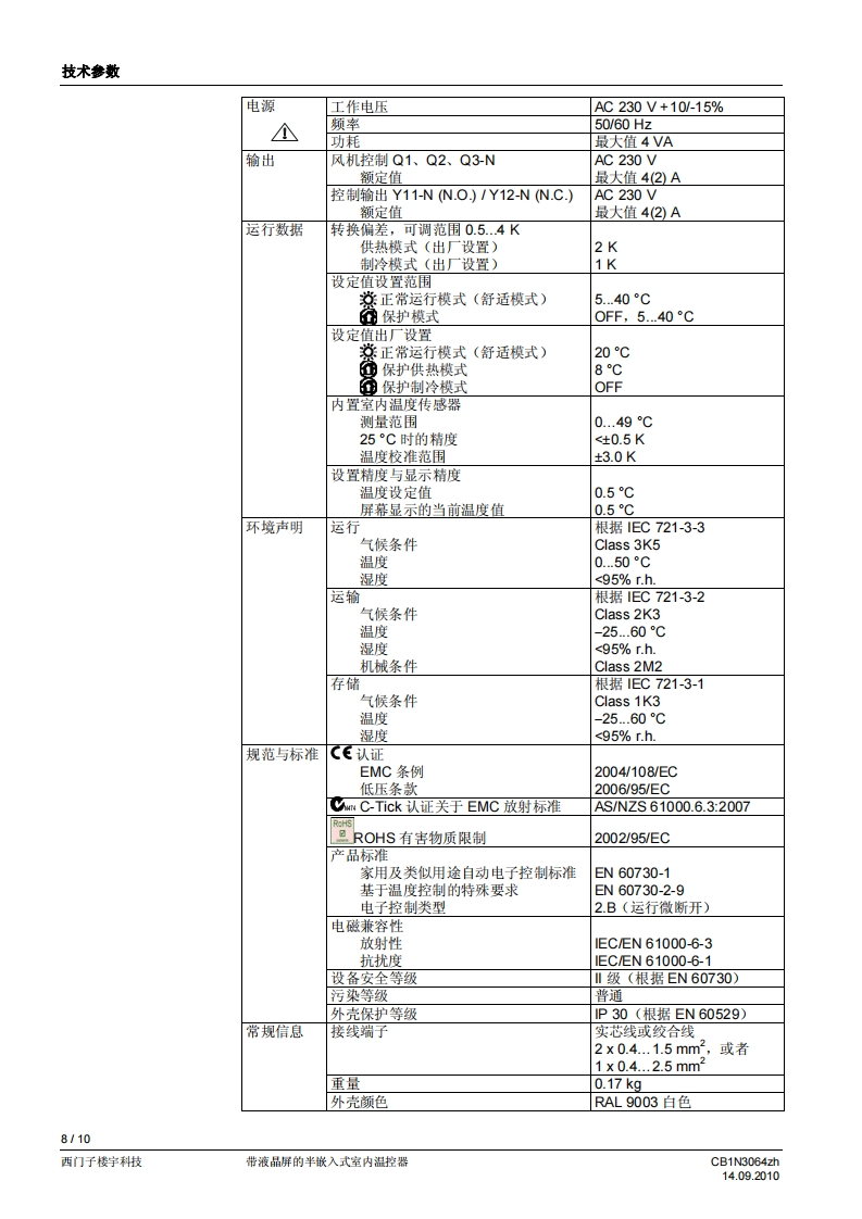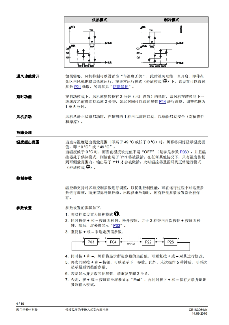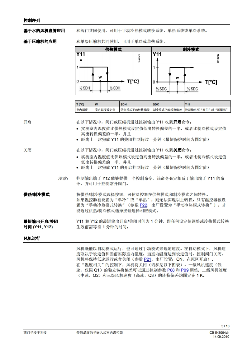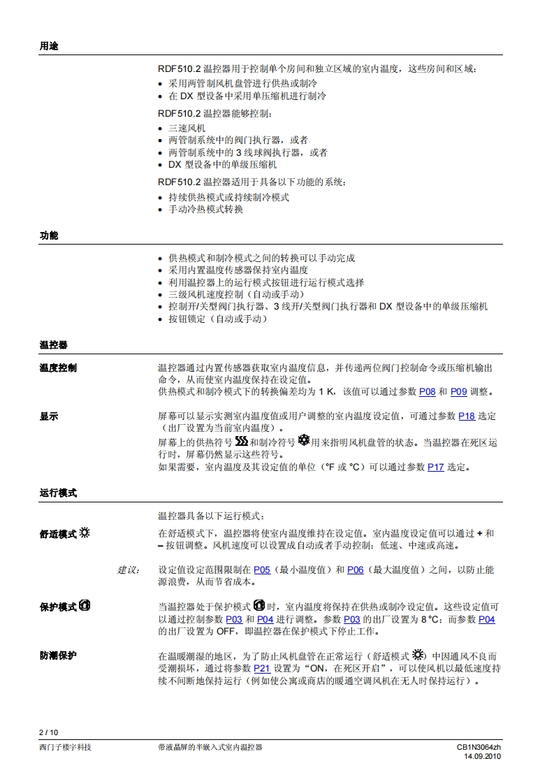 西门子房间温控器RDF510-2找手册网29天前发布关注私信0.24MB10页050西门子房间温控器RDF510-2此内容为付费资源,请付费后查看¥19¥21黄金会员免费钻石会员免费登录购买付费资源 第1页 / 共10页 第2页 / 共10页 第3页 / 共10页 第4页 / 共10页 第5页 / 共10页 第6页 / 共10页 第7页 / 共10页 第8页 / 共10页 第9页 / 共10页 第10页 / 共10页 已完成全部阅读,共10页 THE END西门子 文本预览 济南工达孔功SIEMENS24小时为您服务!www.cngdkj.com电话:18653198028QQ:1319331276西门子全国最大合作伙伴!带液晶显示的嵌入式室内温控器RDF510.2用于两管制风机盘管系统,并可在DX型设备中与压缩机共同使用·控制开刊关型阀门执行器、3线开/关型阀门执行器和DX型设各中的单级压缩机·三速风机控制:自动或手动。手动冷热模式转换或持续保持在单冷或单热模式。运行模式:舒适模式和保护模式·可调的调试参数和控制参数·可以选择显示室内温度或室内温度设定值·最小和最大温度设定限值·以0.5℃或1℉为步长显示温度值·工作电压:AC230V·86盒安装CB1N3064zh14.09.2010西门子楼宇科技 查看更多 收起部分 喜欢就支持一下吧收藏