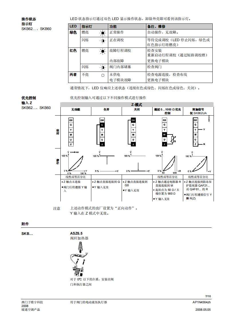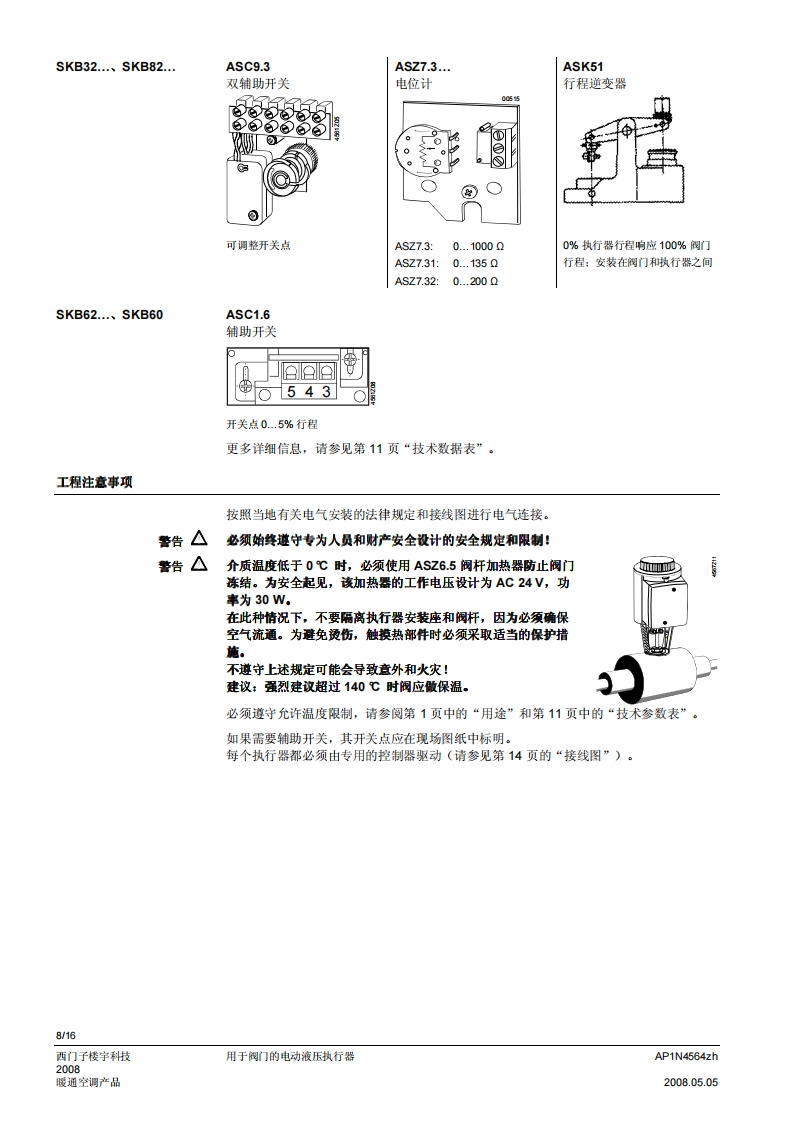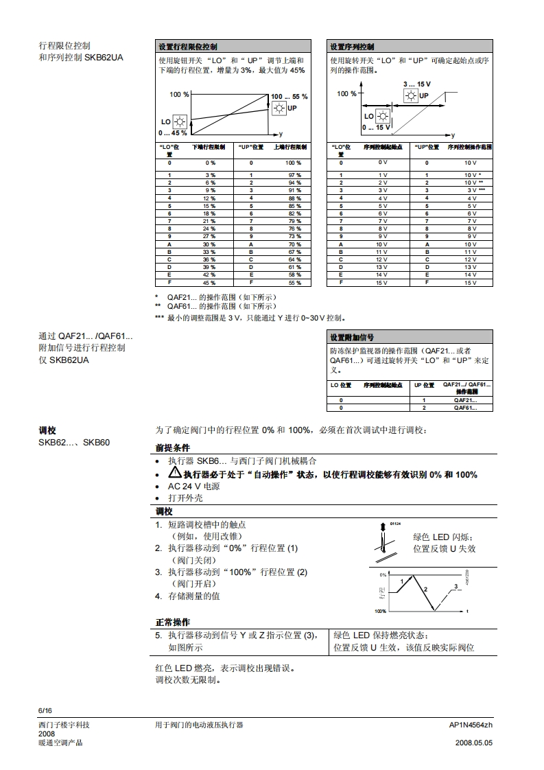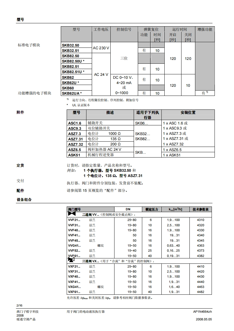 SIEMENS济南工达孔功24小时为您服务!www.cngdkj.com电话:18653198028QQ:1319331276西门子全国最大合作伙伴!acvatix用于阀门的电动液压执行器SKB32...20mm行程SKB82...SKB62...SKB60·SKB32.工作电压AC230V,三位控制信号·SKB82.工作电压AC24V,三位控制信号·SKB6..工作电压AC24V控制信号DC0-10V、4-20mA或者0-1000Q·SKB6.…具有流量特性选择、位置反馈、行程调校、LED状态指示灯、优先控制功能·SKB62UA具有以下功能:运行方向选择、行程限位控制、带可调节起点和动作范围的序列控制、根据防冻保护监视器QAF21.和QAF61.信号动作·驱动力2800N·执行器型号(带或不带弹簧复位功能)·直接安装在阀门上:无需调节·手动调节和阀位指示器·可选功能:辅助开关、电位计、阀杆加热器和机械行程逆变器·SKB.U已通过UL认证用途用于西门子二通阀和三通阀WF.、VVG和VXF.系列型号的阀门执行器,驱动行程为20m,应用于暖通空调系统中的控制阀和安全截止阀。AP1N4564zh西门子楼宇科技2008.05.05暖通空调产品