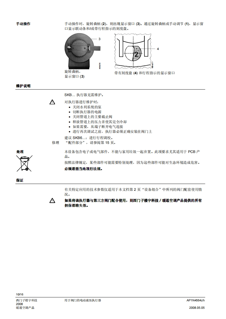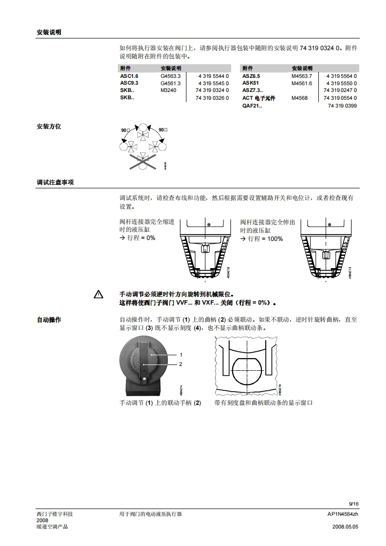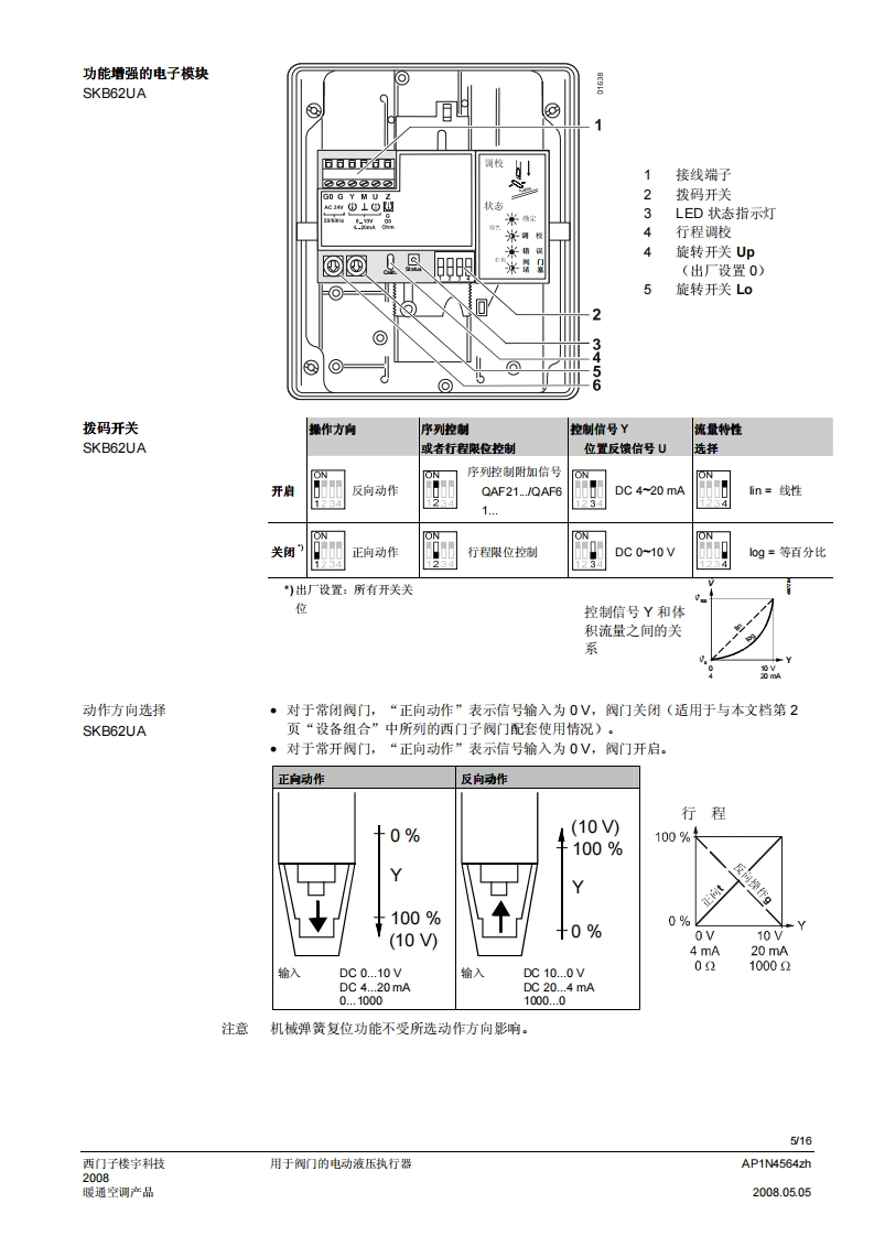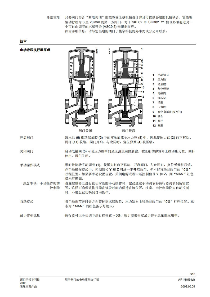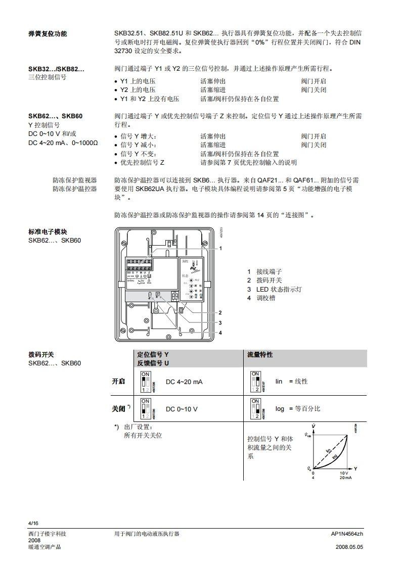 SIEMENS济南工达孔功24小时为您服务!www.cngdkj.com电话:18653198028QQ:1319331276西门子全国最大合作伙伴!acvatix用于阀门的电动液压执行器SKB32...20mm行程SKB82...SKB62...SKB60·SKB32.工作电压AC230V,三位控制信号·SKB82.工作电压AC24V,三位控制信号·SKB6..工作电压AC24V控制信号DC0-10V、4-20mA或者0-1000Q·SKB6.…具有流量特性选择、位置反馈、行程调校、LED状态指示灯、优先控制功能·SKB62UA具有以下功能:运行方向选择、行程限位控制、带可调节起点和动作范围的序列控制、根据防冻保护监视器QAF21.和QAF61.信号动作·驱动力2800N·执行器型号(带或不带弹簧复位功能)·直接安装在阀门上:无需调节·手动调节和阀位指示器·可选功能:辅助开关、电位计、阀杆加热器和机械行程逆变器·SKB.U已通过UL认证用途用于西门子二通阀和三通阀WF.、VVG和VXF.系列型号的阀门执行器,驱动行程为20m,应用于暖通空调系统中的控制阀和安全截止阀。AP1N4564zh西门子楼宇科技2008.05.05暖通空调产品
