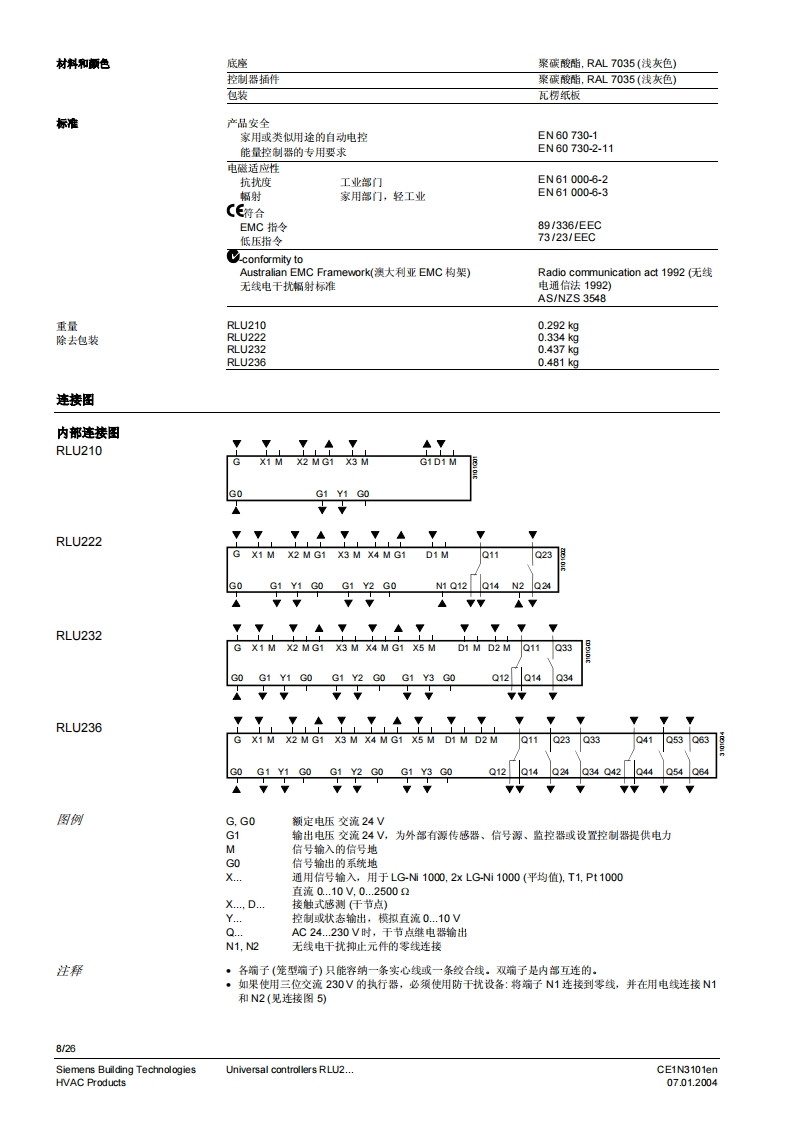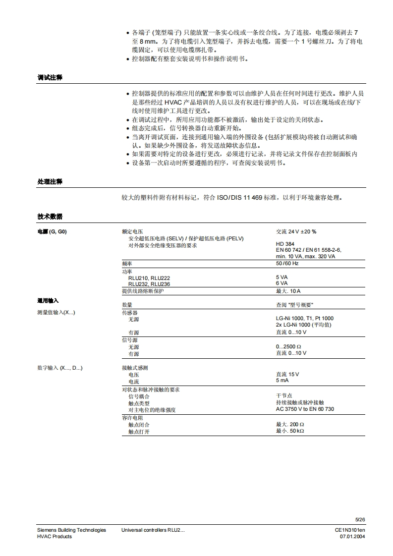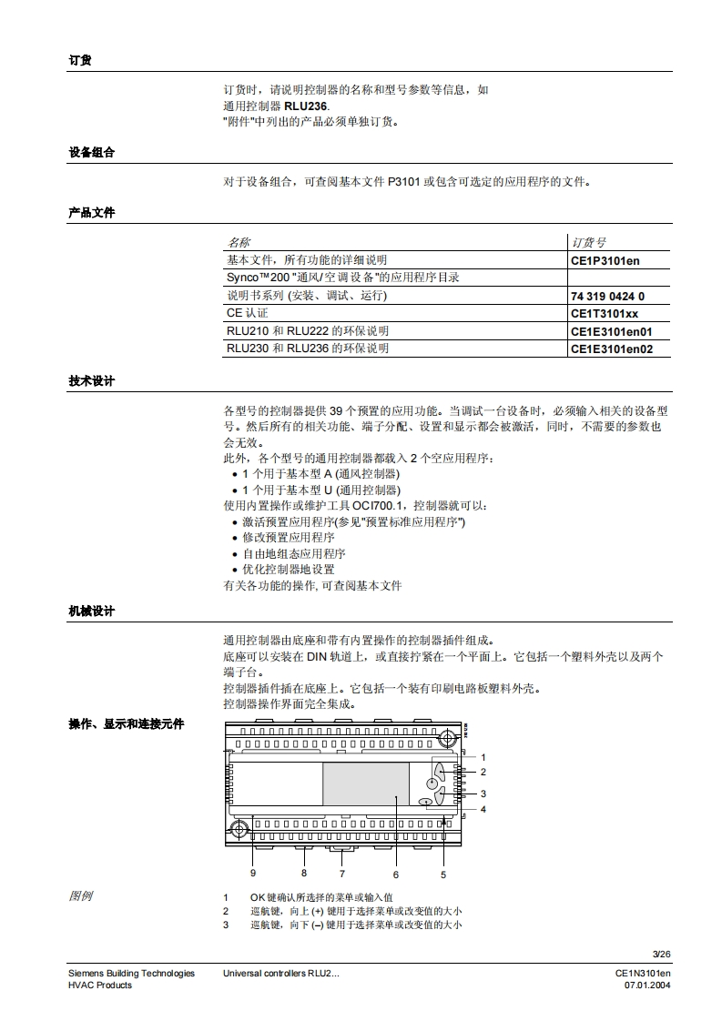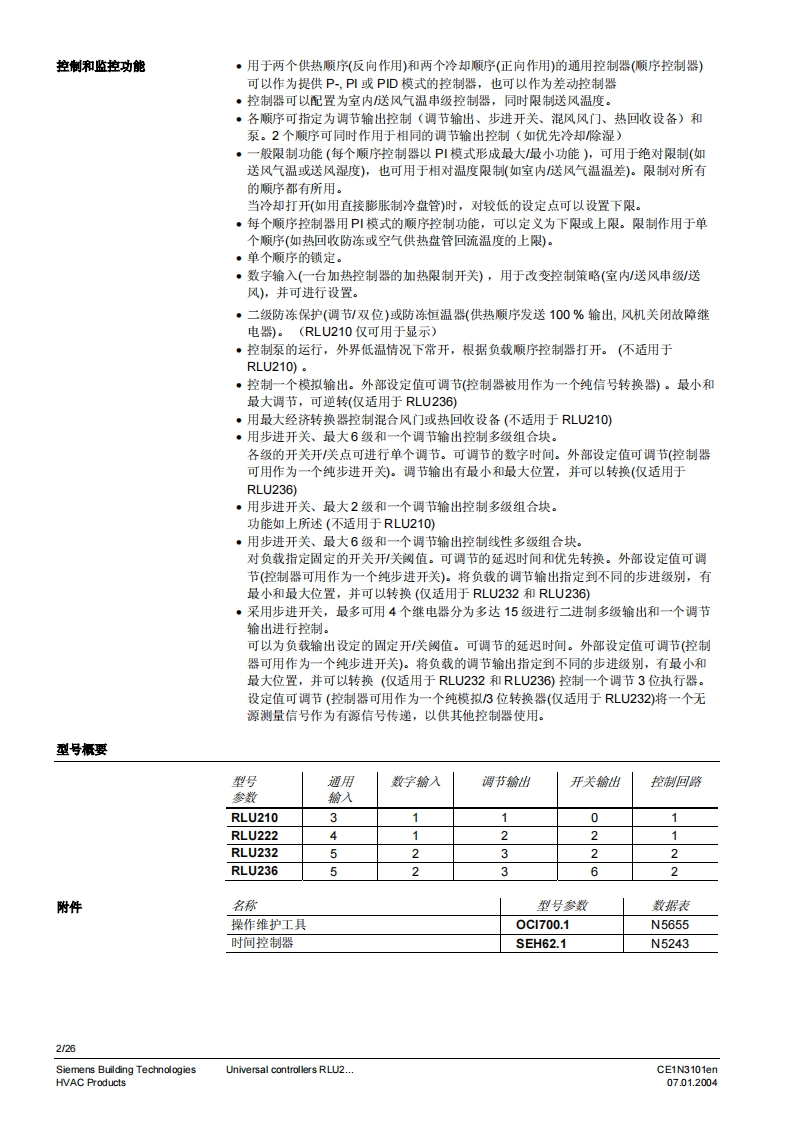 SIEMENS济南工达孔功24小时为您服务!www.cngdkj.com电话:18653198028QQ:1319331276西门子全国最大合作伙伴!iiliil i l iil i i iH11111111113111111SyncoTM 200通用控制器RLU2...·带有预置的标准应用·自由编程的控制器,以适用于相关型号的设备·P-,PL,或PID模式·菜单驱动操作用途用于从基本到复杂的通风、空调和制冷设备。通用控制器用于处理以下控制变量:温度、相对绝对湿度、压力压力差、气流、室内空气质量和焓值。功能操作模式·通过状态输入选择运行模式:舒适、经济、保护·显示当前运行模式(舒适、经济、保护)设定点·带有各自的顺序控制器:独立可调节的加热和冷却设定点(或最大和最小设定点)用于舒适和经济模式·通过室内操作单元或设定点再调节器(无源)预定义室温设定点·用各种顺序控制器:用远程设定点调节器(有源或无源)预定义设定点·带夏季和或冬季补偿的室温设定点·用各种顺序控制器:设定点偏移取决于传感器信号、可选的起点和终点通用辙入通用输入:·不同测量值的无源或有源模拟输入信号(℃,%,一)·数字输入信号(无电压干节点)CE1N3101enSiemens Building Technologies07.01.2004HVAC Products