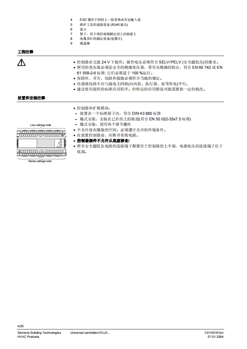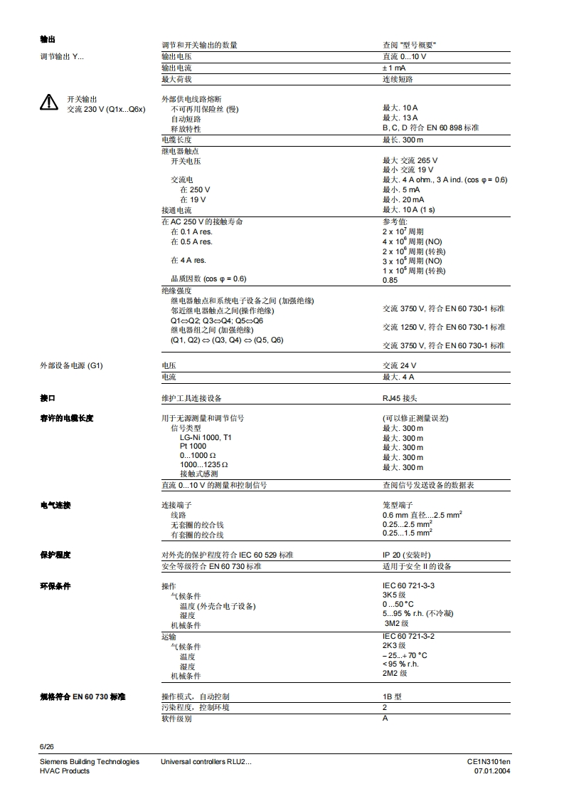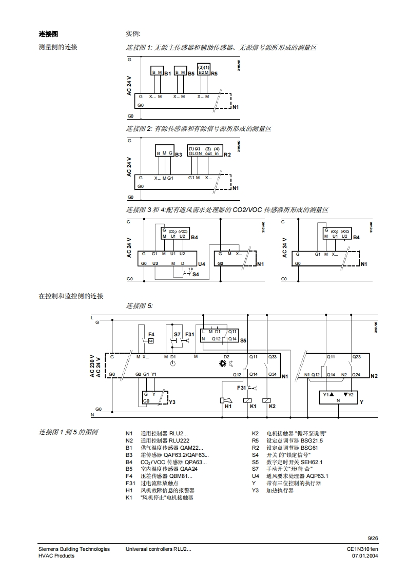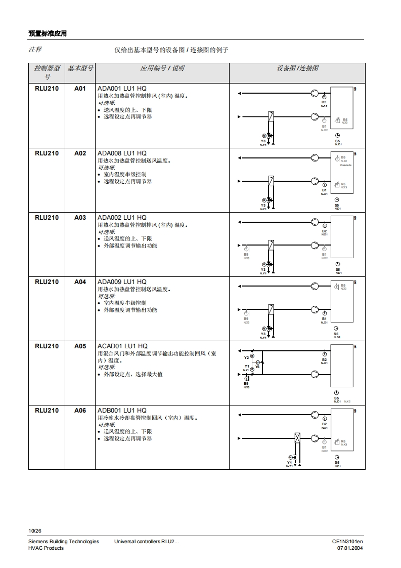 SIEMENS济南工达孔功24小时为您服务!www.cngdkj.com电话:18653198028QQ:1319331276西门子全国最大合作伙伴!iiliil i l iil i i iH11111111113111111SyncoTM 200通用控制器RLU2...·带有预置的标准应用·自由编程的控制器,以适用于相关型号的设备·P-,PL,或PID模式·菜单驱动操作用途用于从基本到复杂的通风、空调和制冷设备。通用控制器用于处理以下控制变量:温度、相对绝对湿度、压力压力差、气流、室内空气质量和焓值。功能操作模式·通过状态输入选择运行模式:舒适、经济、保护·显示当前运行模式(舒适、经济、保护)设定点·带有各自的顺序控制器:独立可调节的加热和冷却设定点(或最大和最小设定点)用于舒适和经济模式·通过室内操作单元或设定点再调节器(无源)预定义室温设定点·用各种顺序控制器:用远程设定点调节器(有源或无源)预定义设定点·带夏季和或冬季补偿的室温设定点·用各种顺序控制器:设定点偏移取决于传感器信号、可选的起点和终点通用辙入通用输入:·不同测量值的无源或有源模拟输入信号(℃,%,一)·数字输入信号(无电压干节点)CE1N3101enSiemens Building Technologies07.01.2004HVAC Products