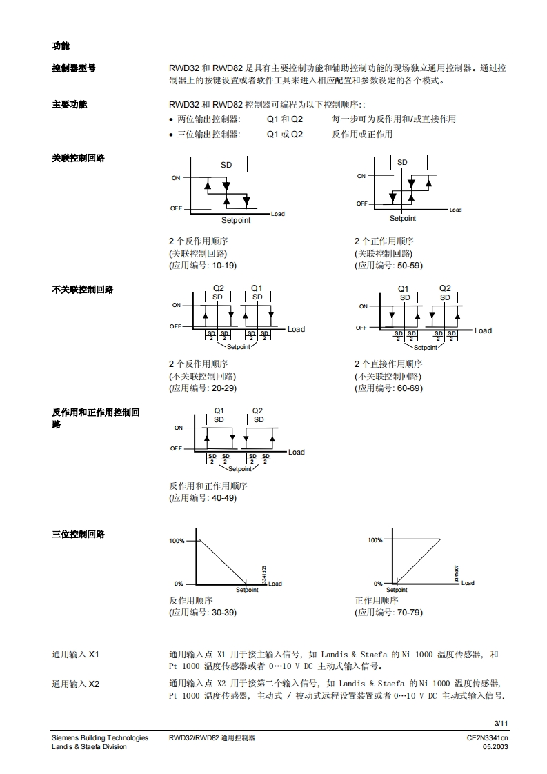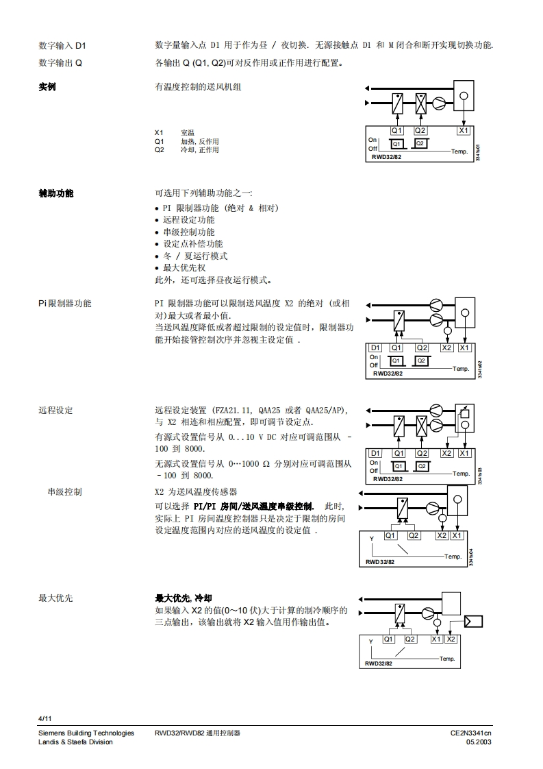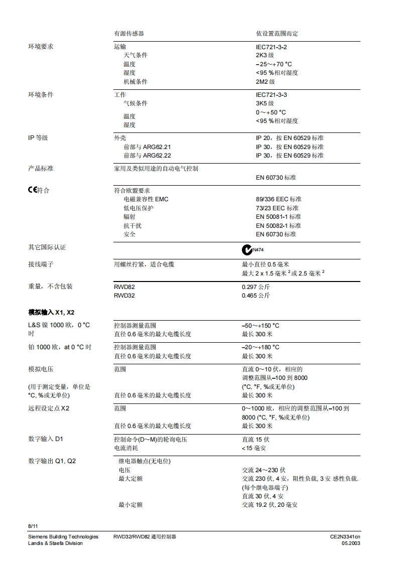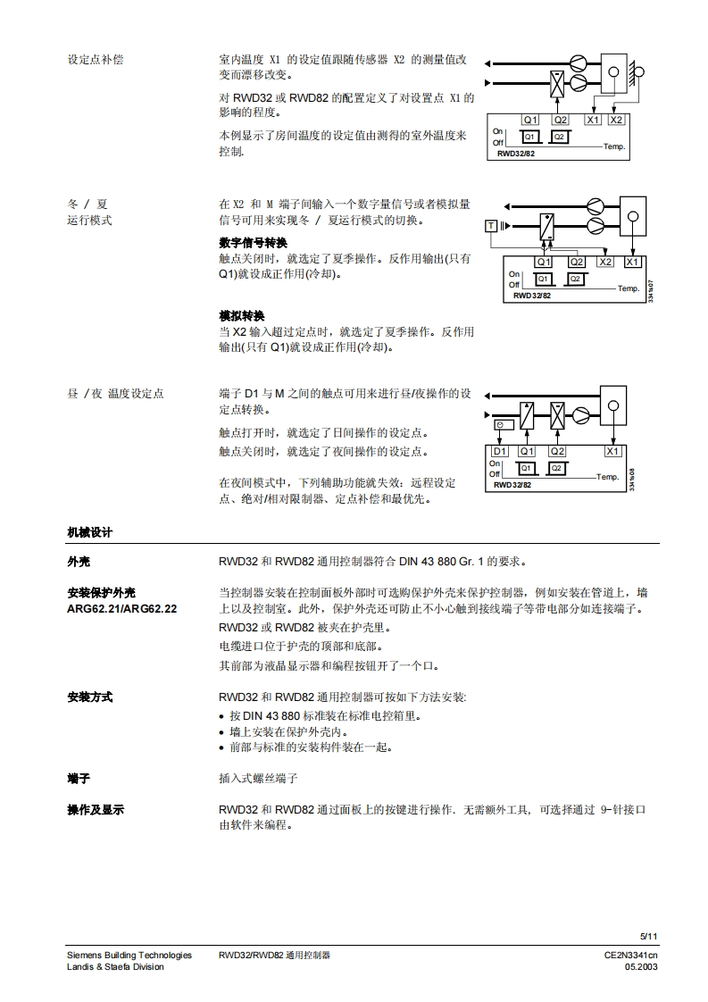 SIEMENS济南工达孔功24小时为您服务!www.cngdkj.com电话:18653198028QQ:1319331276西门子全国最大合作伙伴!RWD32RWD82RWD32通用控制器RWD82用于HWAC及制冷系统的舒适性控制·P及PI响应的独立电子式通用控制器·AC24V或220伏工作电压·可通过应用编号选择应用程序·主动式输入信号的输入值段可以选择设定·两个通用输入点用于Ni1000,Pt1000的电阻温度传感器和0…10V信号·单位可设置为。C,。F,%或者无指定单位·一个三位输出或两个数字输出,直接作用和反作用·一个日/夜转换的数字输入·无需额外工具即可通过控制器上的按键进入或者更改所有数据·与电脑连接用于通过软件下载预制应用程序用途通用控制器主要适用于HVAC系统及制冷系统的舒适性控制。可单独安装于控制盘中或者配上ARG62.21ARG6222盒安装在管道上,培上以及机房内暖通空调及制冷应用温度,相对湿度,绝对湿度,焓值,压差,流量及室内空气质量的测量和控制.输入值可以被设置为从-100单位至8,000单位.CE2N3341cnSiemens Building Technologies05.2003Landis Staefa Division