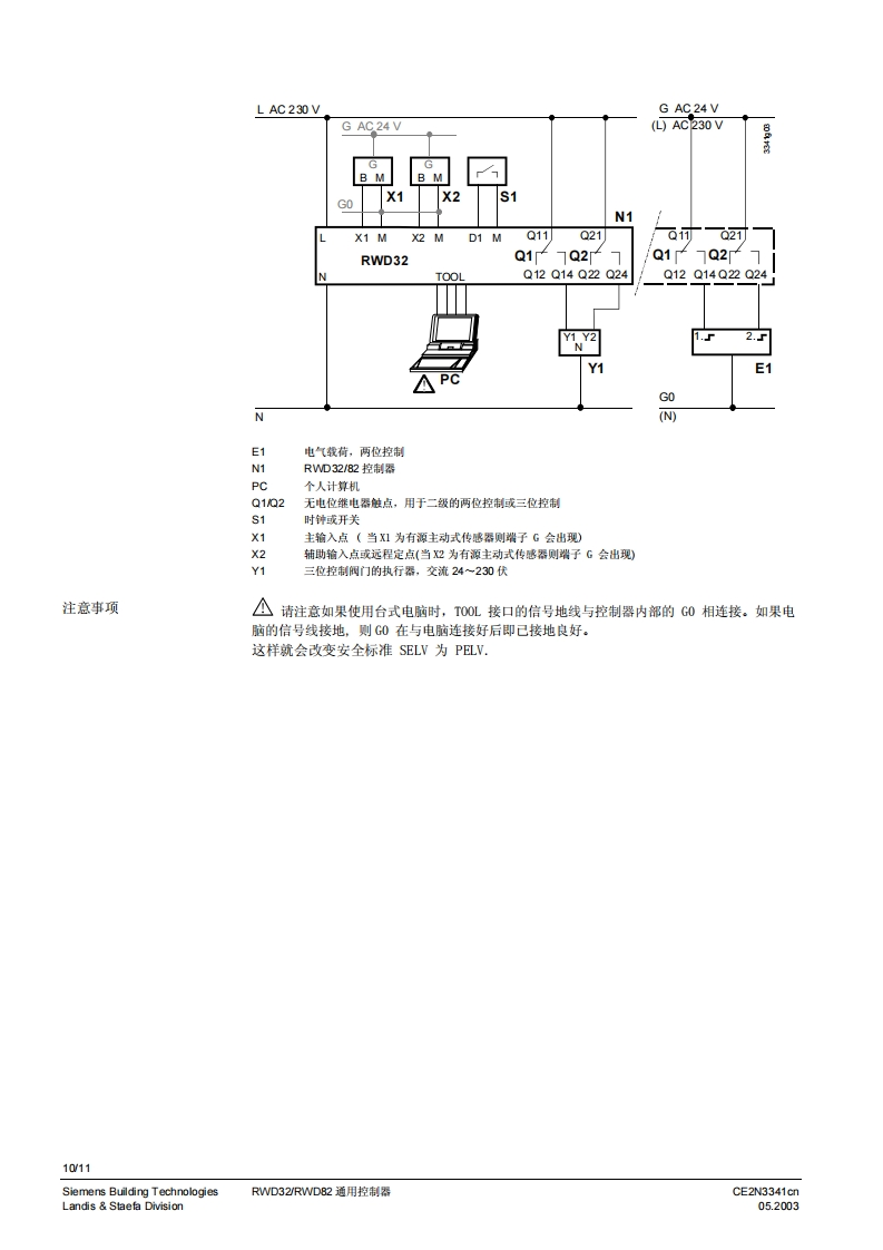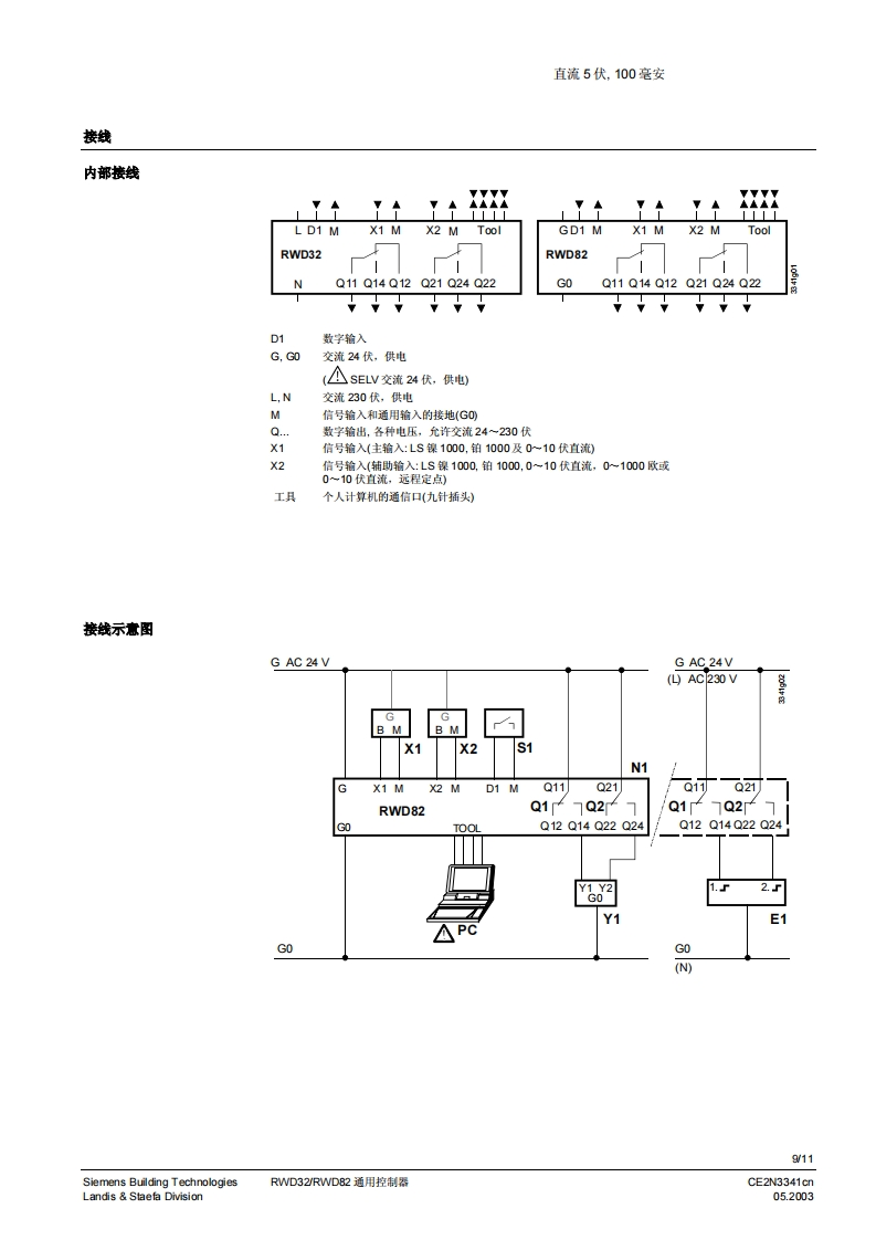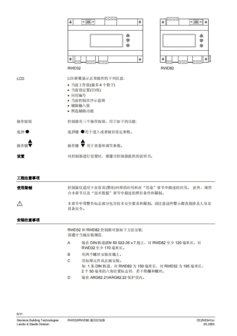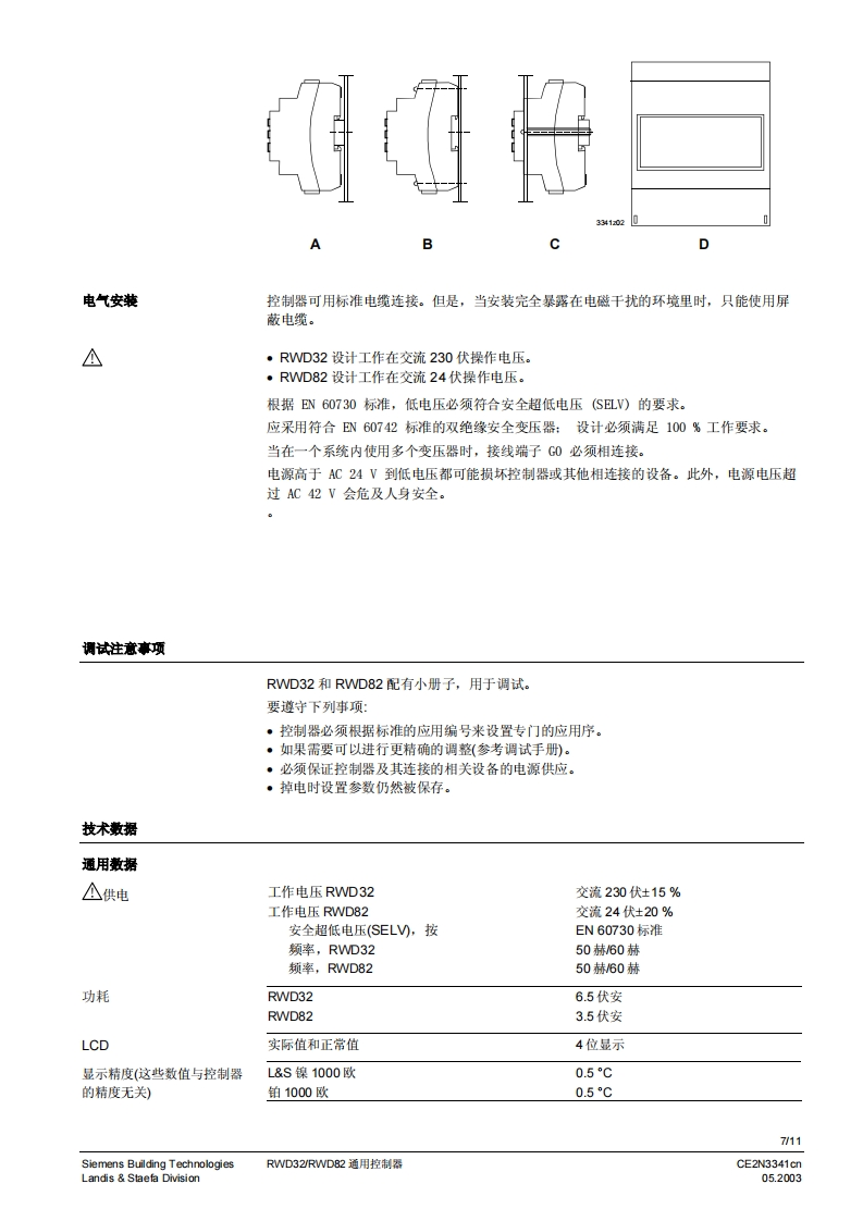 SIEMENS济南工达孔功24小时为您服务!www.cngdkj.com电话:18653198028QQ:1319331276西门子全国最大合作伙伴!RWD32RWD82RWD32通用控制器RWD82用于HWAC及制冷系统的舒适性控制·P及PI响应的独立电子式通用控制器·AC24V或220伏工作电压·可通过应用编号选择应用程序·主动式输入信号的输入值段可以选择设定·两个通用输入点用于Ni1000,Pt1000的电阻温度传感器和0…10V信号·单位可设置为。C,。F,%或者无指定单位·一个三位输出或两个数字输出,直接作用和反作用·一个日/夜转换的数字输入·无需额外工具即可通过控制器上的按键进入或者更改所有数据·与电脑连接用于通过软件下载预制应用程序用途通用控制器主要适用于HVAC系统及制冷系统的舒适性控制。可单独安装于控制盘中或者配上ARG62.21ARG6222盒安装在管道上,培上以及机房内暖通空调及制冷应用温度,相对湿度,绝对湿度,焓值,压差,流量及室内空气质量的测量和控制.输入值可以被设置为从-100单位至8,000单位.CE2N3341cnSiemens Building Technologies05.2003Landis Staefa Division