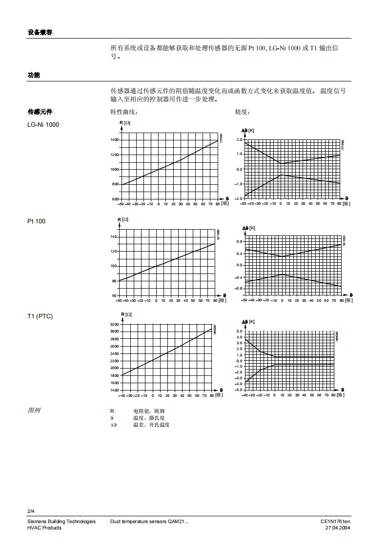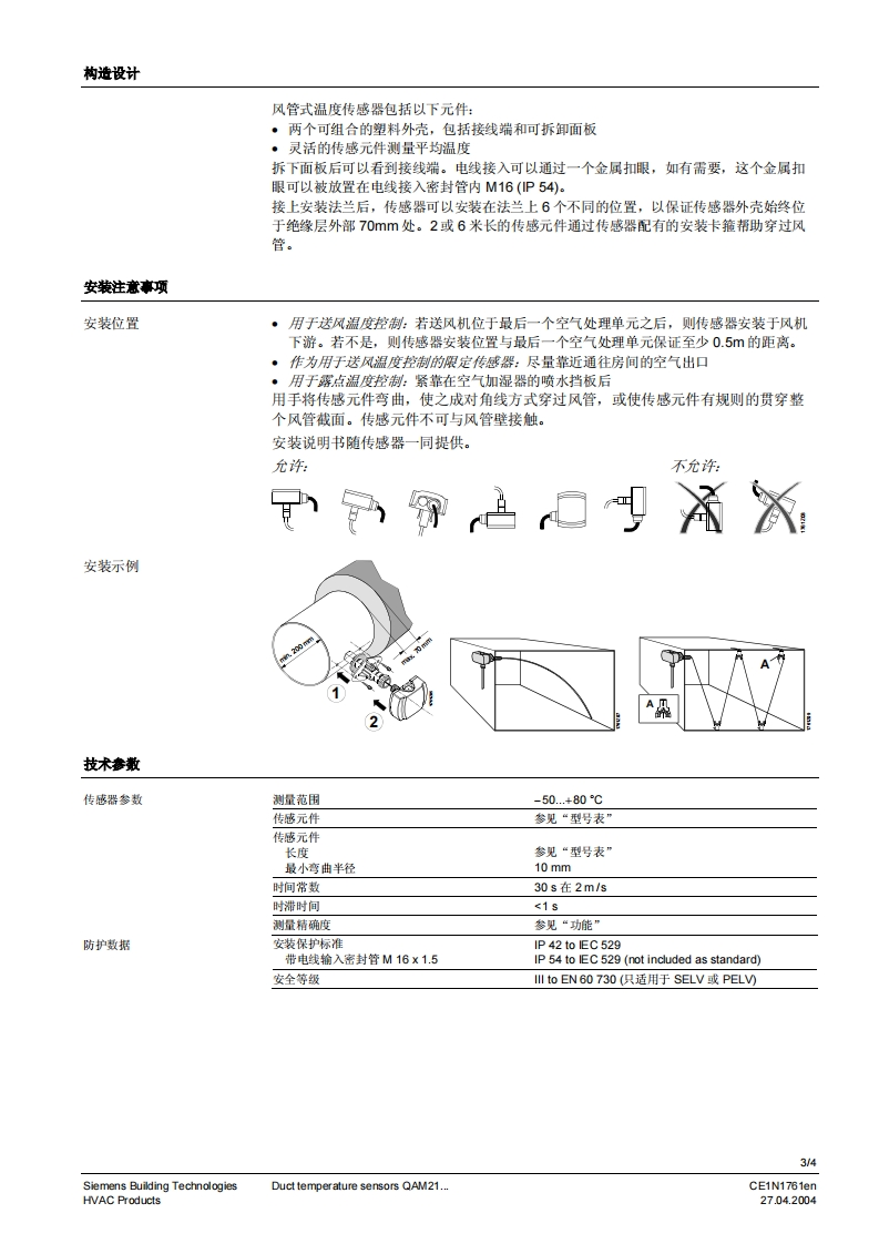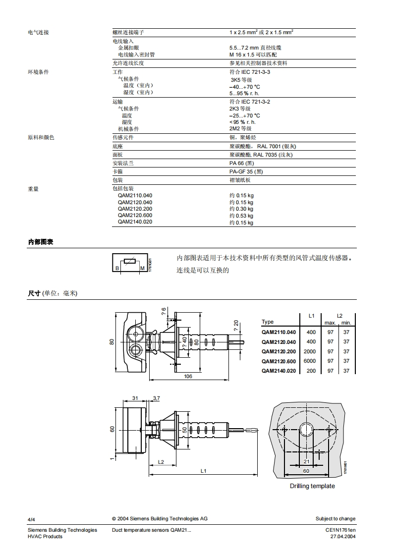 SIEMENS济南工达孔功24小时为您服务!www.cngdkj.com电话:18653198028QQ:1319331276西门子全国最大合作伙伴!SIEMENSSIEMENSw12020安装AQM33.0QA2110.040.QAM2120.040QAW2120.200,QAM2120.600SymaroTM风管式温度传感器QAM21...采集风管内空气温度的无源传感器用逢风管式温度传感器用于通风及空调设备中的以下用途:·送风或排风温度传感器·限定传感器,例如最低送风温度的设定·参考传感器,例如房间设定温度随室外温度变化而按一定函数关系转换·露点温度传感器·测量传感器,例如用于测量值的显示或者配套楼宇自控系统使用型号型号传感元件长度安装卡箍传感元件QAM2110.0400.4m无Pt100QAM2120.0400.4m无LG-Ni 1000QAM2120.2002.0m4个LG-Ni 1000QAM2120.6006.0m6个LG-Ni 1000QAM2140.0200.2m无T1(PTC)订费和交货订货时,请注明产品名称及型号,例如:风管式温度传感器QAM2120.040同时提供与传感器配套的安装法兰AQM63.0,如果需要,也可提供安装卡箍。如果单独订购安装卡箍,请用型号AQM63.3(6个)。CE1N1761enSiemens Building Technologies27.04.2004HVAC Products
