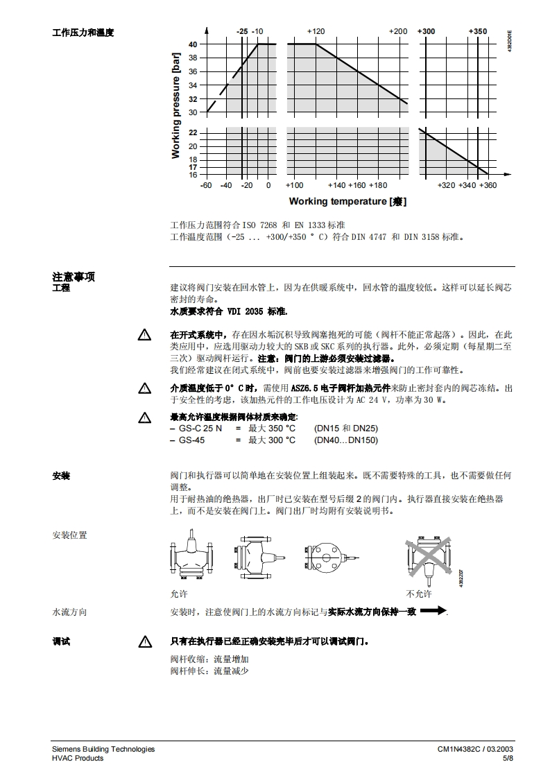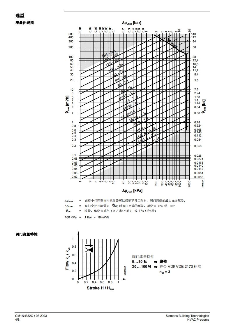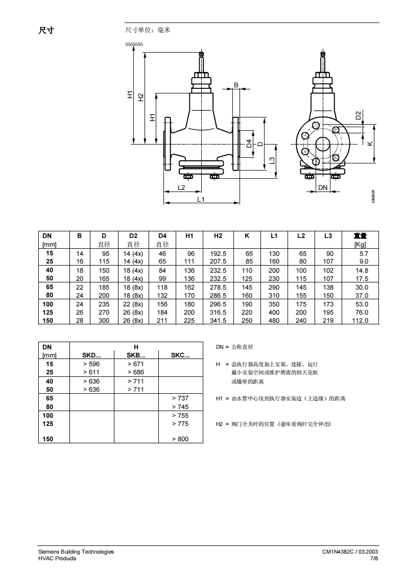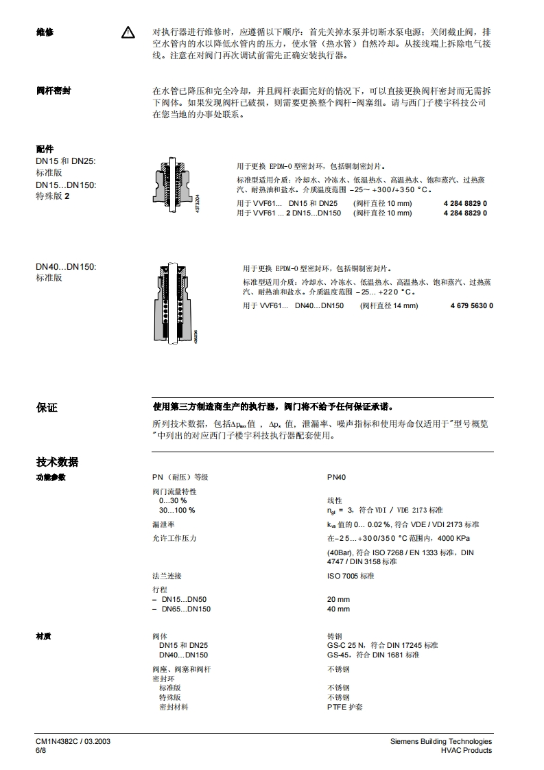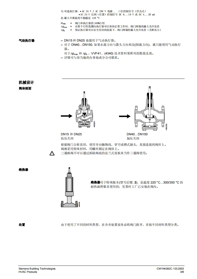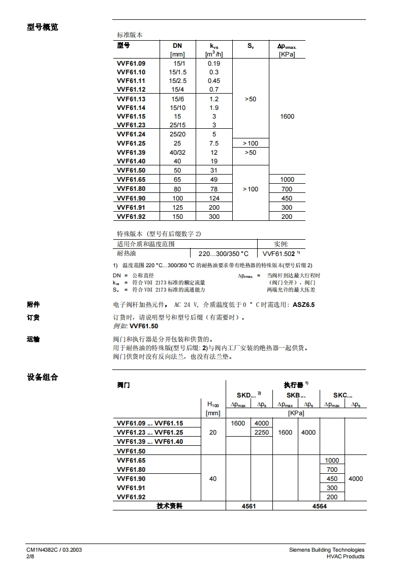 SIEMENS二通阀法兰连接,PN40VVF61...DN15和DN25DN40..DN150法兰连接二通阀,耐压等级PN40。公称直径:DN15..DN150mm阕体DN15和DN25:铸钢GS-C25N·阀体DN40.DN150:铸钢GS-45流量:ks0.19.300mh。阀杆行程:20或40mm·可与SQX,SKD.和SKB.系列执行器配合安装用途适用于区域供热系统、暖通空调系统中作为符合DN32730标准的控制阀或安全截止阀。适用于开式系统和闭式系统。介质采用标准密封的标准阀门适用于以下介质:冷却水冷冻水低温热水高温热水防冻水)购-25..+220C标准蒸汽过热蒸气DN15和25(最高达到17 bar abs.)DN40..150(最高达到11 bar abs.)盐水)刘带绝热器和采用特殊密封的特殊阀门适用于以下介质:耐热油220..300/350C9制冷剂不适用)1)介质温度低于0°C时:需要ASZ6.5阀杆加热元件来防止密封套内的阀杆冻结。2)防冻水和盐水:最低-10°C符合DN3158标准(压力容器I)或最低-25°C符合DN3158标准(压力容器II)3)对于220.300/350℃耐热油的应用,在阀与执行器之间要求有绝热器.根据阀体材料所允许的最高温度在“注意事项”和“工程注意事项”中有所说明。4)对于这些应用,应使用带电磁式执行器的特制制冷剂阀,请参见技术资料4700.…4799Siemens Building TechnologiesCM1N4382C/03.2003HVAC Products1/8