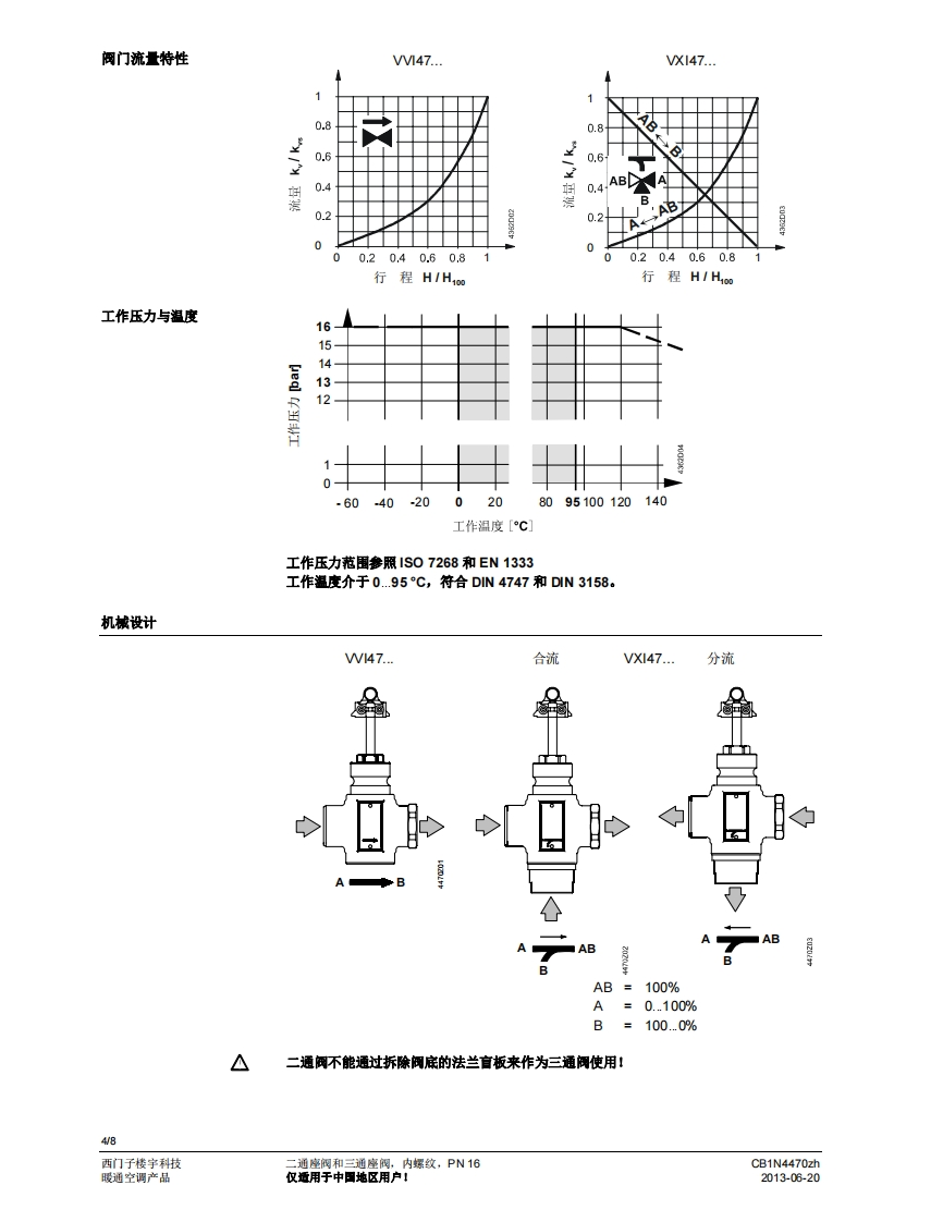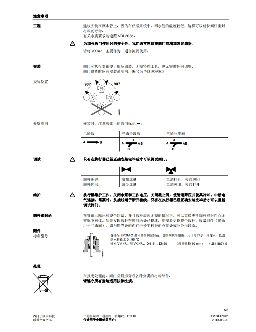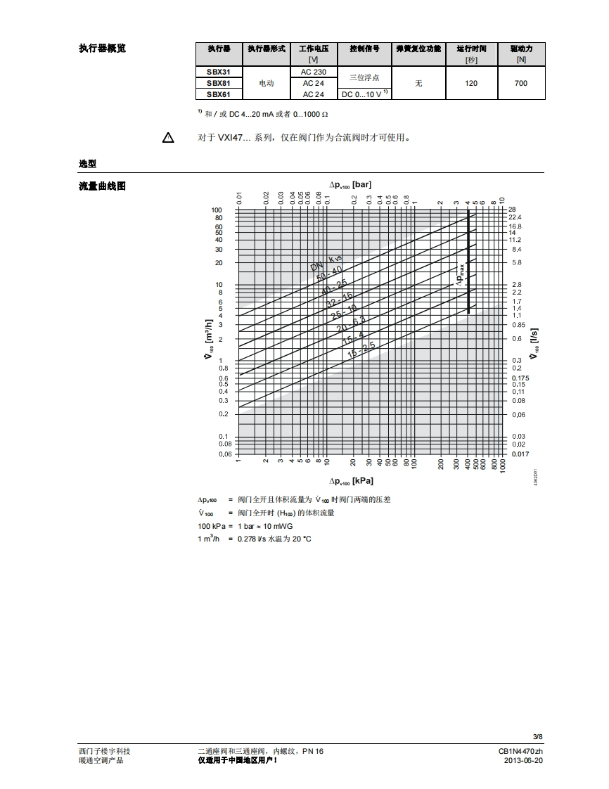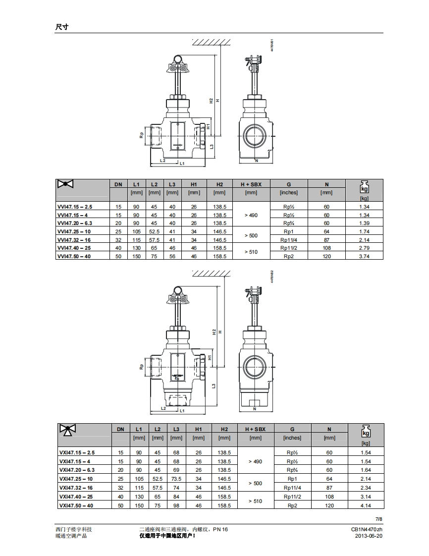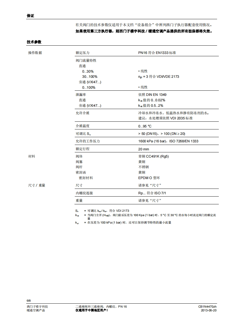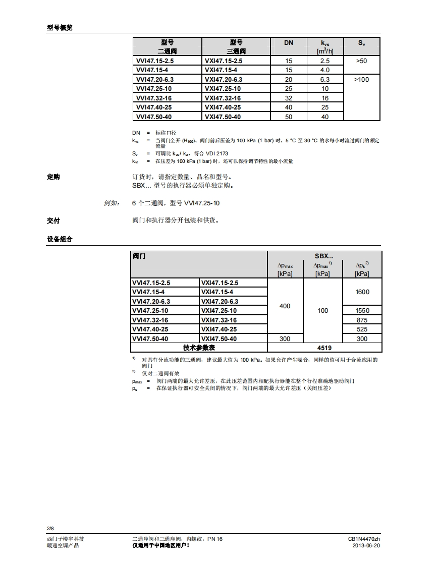 SIEMENS济南工达孔功24小时为您服务」www.cngdkj.com电话:18653198028QQ:1319331276西门子全国最大合作伙伴!W147..VXI47..acvatix二通座阀和三通座阀,VV147.内螺纹,PN16VXⅪ47..·青铜阀体CC491K(Rg5)·DN15..DN50·kvs2.5..40mh·内爆纹连接Rp.,符合1S071·与执行器SBX.配套使用用途适用于暖通空调系统中的控制或安全截止阀,符合D1N32730。适用于闭式和水系统。介质标准型号适用于:冷却水冷冻水低温热水0.95℃高温热水参有防冻剂的水盐水CB1N4470zh仅适用于中国地区用户!西门子楼宇科技2013-06-20暖通空调产品