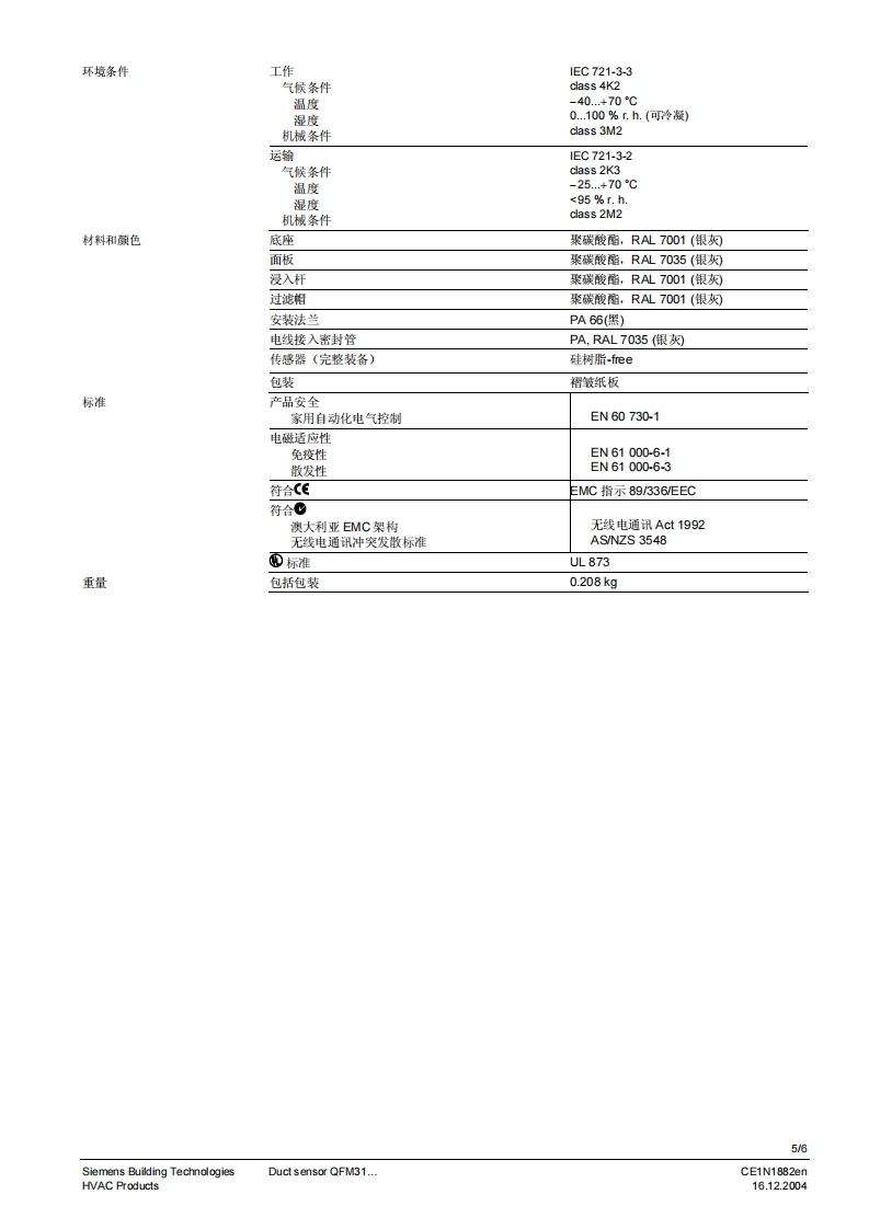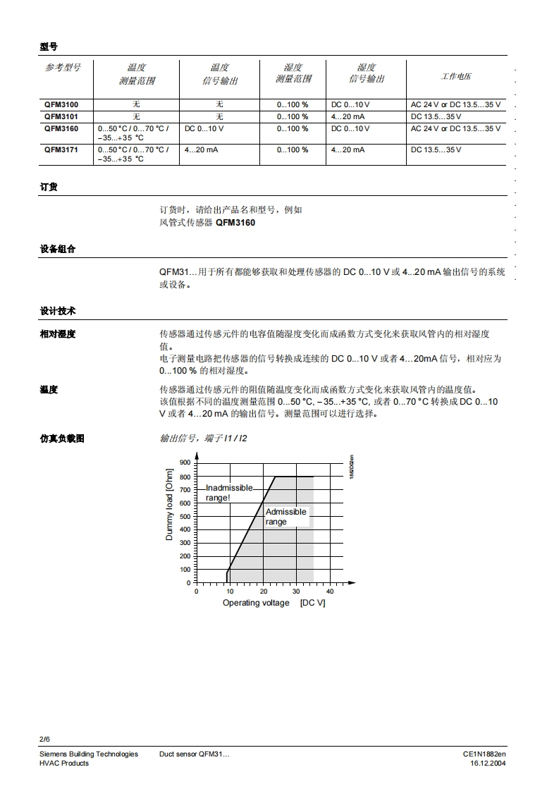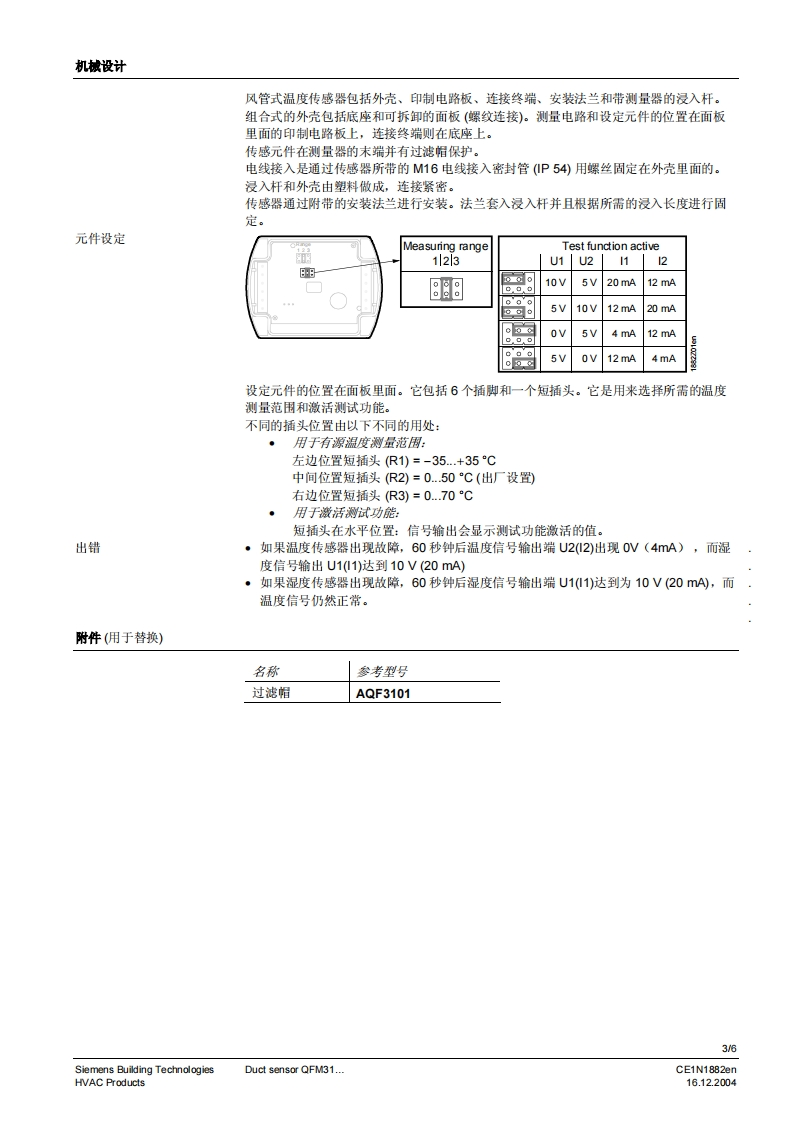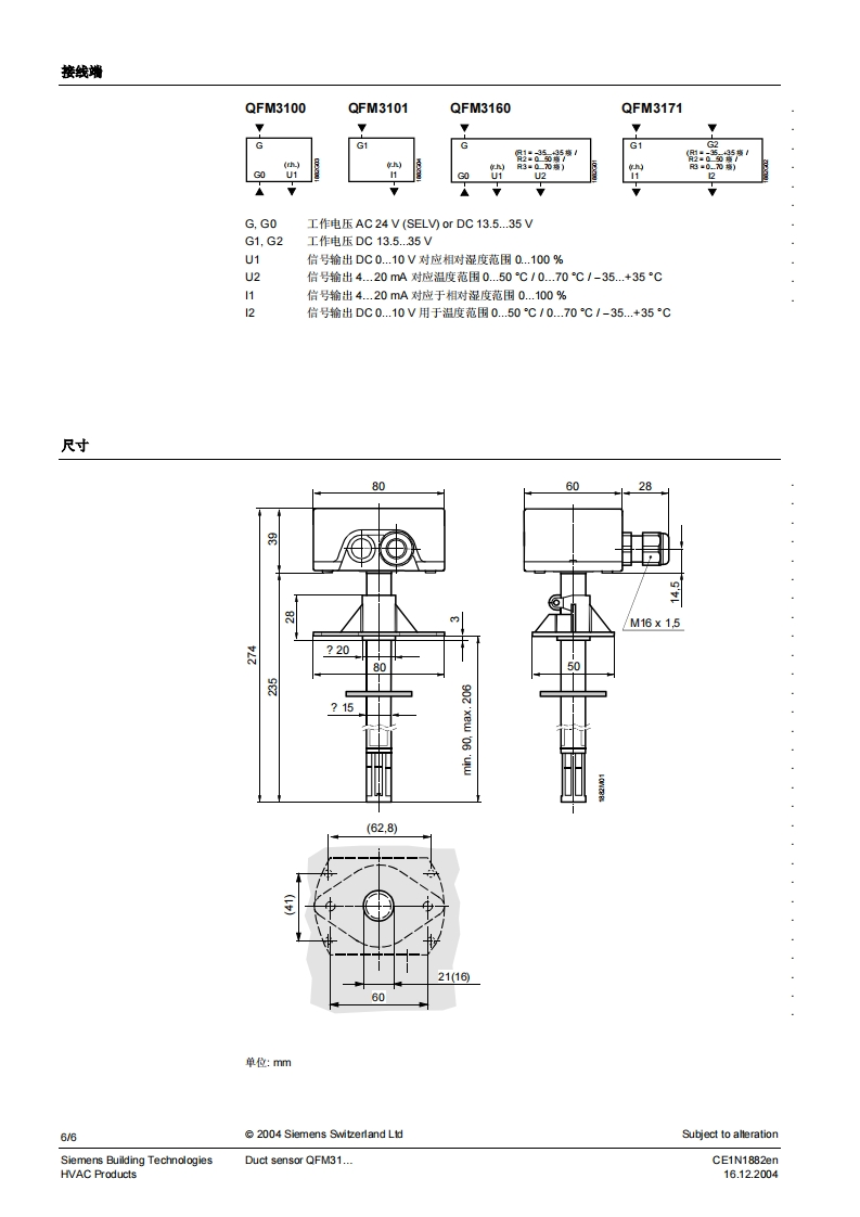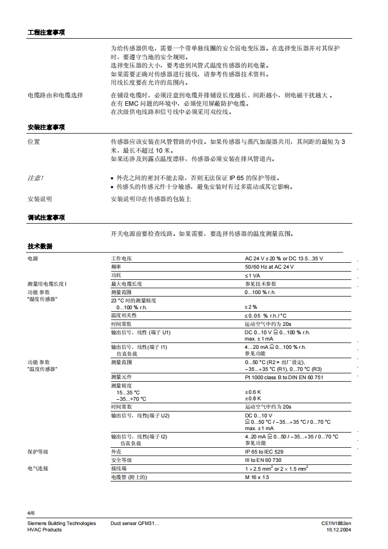 SIEMENS济南工达孔功24小时为您服务!www.cngdkj.com电话:18653198028QQ:1319331276西门子全国最大合作伙伴!SIEMENSSymaro TM风管式传感器QFM31...用于测量相对湿度(高精度)和温度·工作电压AC24V或DC13.5.35V·信号输出DC010VW4.20mA,用于相对湿度和温度·整个测量范围内的高精度电容式湿度测量原理用途QFM31.用于相对湿度测量精度要求和响应时间较高的暖通空调场合。测量范围包括了整个湿度范围0..100%.例如:·造纸业、丝绸业、药业、食品业、化学和电子工业等等用于储藏和生产的设施中·实验室·医院·计算机和电子数据处理(EDP)中心·室内游泳池·温室QFM31..用于·送回风中用于控制的传感器·蒸汽加湿器后用于最大送风湿度的限定传感器·限定传感器,例如用于测量值显示或者连接至楼宇控制系统等·用于焓值和绝对湿度的测量,与AQF61.1(技术资料N1899)或者SEZ220(技术资料N5146)共同使用CE1N1882cnSiemens Building Technologies16.12.2004HVAC Products