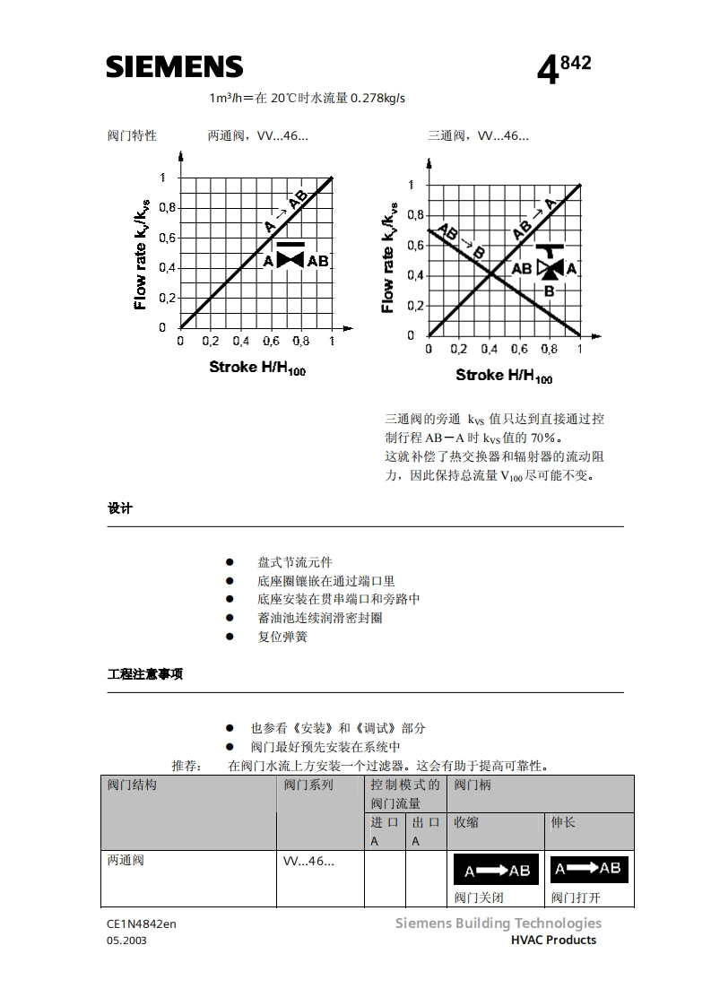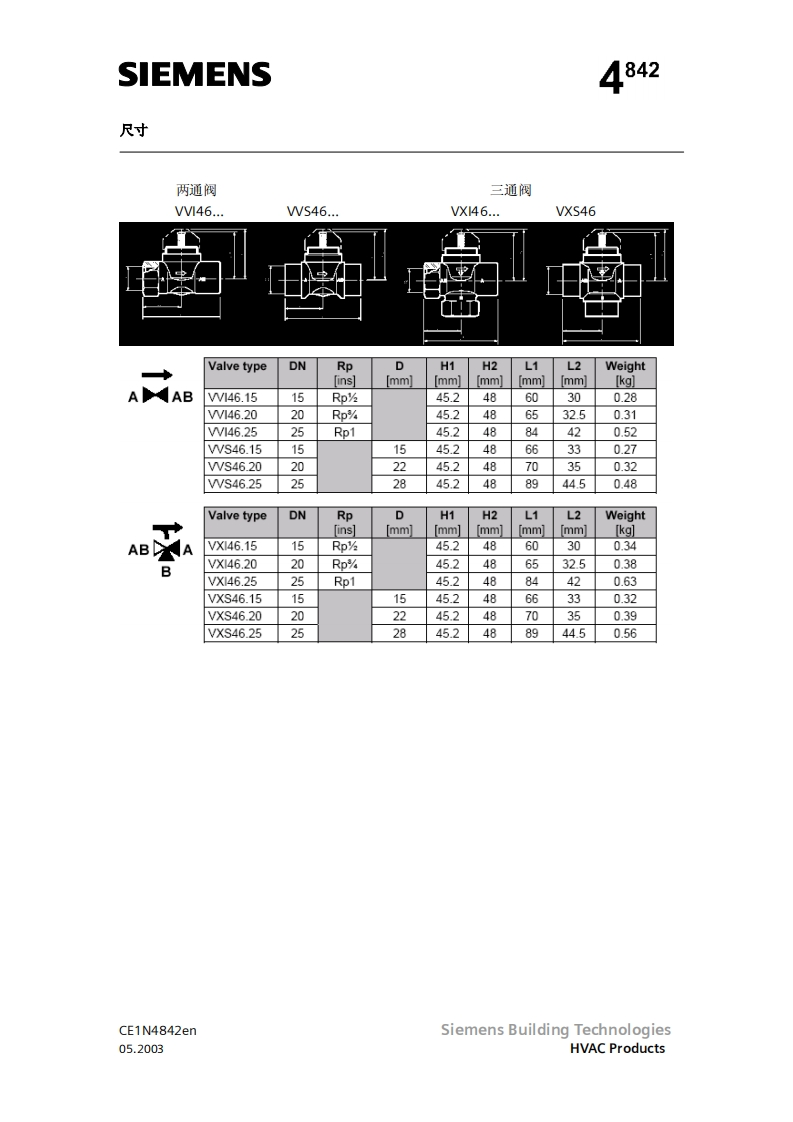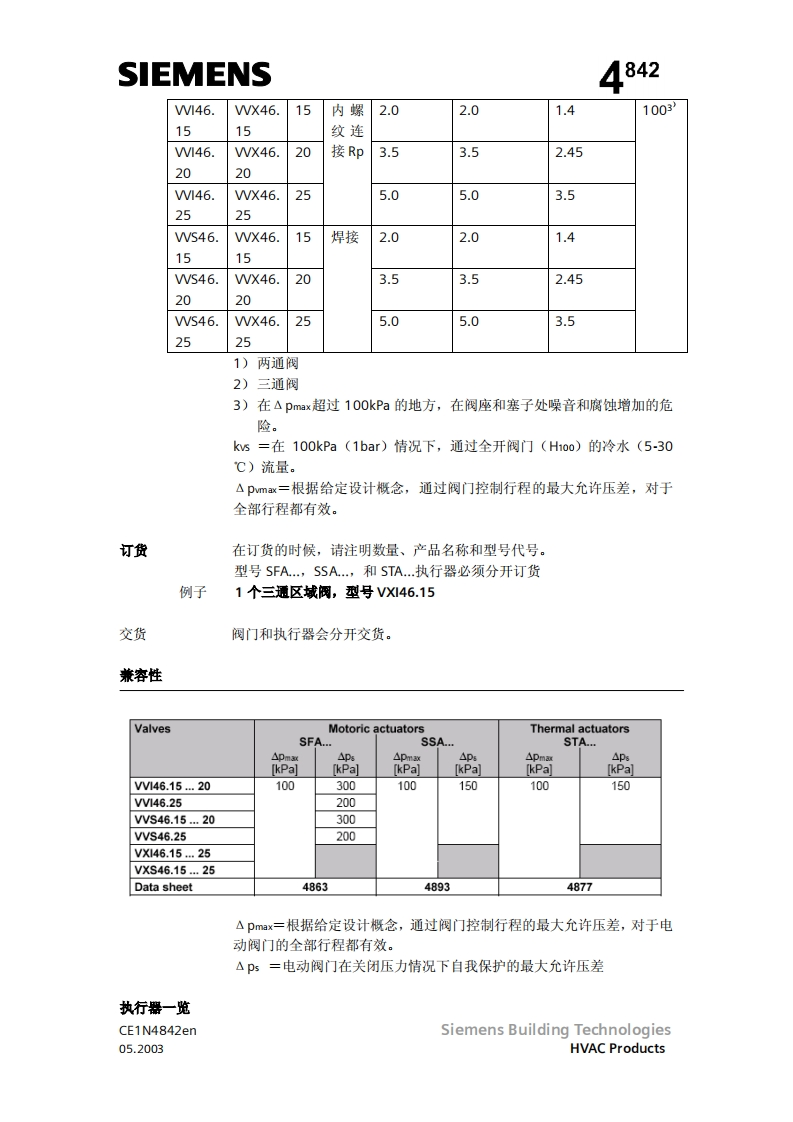 SIEMENS济南工达孔功24小时为您服务!www.cngdkj.com电话:18653198028QQ:1319331276西门子全国最大合作伙伴!两通阀三通阀两通阀三通阀W146.15至W46.25VX46.15至VX146.25W5146.15至W5146.25VXS146.15至VXS146.25acvatix两通及三通区域阀,PN16VW146VX146VVS46VXS46热压黄铜阀体DN15,DN20和DN25●额定流量ks从2到5m3h●内螺纹连接,Rp.符合S071(N..146…)或者焊接(N.146.)手动调节●可以和电动执行器一起安装,SFA和SSA.,或者热执行器,型号STA.应用●可以用于通风和空调系统中闭式环路中水侧末端机组的控制,举例来说,如诱导器,风机盘管机组,小型再热器和小型冷却器。-带有一个用于加热和制冷热交换器的两管制系统带有两个用于加热和制冷热交换器的四管制系统●用于闭路区域供热系统中,比如:一建筑物中的地板一公寓住宅一单独住宅型号可以用于通风和空调系统中闭式环路中水侧末端机组的控制,举例来W146VXI46DN连接kvskvskvs…AABTAB十A1)AB A1PVmax两通三通[m3/h][m3/h][m3/h]KpaCE1N4842enSiemens Building Technologies05.2003HVAC Products