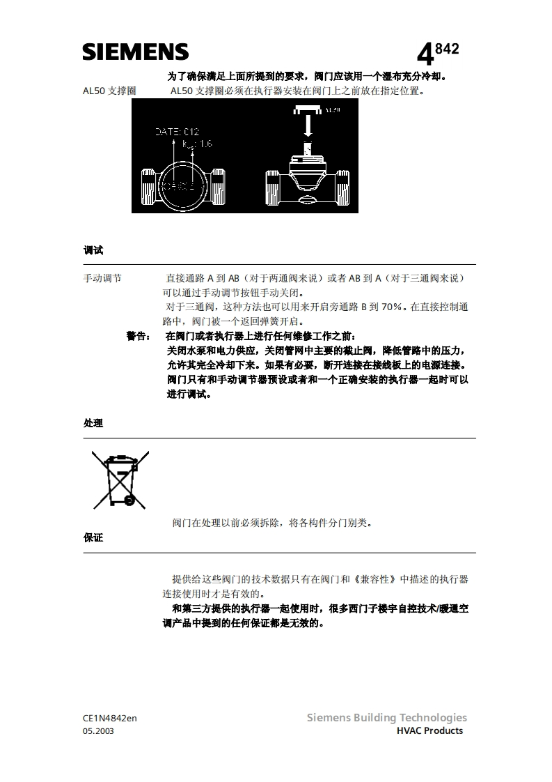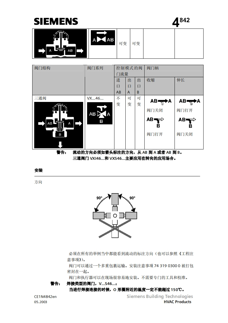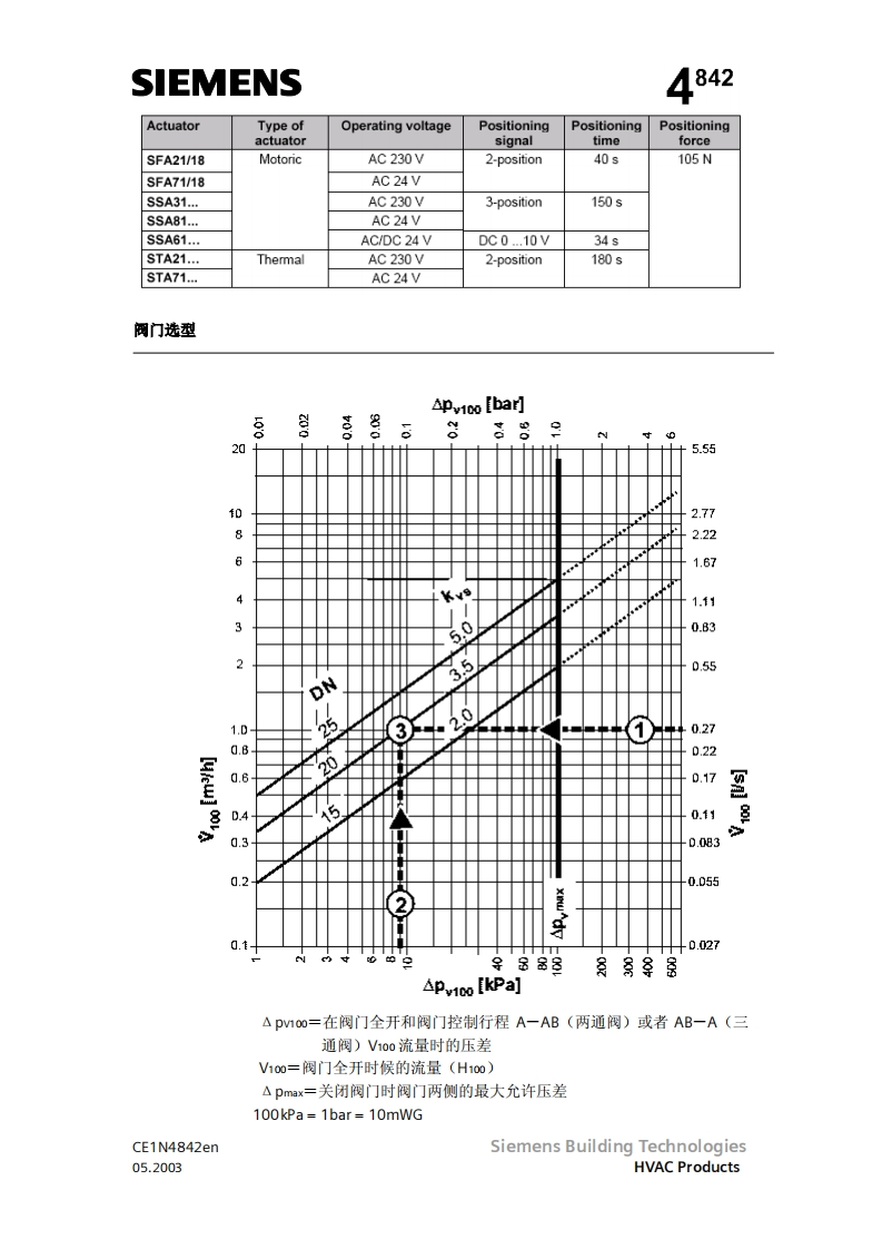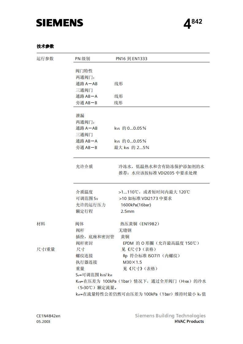 SIEMENS济南工达孔功24小时为您服务!www.cngdkj.com电话:18653198028QQ:1319331276西门子全国最大合作伙伴!两通阀三通阀两通阀三通阀W146.15至W46.25VX46.15至VX146.25W5146.15至W5146.25VXS146.15至VXS146.25acvatix两通及三通区域阀,PN16VW146VX146VVS46VXS46热压黄铜阀体DN15,DN20和DN25●额定流量ks从2到5m3h●内螺纹连接,Rp.符合S071(N..146…)或者焊接(N.146.)手动调节●可以和电动执行器一起安装,SFA和SSA.,或者热执行器,型号STA.应用●可以用于通风和空调系统中闭式环路中水侧末端机组的控制,举例来说,如诱导器,风机盘管机组,小型再热器和小型冷却器。-带有一个用于加热和制冷热交换器的两管制系统带有两个用于加热和制冷热交换器的四管制系统●用于闭路区域供热系统中,比如:一建筑物中的地板一公寓住宅一单独住宅型号可以用于通风和空调系统中闭式环路中水侧末端机组的控制,举例来W146VXI46DN连接kvskvskvs…AABTAB十A1)AB A1PVmax两通三通[m3/h][m3/h][m3/h]KpaCE1N4842enSiemens Building Technologies05.2003HVAC Products