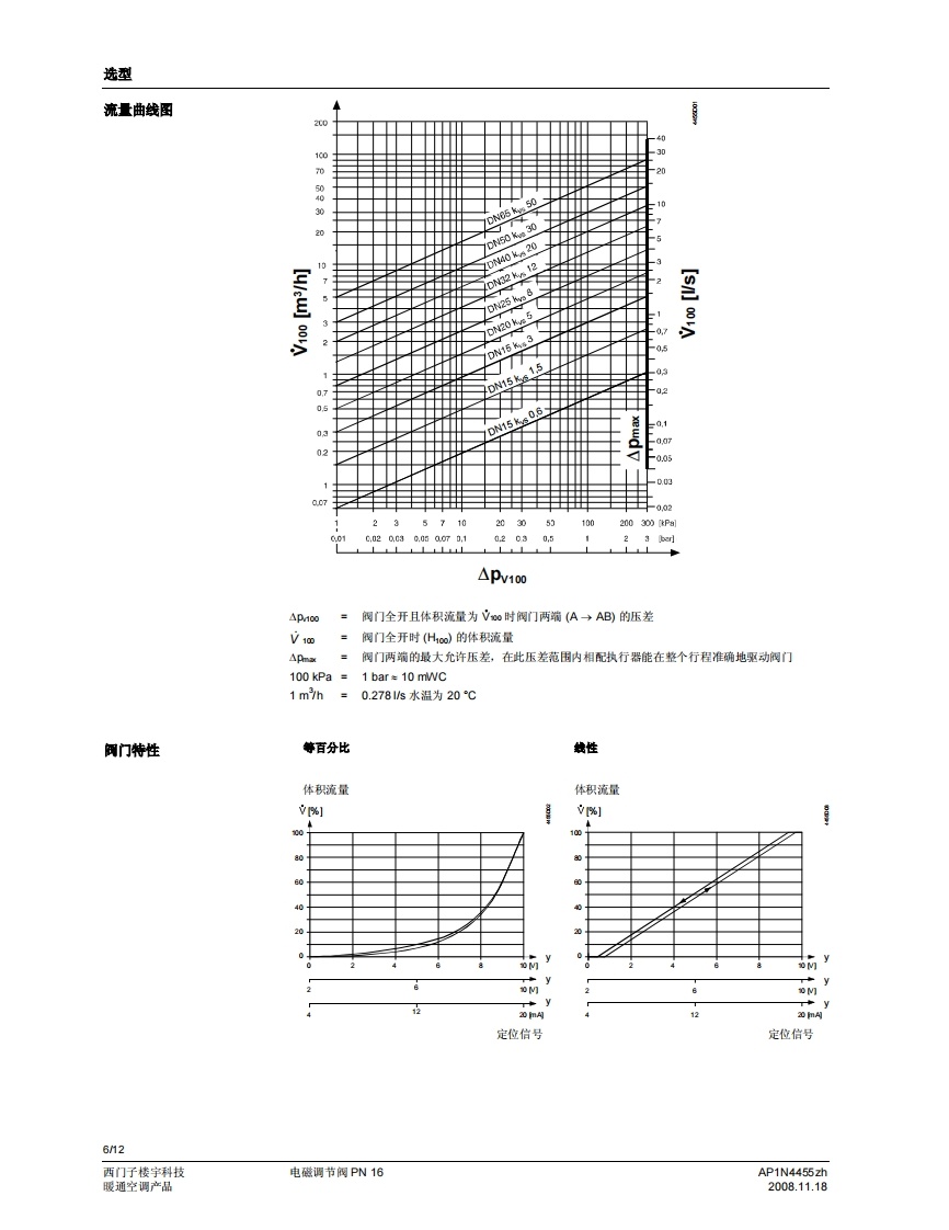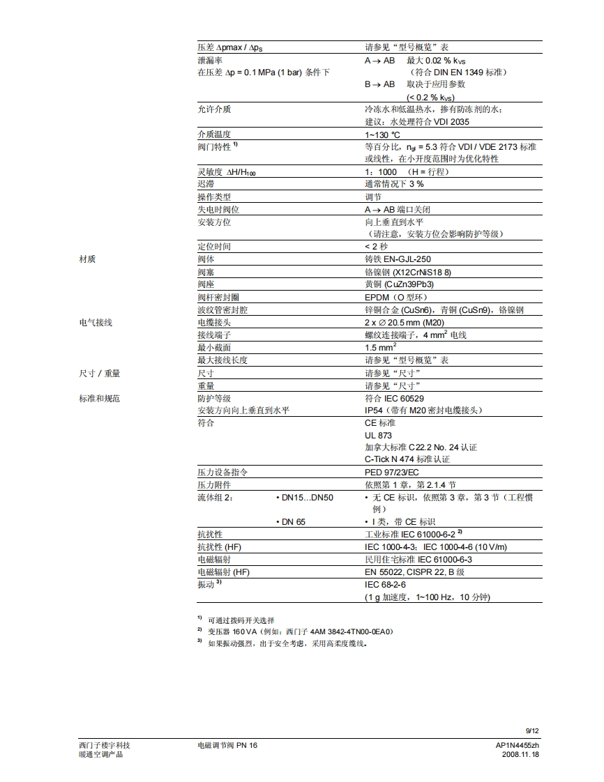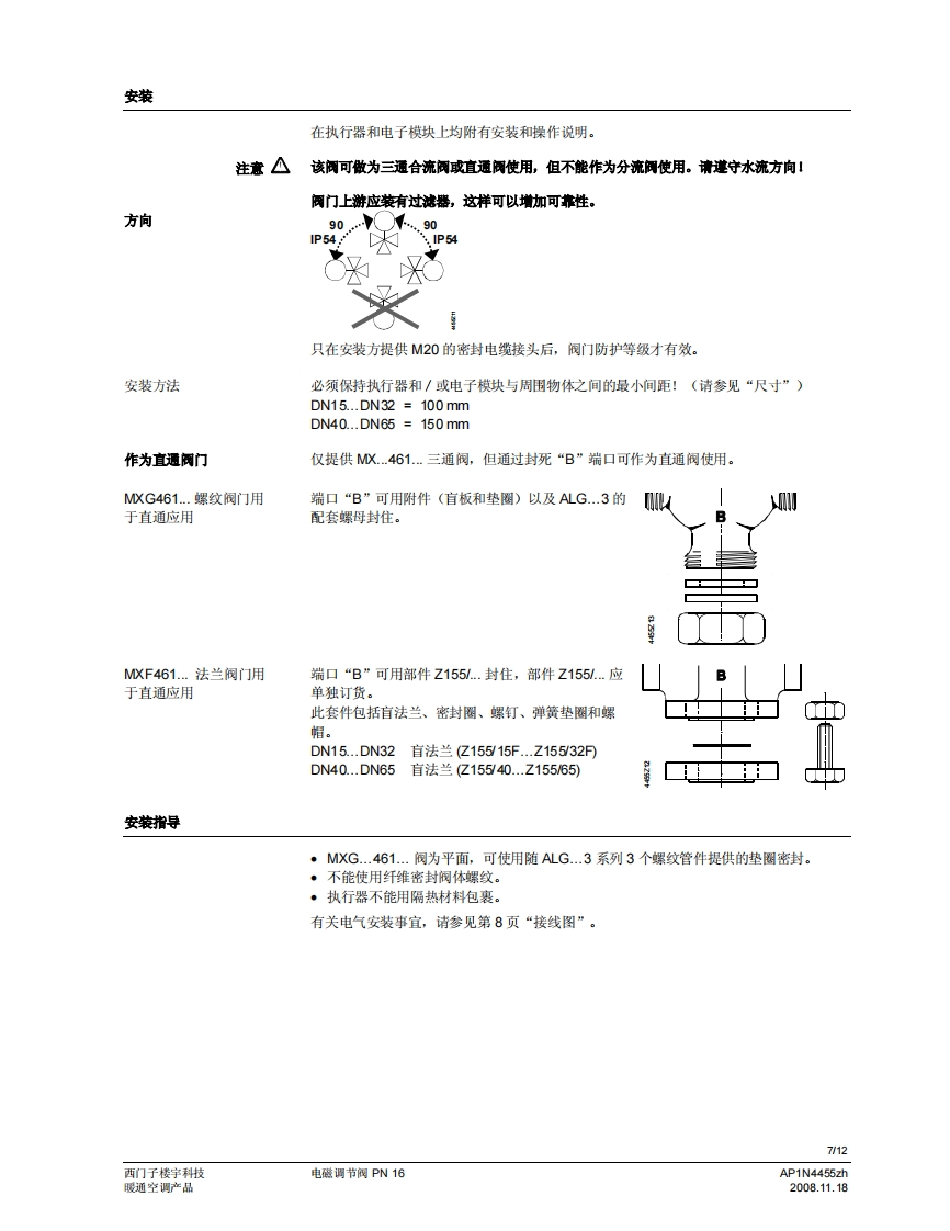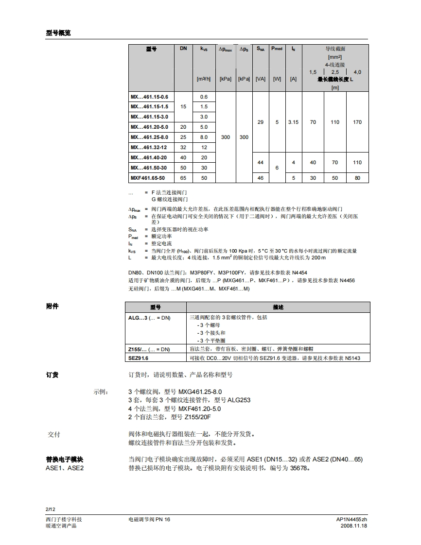 SIEMENS济南工达孔功24小时为您服务!www.cngdkj.com电话:18653198028QQ:1319331276西门子全国最大合作伙伴!MXG461F461.acvatix电磁调节阀PN16MXG461...MXF461..适用于低温热水和冷冻水系统·定位快(<2秒钟)、灵敏度高(◇1:1000)·等百分比或线性间门特性(用户选择)·可调比宽·工作电压AC24V·开关选择控制信号:DC0/2..10V或DC4..20mA·通过SEZ91.6变送器可接收DC0..20V切相信号操作状杰显示定位控制、位置反债和手动控制无磨损感应式行程测量·失电安全特性:失电时,阀门墙口A一>AB关闭·低青损、附用、无需维护用途可作为三通合流阀和二通控制阀。阀门预先已装配电磁执行器,以及用于定位控制和阀位反馈的电子组件。这种阀门的优点是定位时间短、灵敏度高且可调比宽,因此,适用于暖通空调闭式系统的冷冻水和低温热水系统的调节控制。针对用于矿物油介质的阀门,请参见技术参数表4456。可提供特殊无硅型号,后缀为M。AP1N4455zh西门子楼字科技2008.11.18暖通空调产品