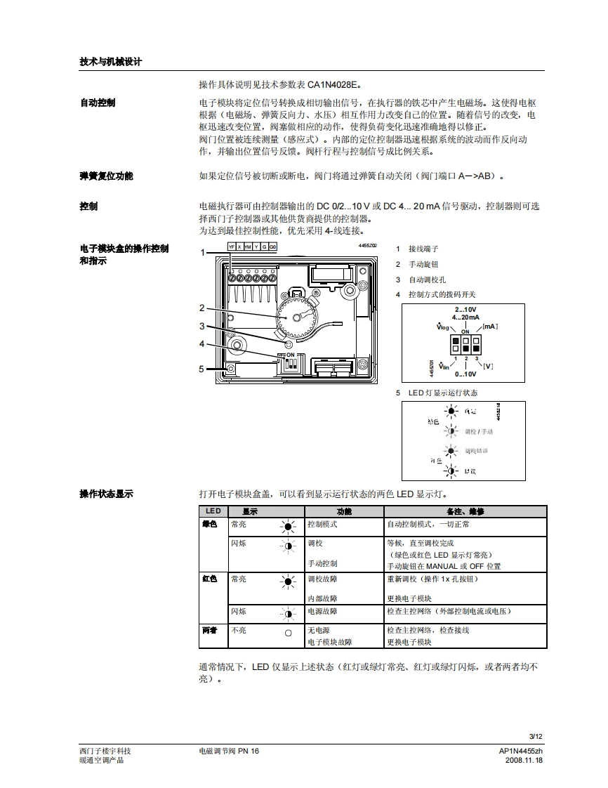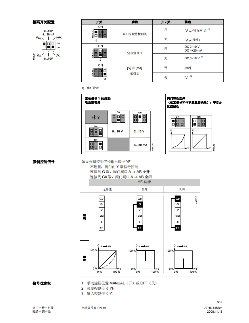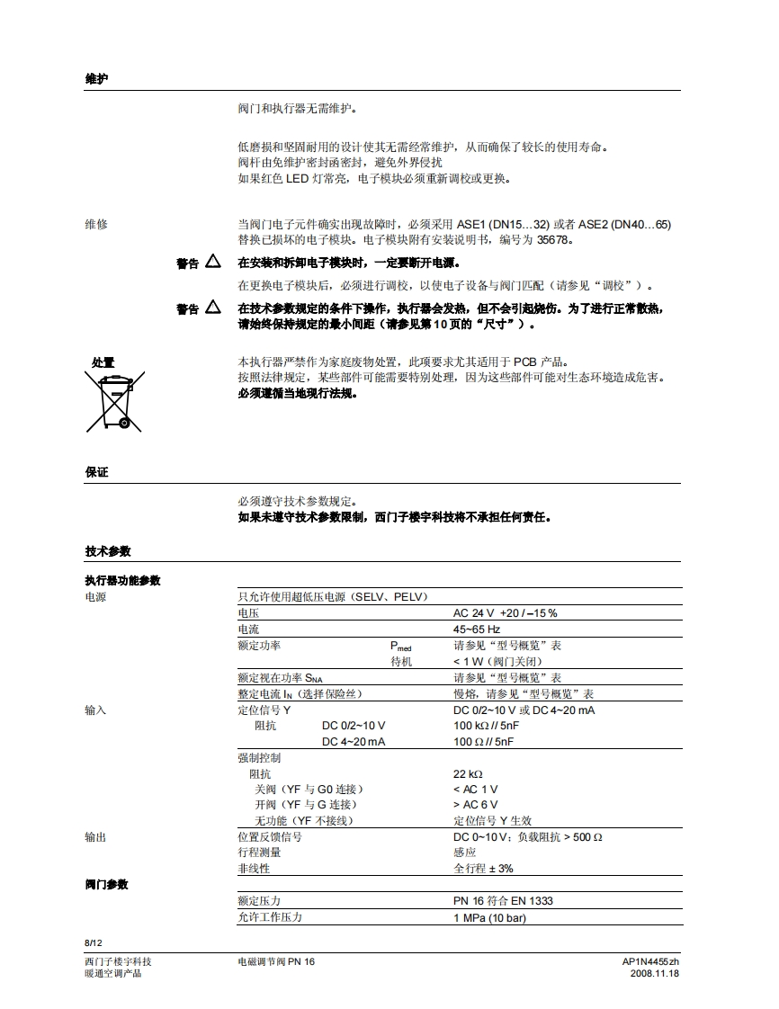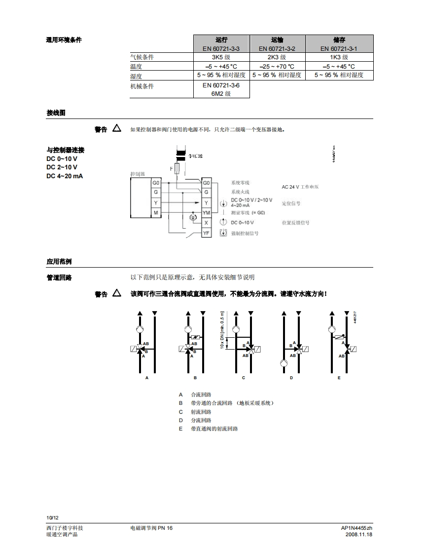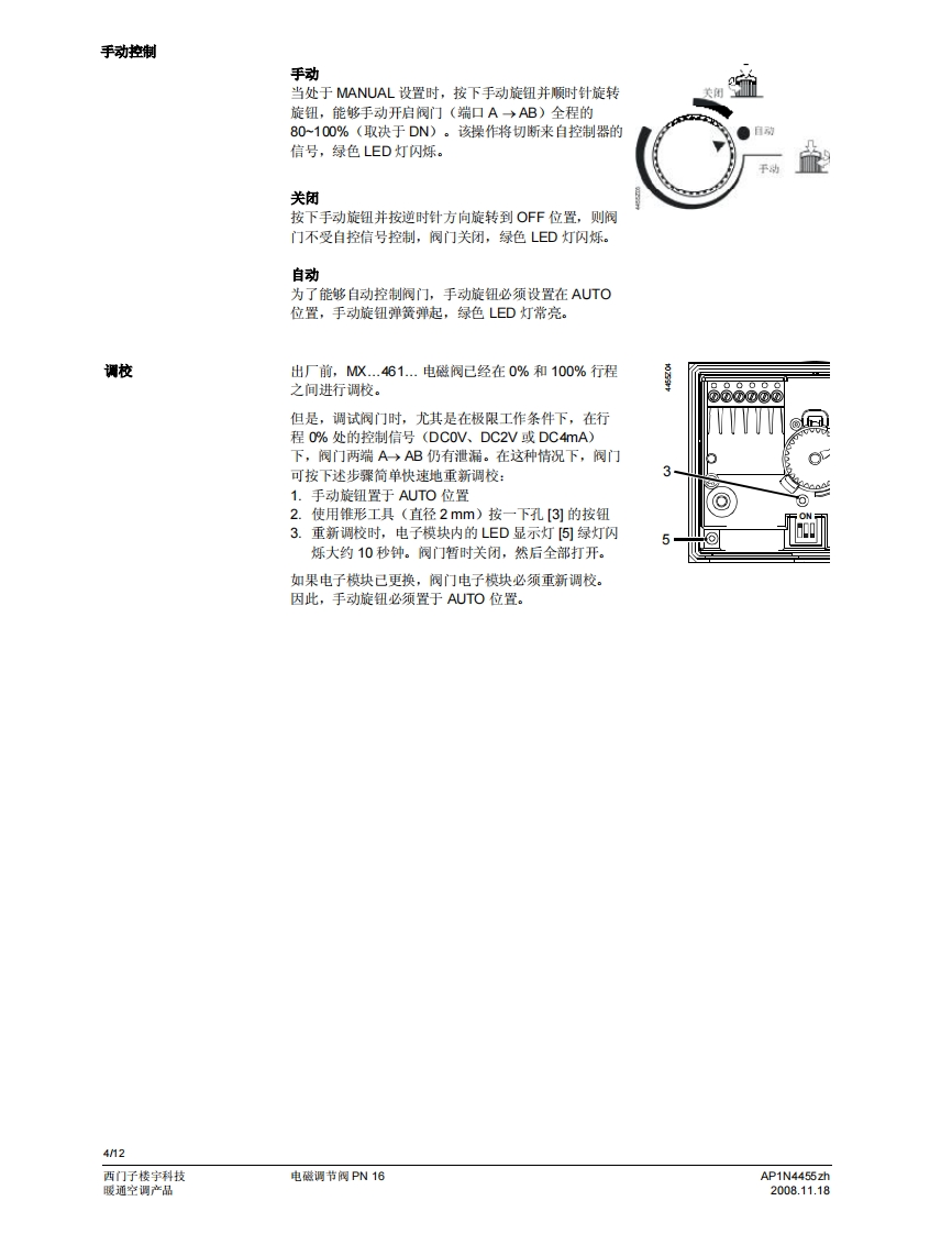 SIEMENS济南工达孔功24小时为您服务!www.cngdkj.com电话:18653198028QQ:1319331276西门子全国最大合作伙伴!MXG461F461.acvatix电磁调节阀PN16MXG461...MXF461..适用于低温热水和冷冻水系统·定位快(<2秒钟)、灵敏度高(◇1:1000)·等百分比或线性间门特性(用户选择)·可调比宽·工作电压AC24V·开关选择控制信号:DC0/2..10V或DC4..20mA·通过SEZ91.6变送器可接收DC0..20V切相信号操作状杰显示定位控制、位置反债和手动控制无磨损感应式行程测量·失电安全特性:失电时,阀门墙口A一>AB关闭·低青损、附用、无需维护用途可作为三通合流阀和二通控制阀。阀门预先已装配电磁执行器,以及用于定位控制和阀位反馈的电子组件。这种阀门的优点是定位时间短、灵敏度高且可调比宽,因此,适用于暖通空调闭式系统的冷冻水和低温热水系统的调节控制。针对用于矿物油介质的阀门,请参见技术参数表4456。可提供特殊无硅型号,后缀为M。AP1N4455zh西门子楼字科技2008.11.18暖通空调产品