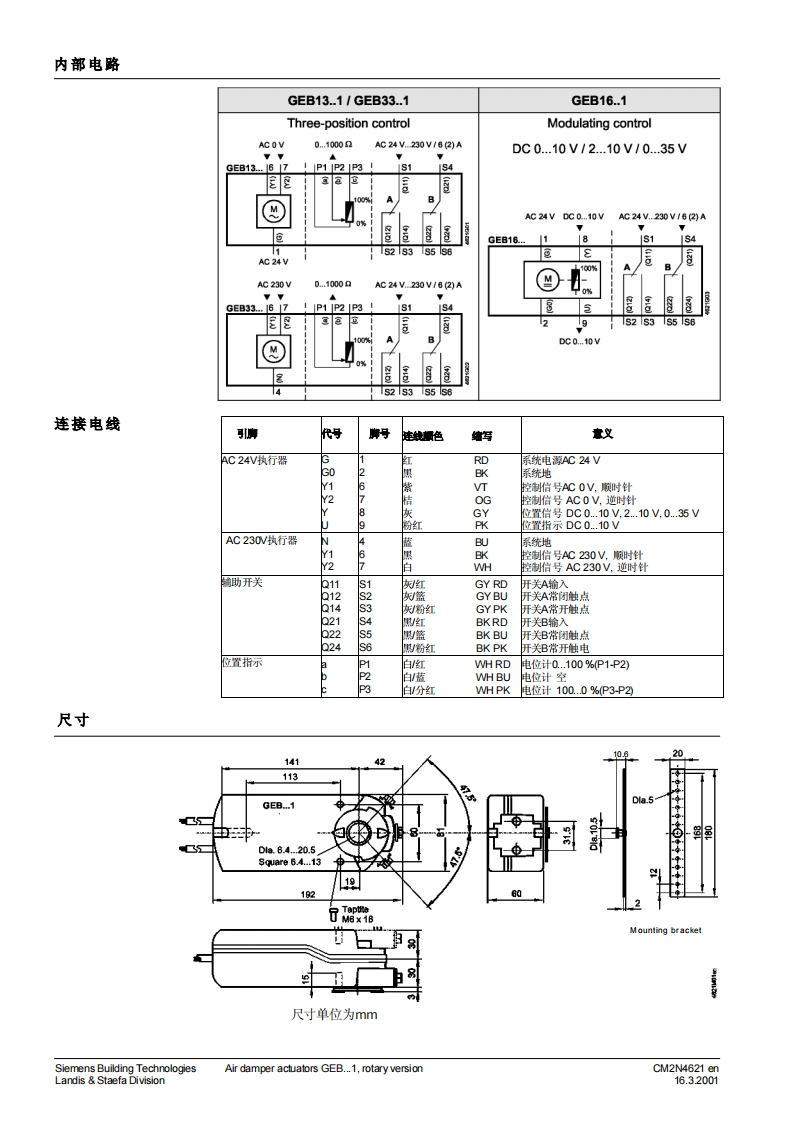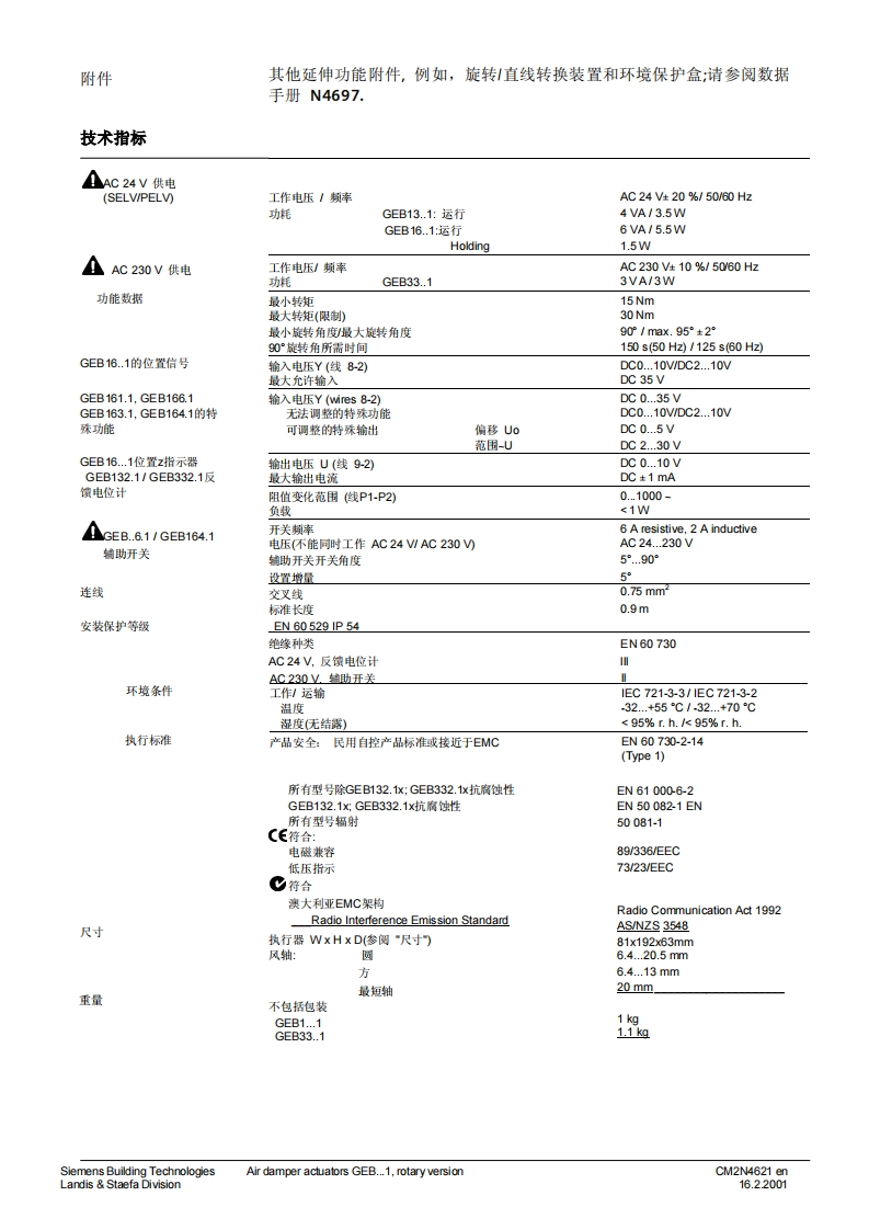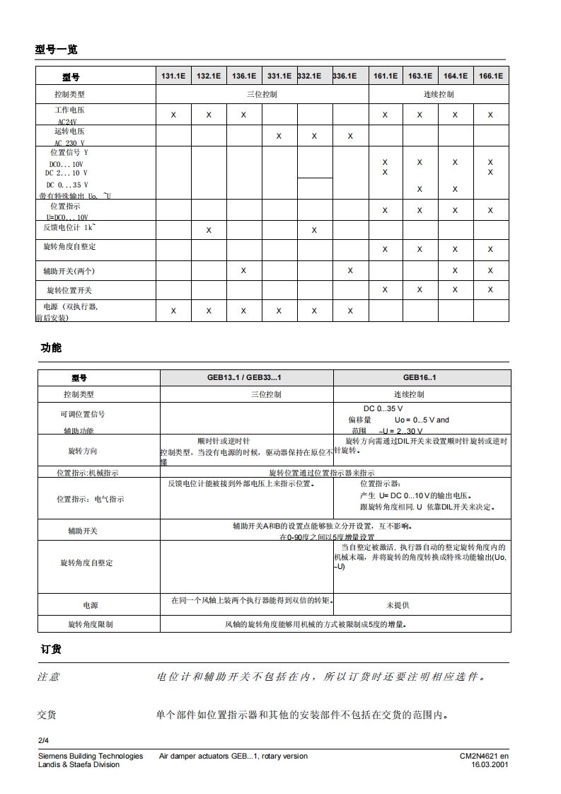 SIEMENS济南工达孔功24小时为您服务!www.cngdkj.com电话:18653198028QQ:1319331276西门子全国最大合作伙伴!OpenAirTM风阀执行器GEB...1旋转版本,AC24MAC230V三位、无级控制电动执行器,最小转矩15Nm,带有自整定装置,0.90°机械调节范围带有0.9m长连接电缆,位置信号偏移和范围可调。带有位置指示器,反馈电位计,旋转角度自整定,有辅助开关用于辅助功能。注意这份数据手册只包含了执行器的概述。如果想得到有关安全、工程使用注意事项、安装、调试等的细节,请参阅文档CM2Z4621。使用适合于面积大于3m2的风阀适合用于连续调节控制器(DC0.10)或三位控制器(如室外风阀)适合在同一个轴上有两个执行器的风阀。CM2N4621enSiemens Building Technologies16.03.2001Landis Staefa Division