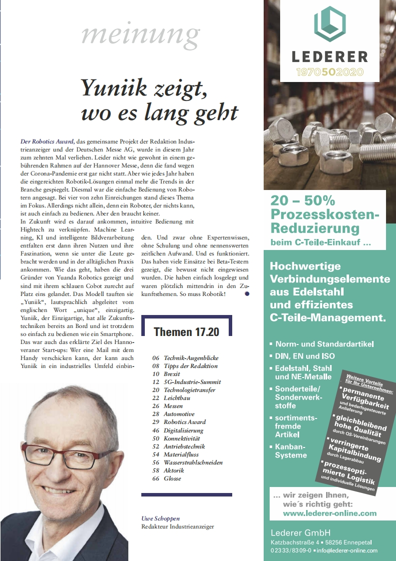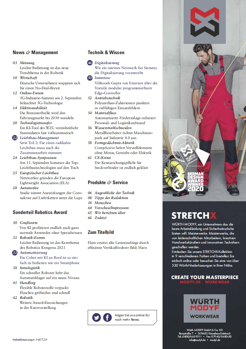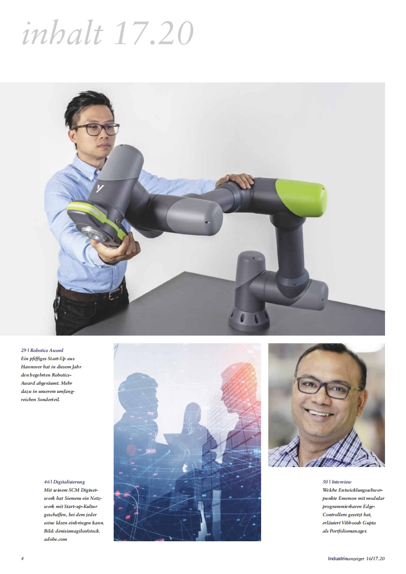 >konradin Industrie Das Kompetenznetzwerk der IndustrieIndustrie16/17.20anzeiger18.08.20201142.Jahrgangwww.industrieanzeiger.deRobotik Ein Cobot,der mitdenkt Seite 32Vibhoosh Gupta vonDigi-Network Start-up-Kultur bei Siemens Seite 46Emerson uber Edge-Leichtbau Radikale Losungen sind moglich Seite 22Controller Seite 50SpecialRoboticsAwardab Seite 29四间