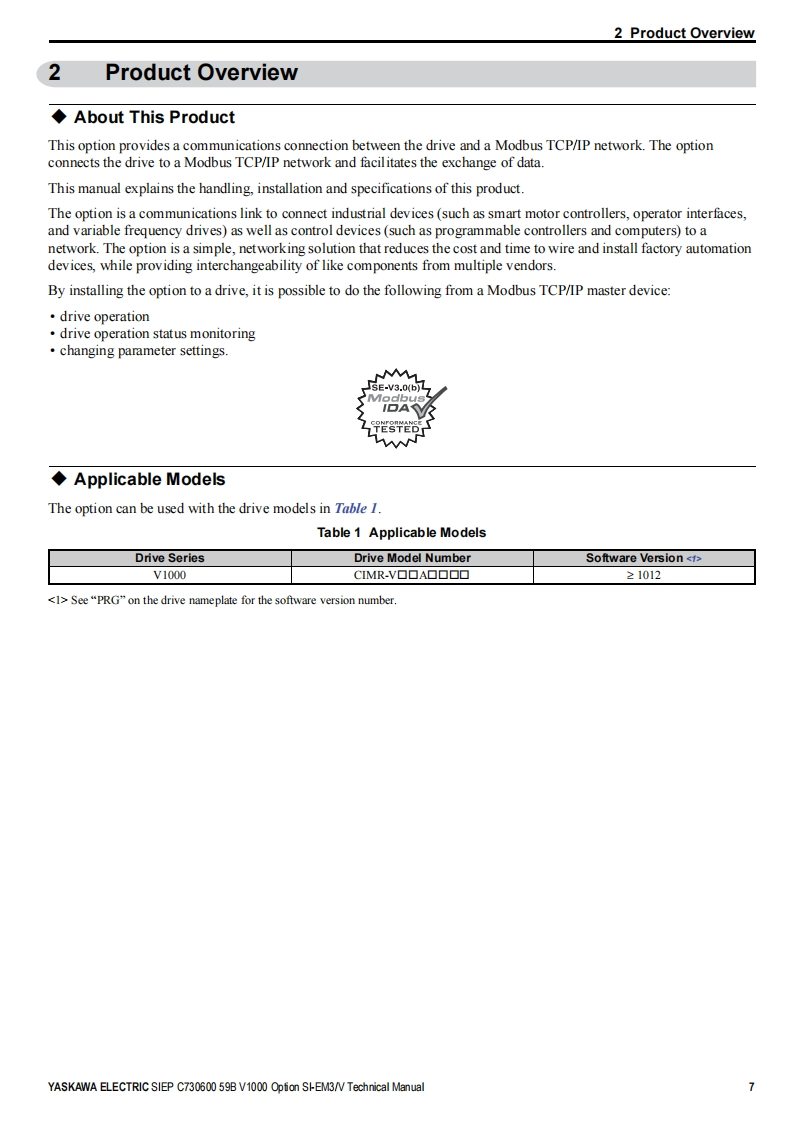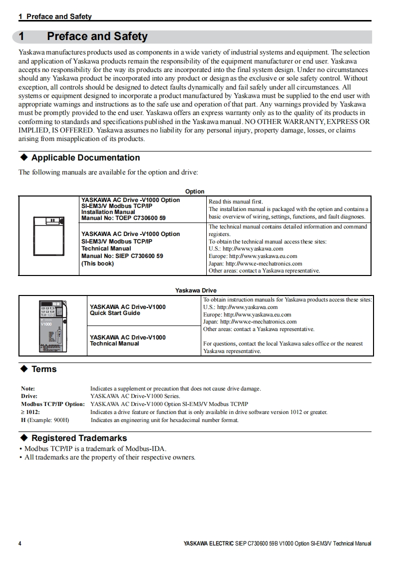 YASKAWAYASKAWA AC Drive-V1000 OptionModbus TCP/IPTechnical ManualType:SI-EM3/VTo properly use the product,read this manual thoroughly and retainfor easy reference,inspection,and maintenance.Ensure the end userreceives this manual.88MANUAL NO.SIEP C730600 59B
