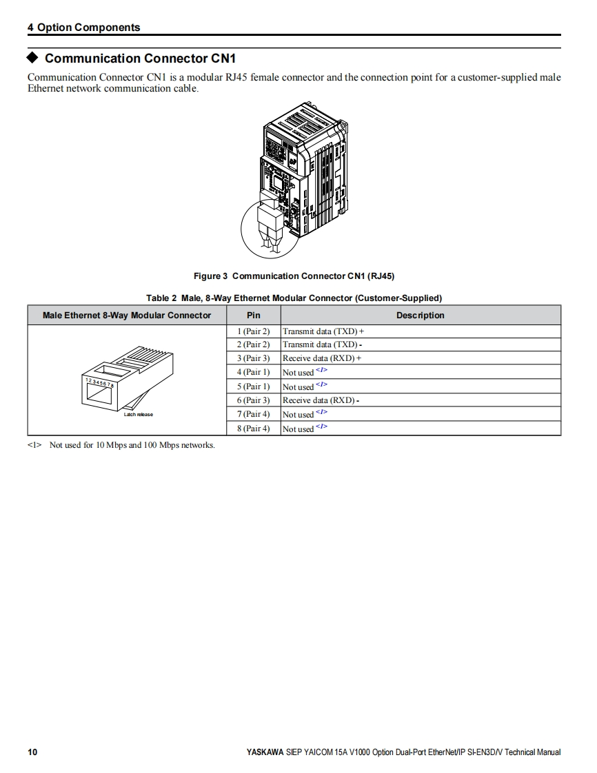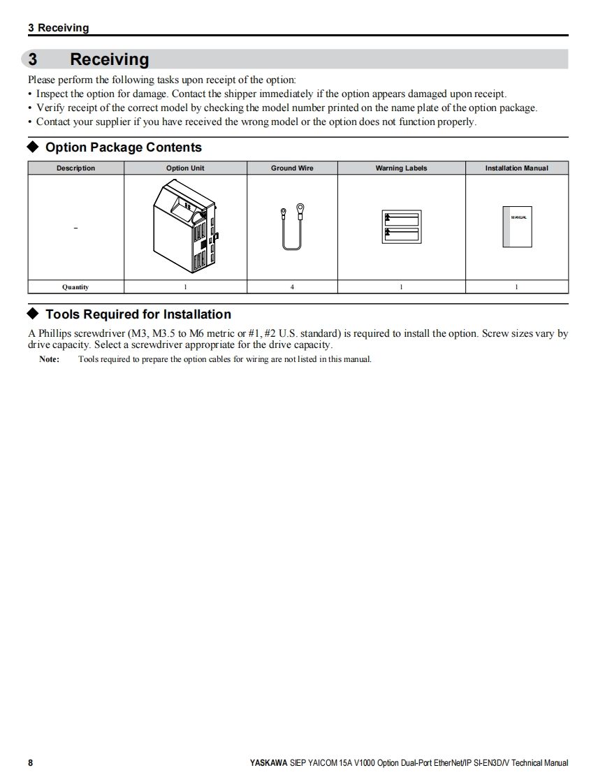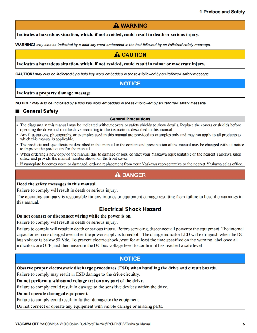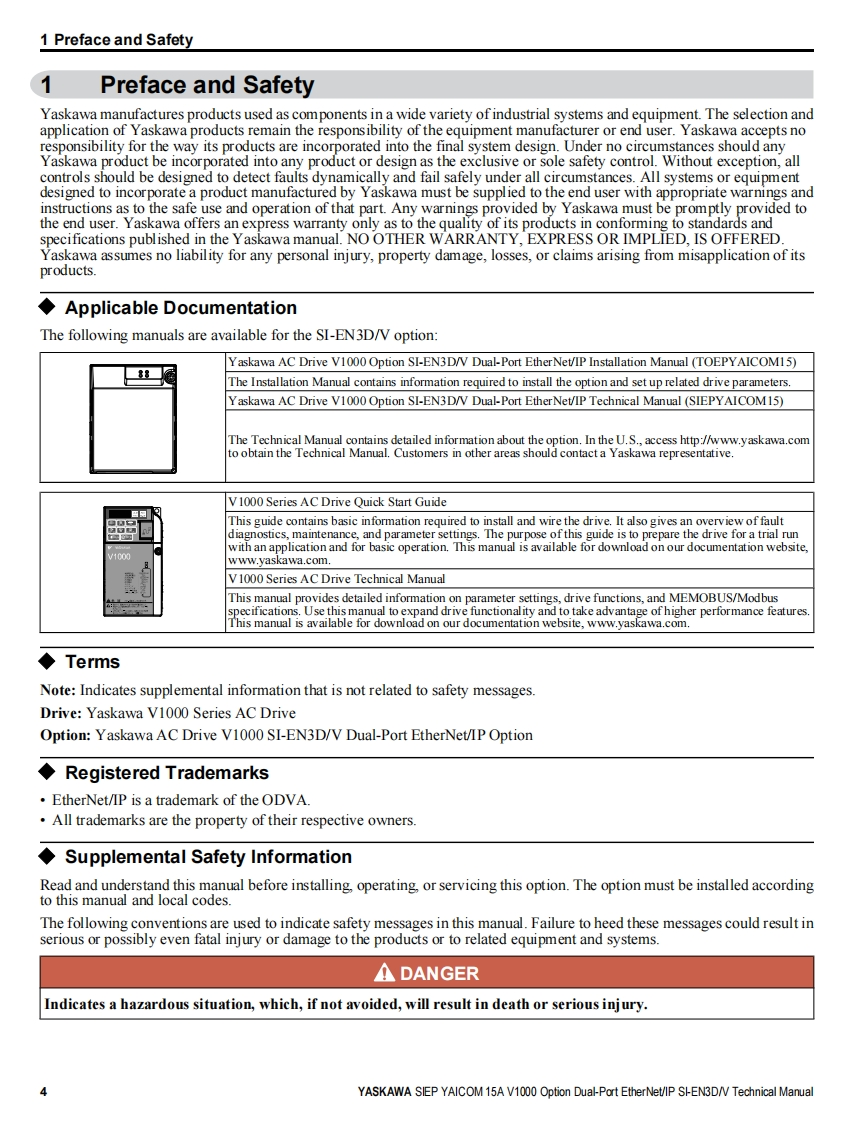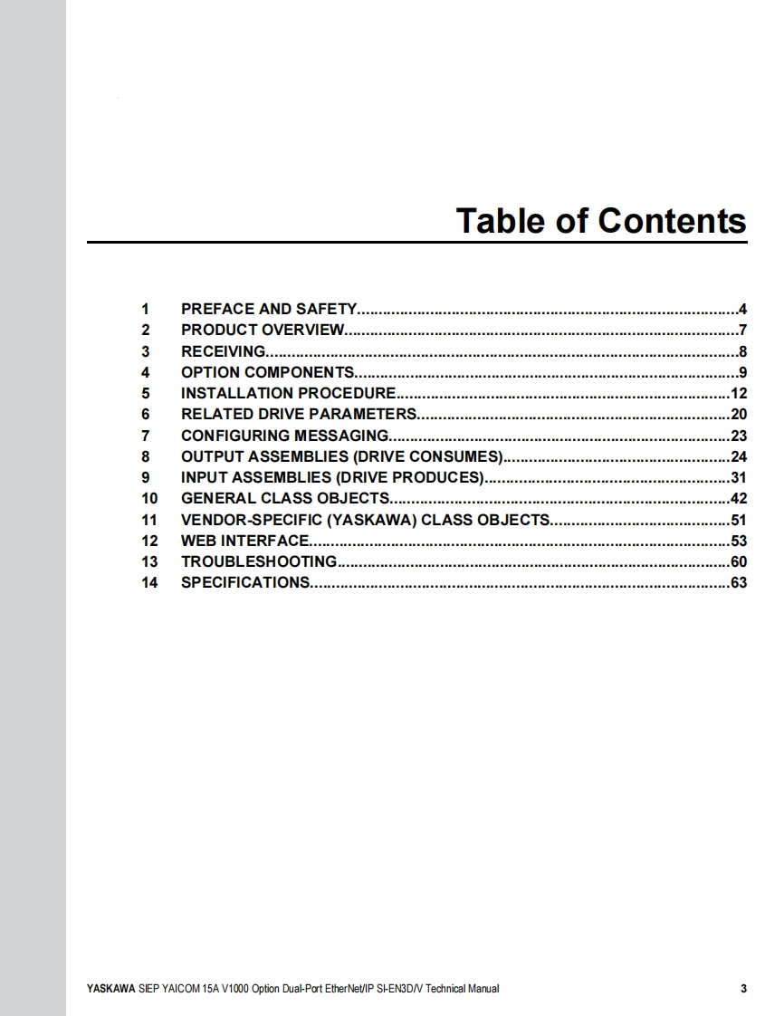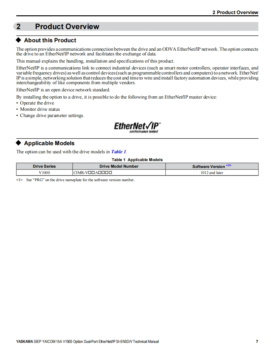 YASKAWAYASKAWA AC Drive V1000 OptionEtherNet/IPTechnical ManualType:SI-EN3D/VTo properly use the product,read this manual thoroughly and retainfor easy reference,inspection,and maintenance.Ensure the end userreceives this manual.88鹰MANUAL NO.SIEP YAICOM 15A