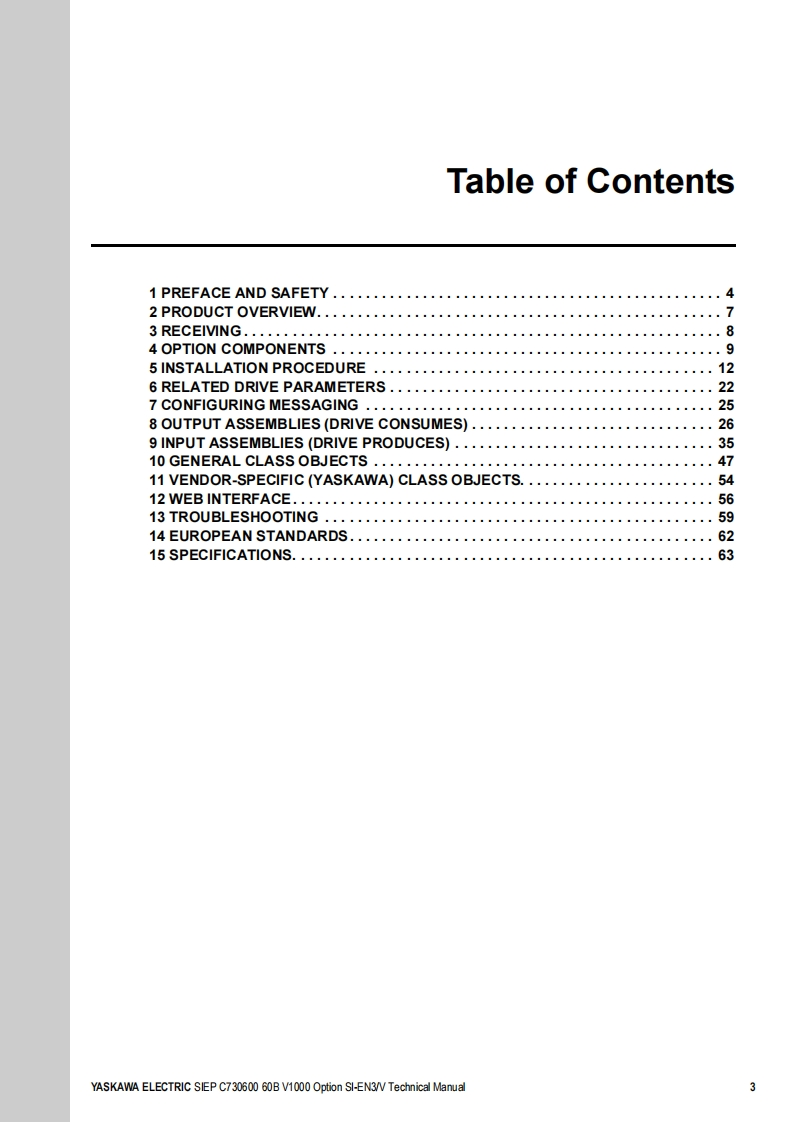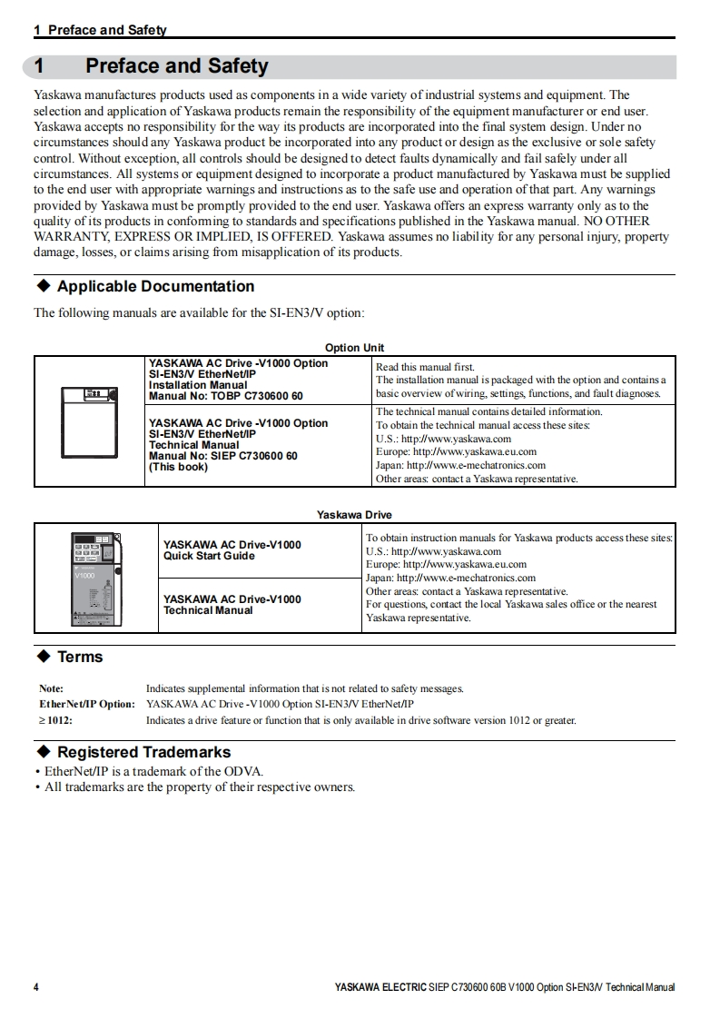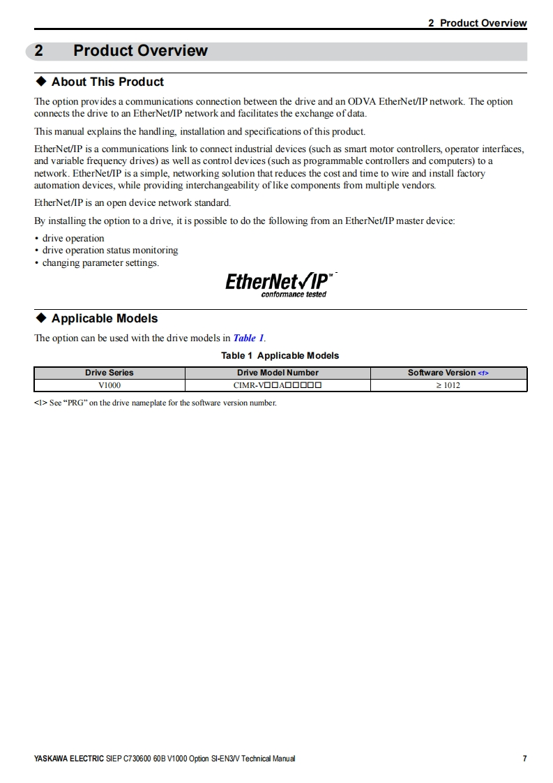 YASKAWAYASKAWA AC Drive-V1000 OptionEtherNet/IPTechnical ManualType:SI-EN3/VTo properly use the product,read this manual thoroughly and retainfor easy reference,inspection,and maintenance.Ensure the end userreceives this manual.881MANUAL NO.SIEP C730600 60B