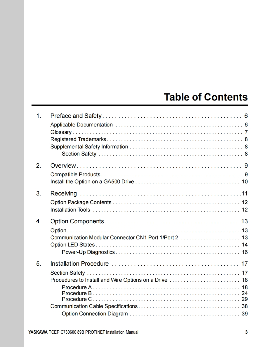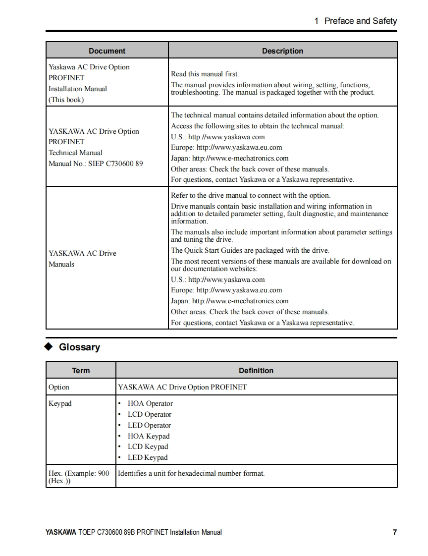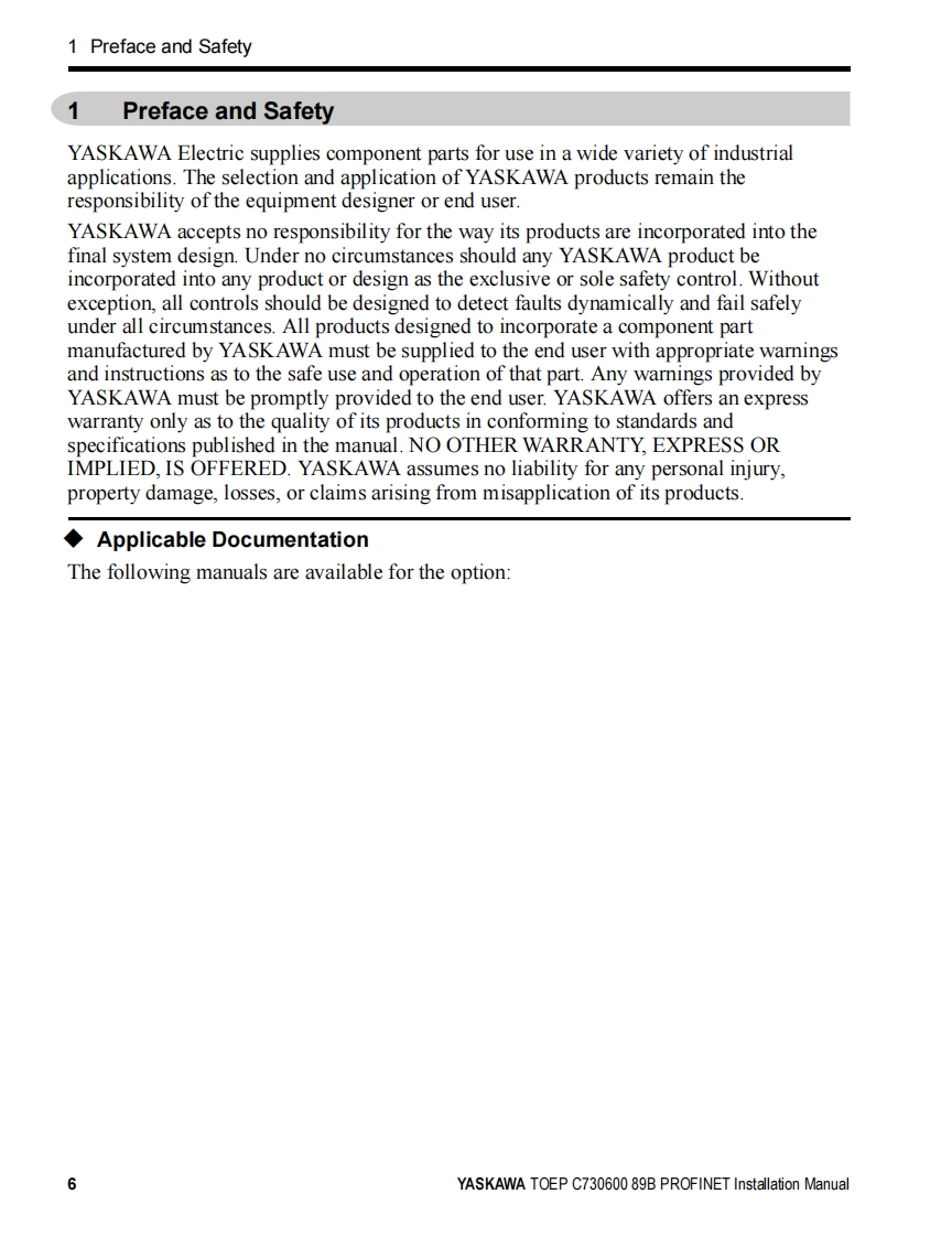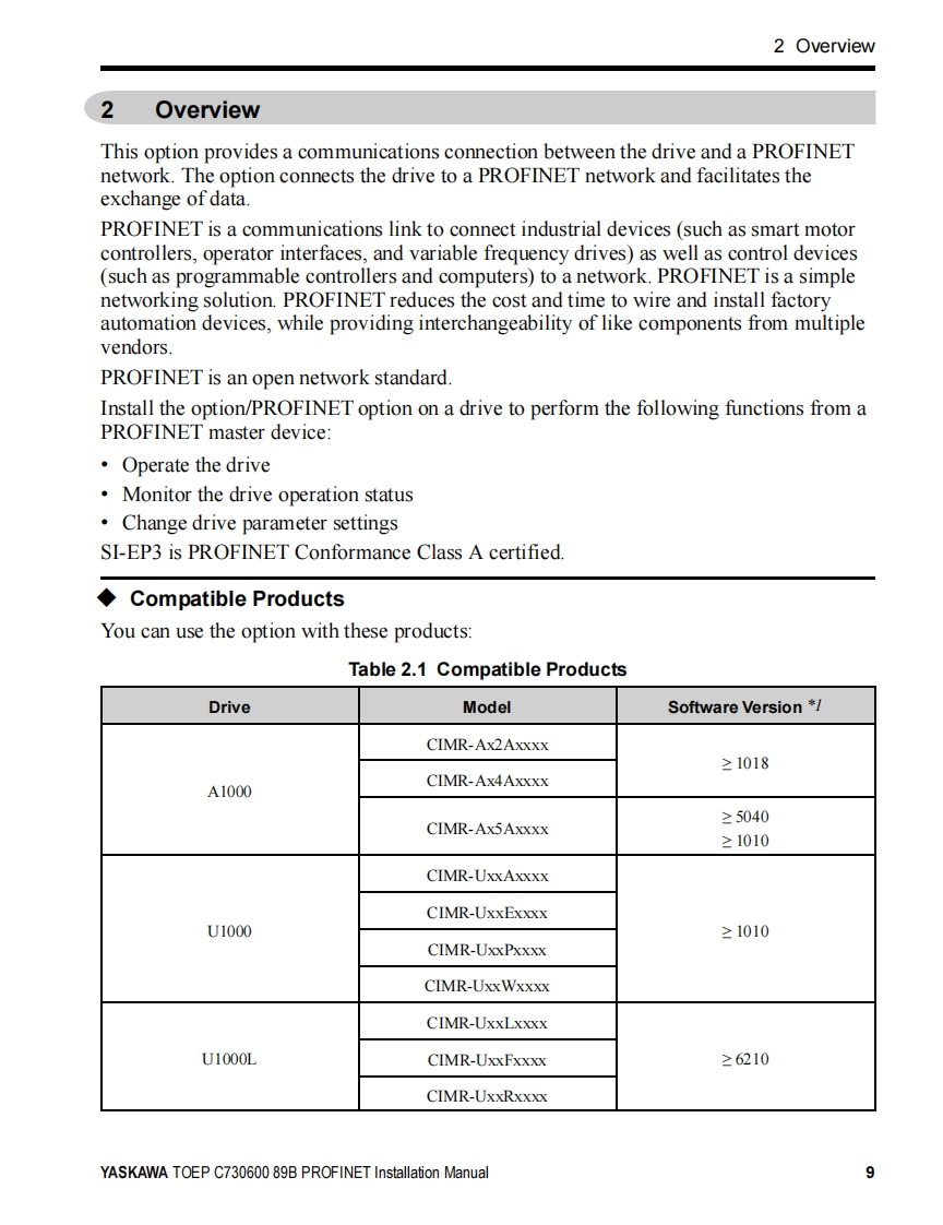 YASKAWAYASKAWA AC Drive OptionPROFINETInstallation ManualType:SI-EP3To correctly use the product,read this manual thoroughly and keep itfor easy reference,inspection,and maintenance.Make sure that theend user receives this manual.安川不)心一夕才)3)PROFINET通信取圾說明書形式Sl-EP3製品在安全书使虬儿龙<协亿.本書在必李书蔬动<龙达L。未无,本苦在书手元保管乙龙<上上七仁.最終的本製品卷C使用I忙:石ユ一步一樣0手元確実届寸5九石太5.书取b計SL顺未寸。68。0888888G6000®00新3三0m:00MANUAL NO.TOBP C730600 89F