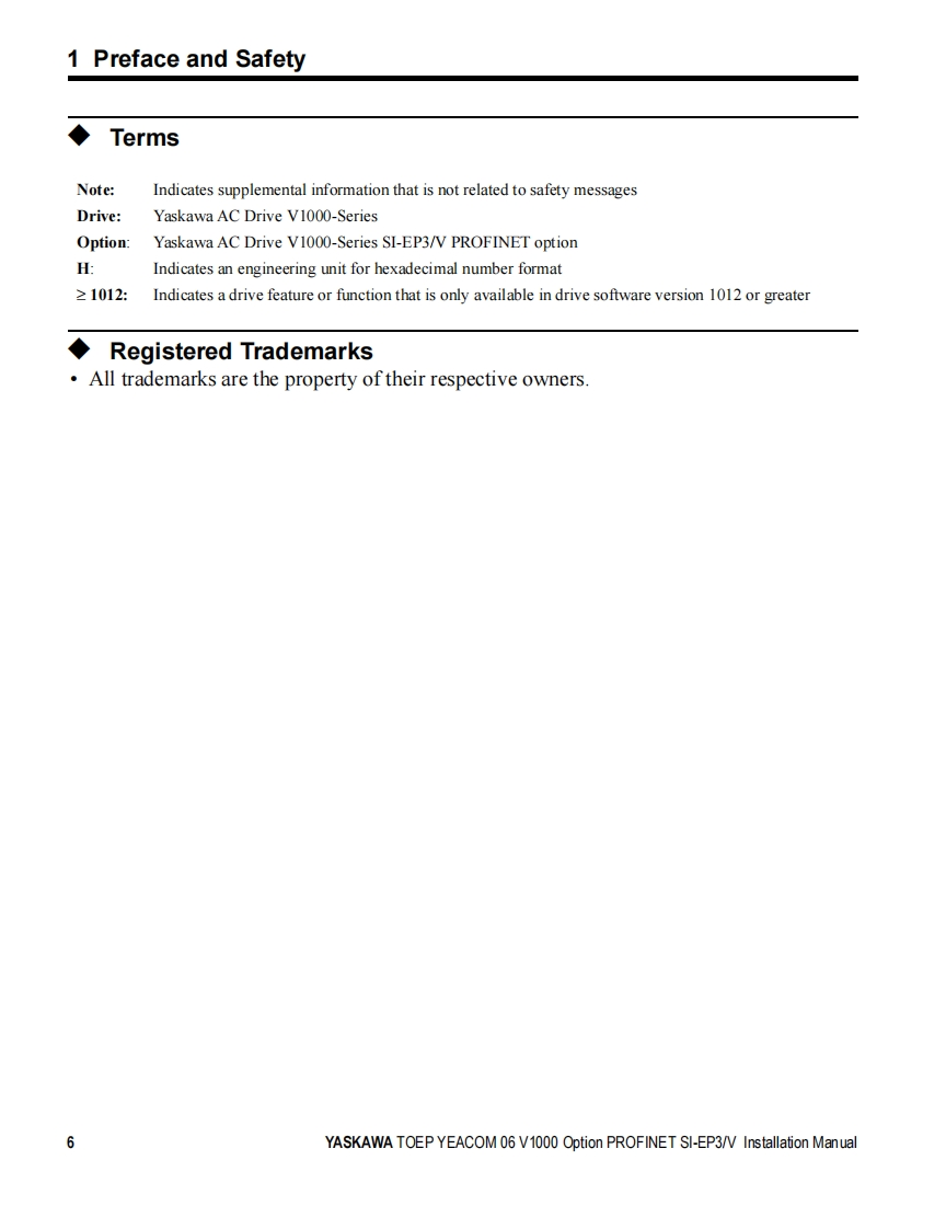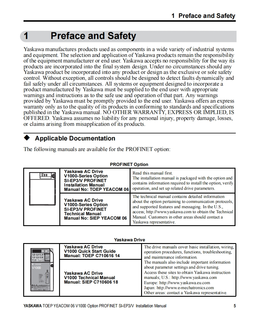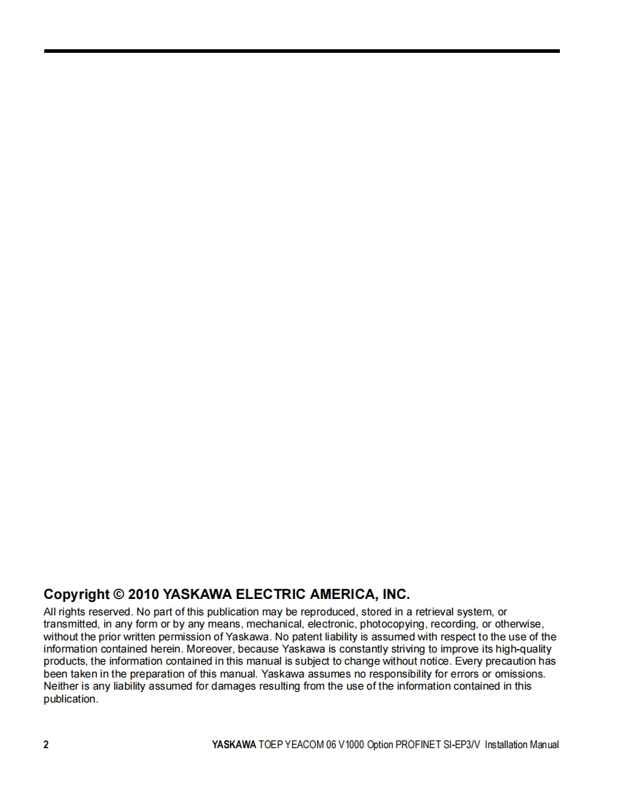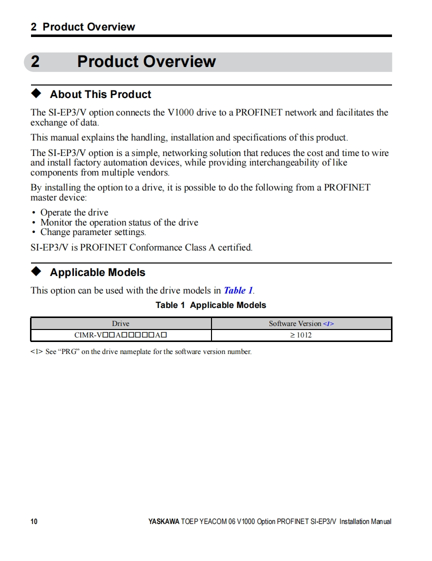 YASKAWAYASKAWA AC Drive-V1000 OptionPROFINETInstallation ManualType Sl-EP3/VTo properly use the product,read this manual thoroughly and retainfor easy reference,inspection,and maintenance.Ensure the end userreceives this manual.88MANUAL NO.TOEP YEACOM 06