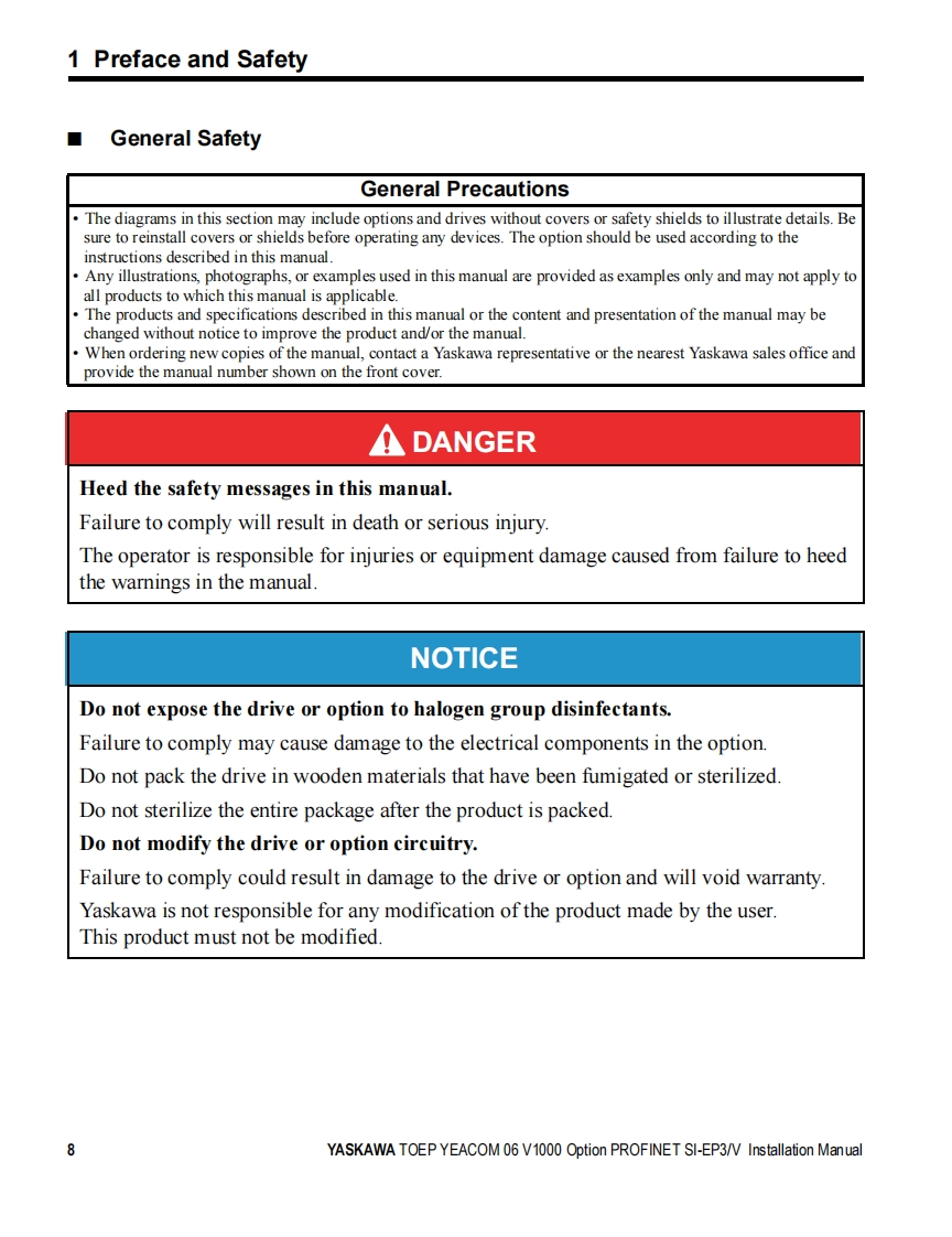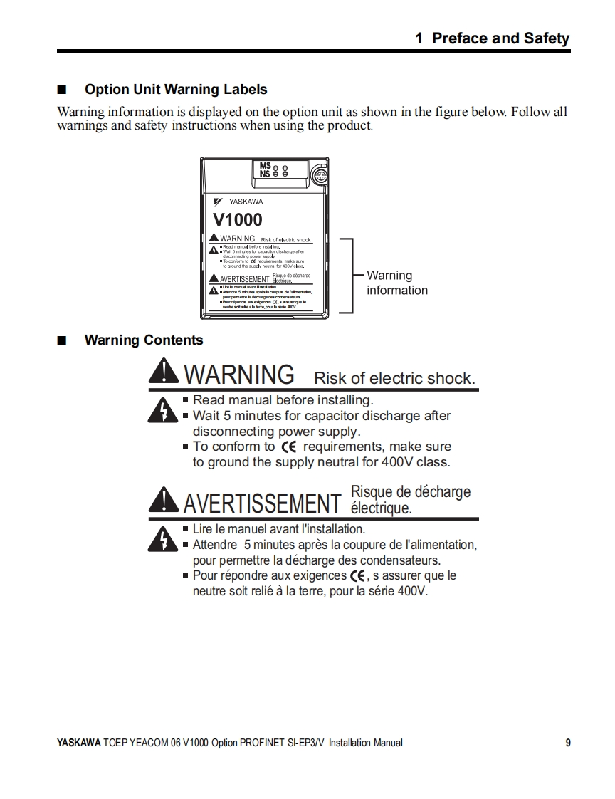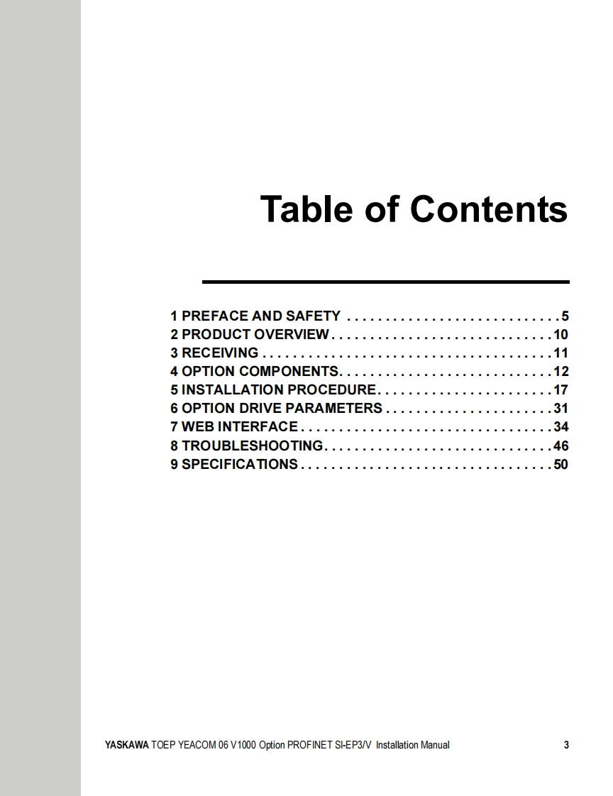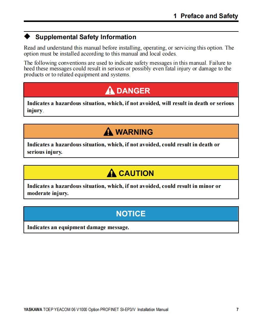 YASKAWAYASKAWA AC Drive-V1000 OptionPROFINETInstallation ManualType Sl-EP3/VTo properly use the product,read this manual thoroughly and retainfor easy reference,inspection,and maintenance.Ensure the end userreceives this manual.88MANUAL NO.TOEP YEACOM 06