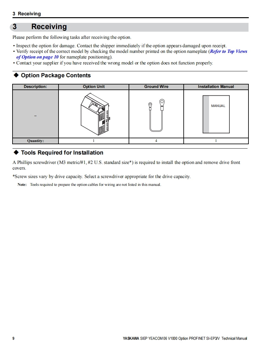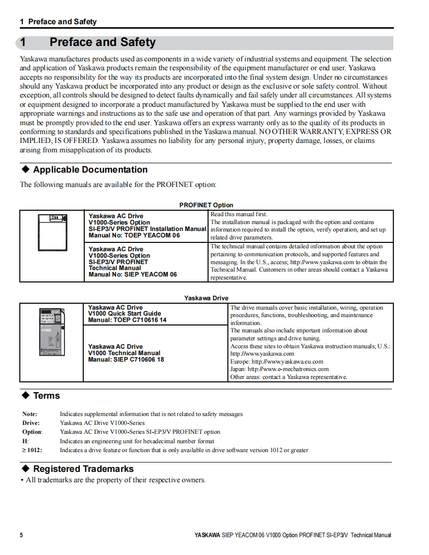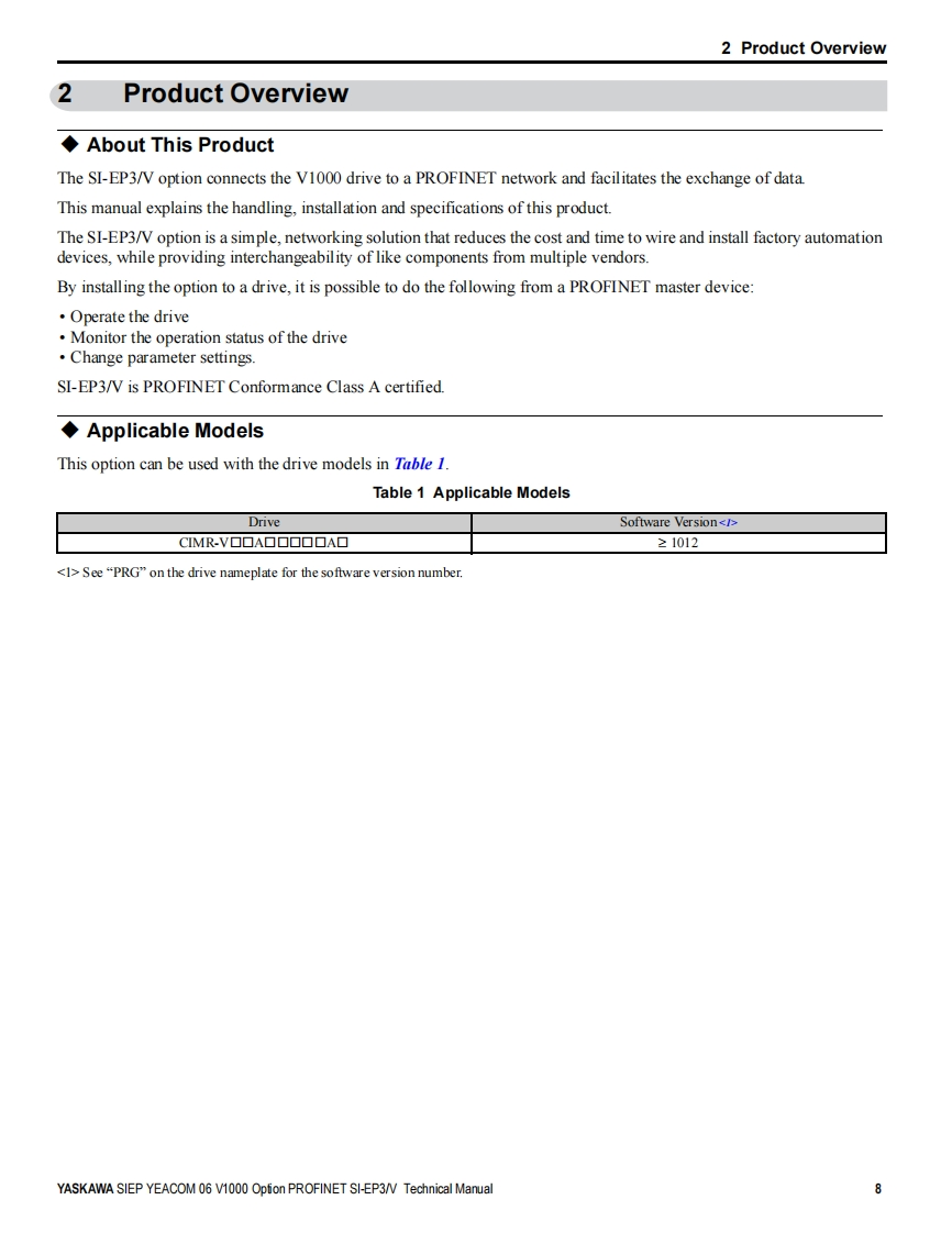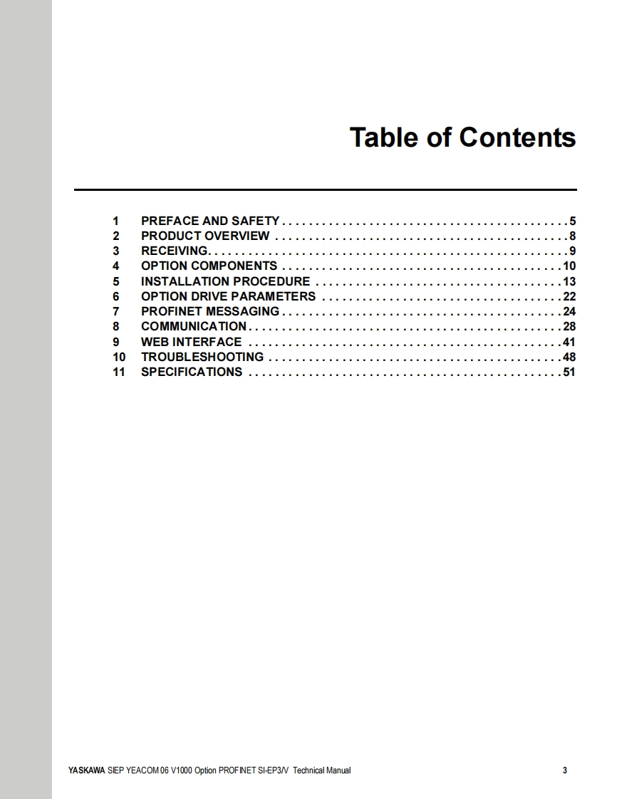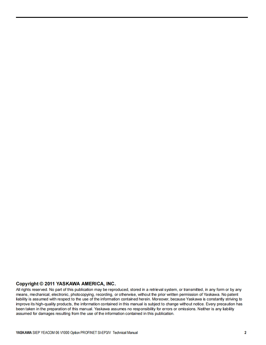 YASKAWAYASKAWA AC Drive-V1000 OptionPROFINETTechnical ManualType SI-EP3/VTo properly use the product,read this manual thoroughly and retainfor easy reference,inspection,and maintenance.Ensure the end userreceives this manual.88J叫MANUAL NO.SIEP YEACOM 06