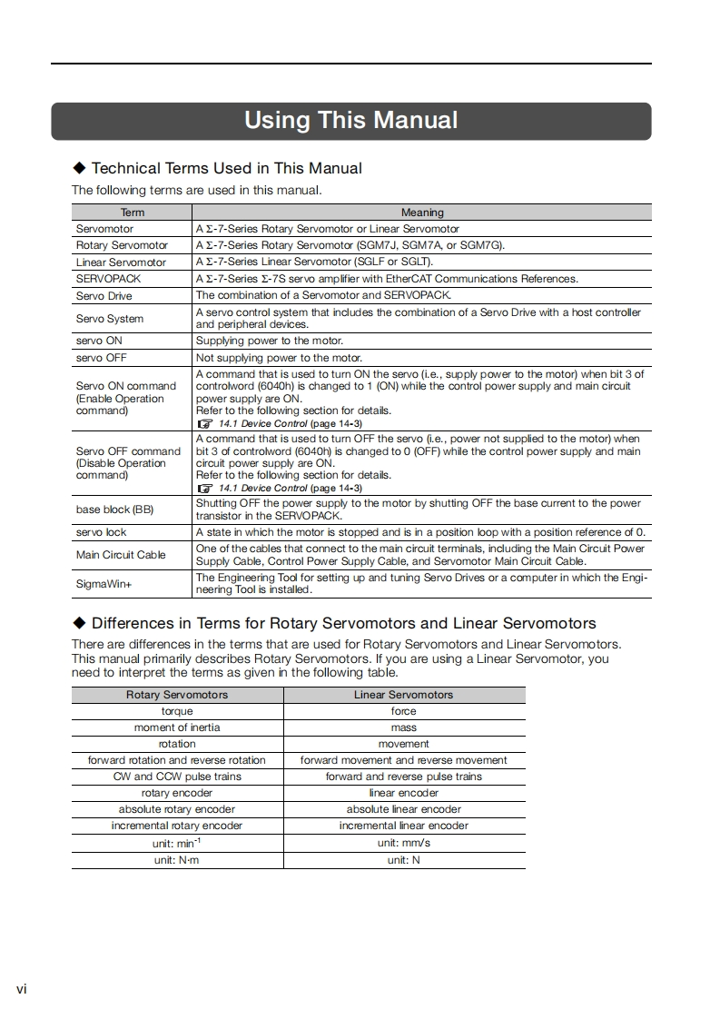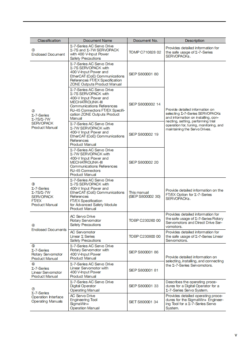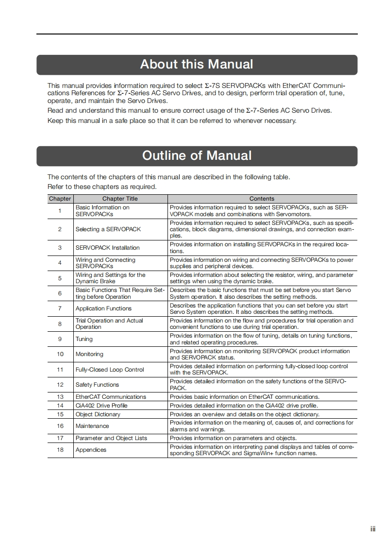 YASKAWAE-7-Series AC Servo Drive2-7S SERVOPACK with400V-Input Power andEtherCAT (CoE)Communications ReferencesFT/EX Specificationfor Advanced Safety ModuleProduct ManualModel:SGD7S-▣▣▣DA0▣8▣▣F91Basic Information onSERVOPACKsSelecting a SERVOPACK2SERVOPACK Installation今Wiring and ConnectingSERVOPACKs4Wiring and Settings for theDynamic Brake5Basic Functions That RequireSetting before Operation6Application Functions7Trial Operation andActual Operation8Tuning9Monitoring10Fully-Closed Loop Control11Safety Functions12EtherCAT Communications13CiA402 Drive Profile14Object Dictionary15Maintenance16Parameter and Object Lists17Appendices18MANUAL NO.SIEP S800002 30L