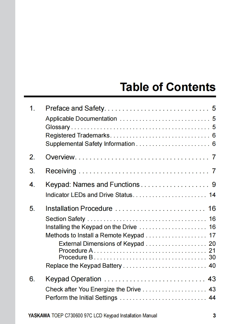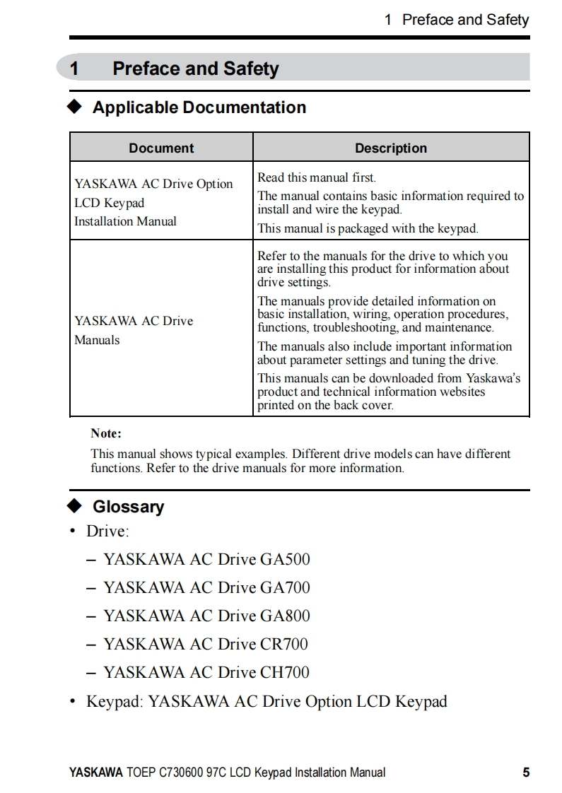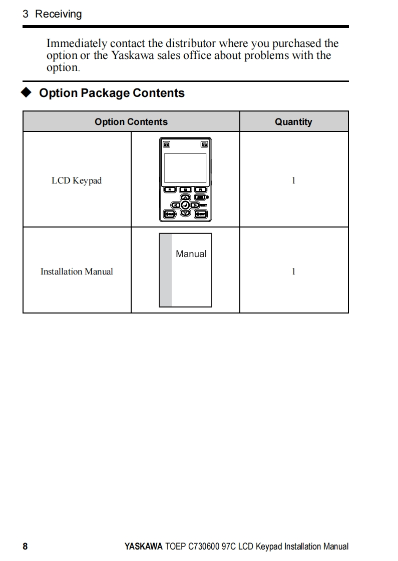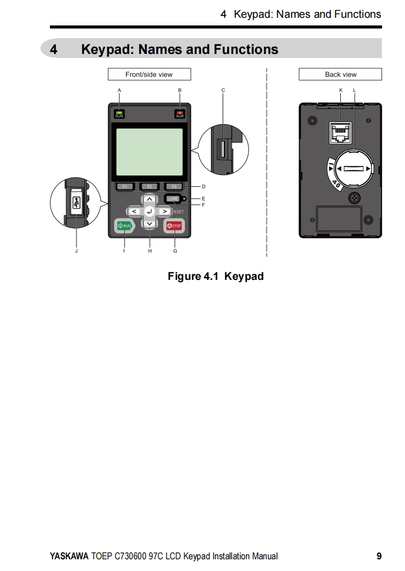 YASKAWAYASKAWA AC Drive OptionLCD KeypadInstallation ManualType:JVOP-KPLCA04Axx,JVOP-KPLCA04Mxx,JVOP-KPLCA04KxxTo properly use the product,read this manual thoroughly and retain for easyreference,inspection,and maintenance.Ensure the end user receives thismanual.鼠品F1F2F3RESETRUNSTOPMANUAL NO.TOEP C730600 97C
