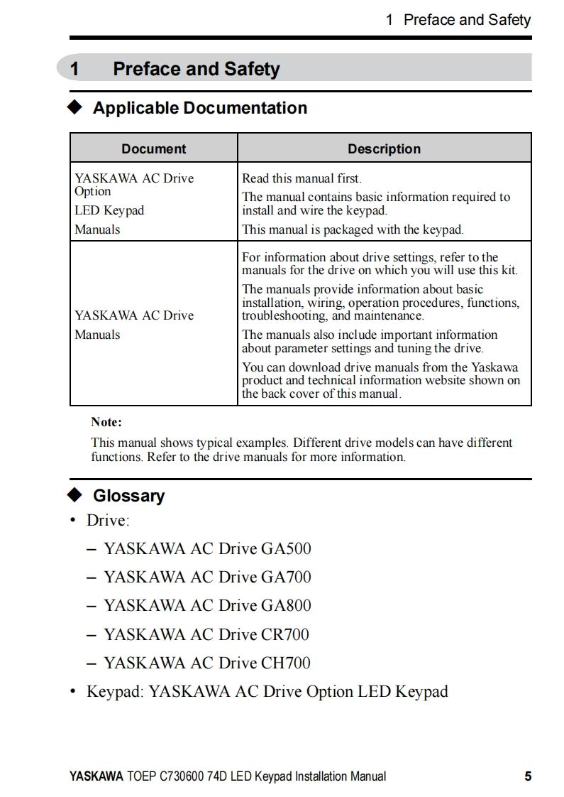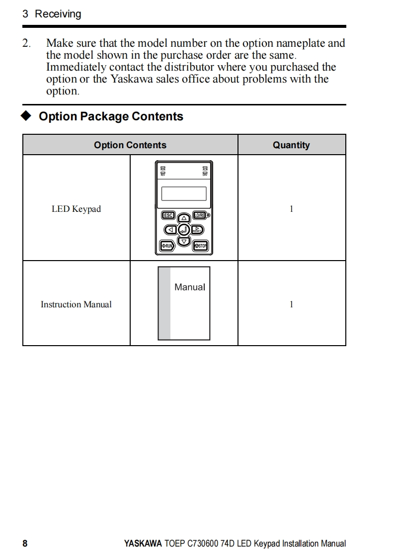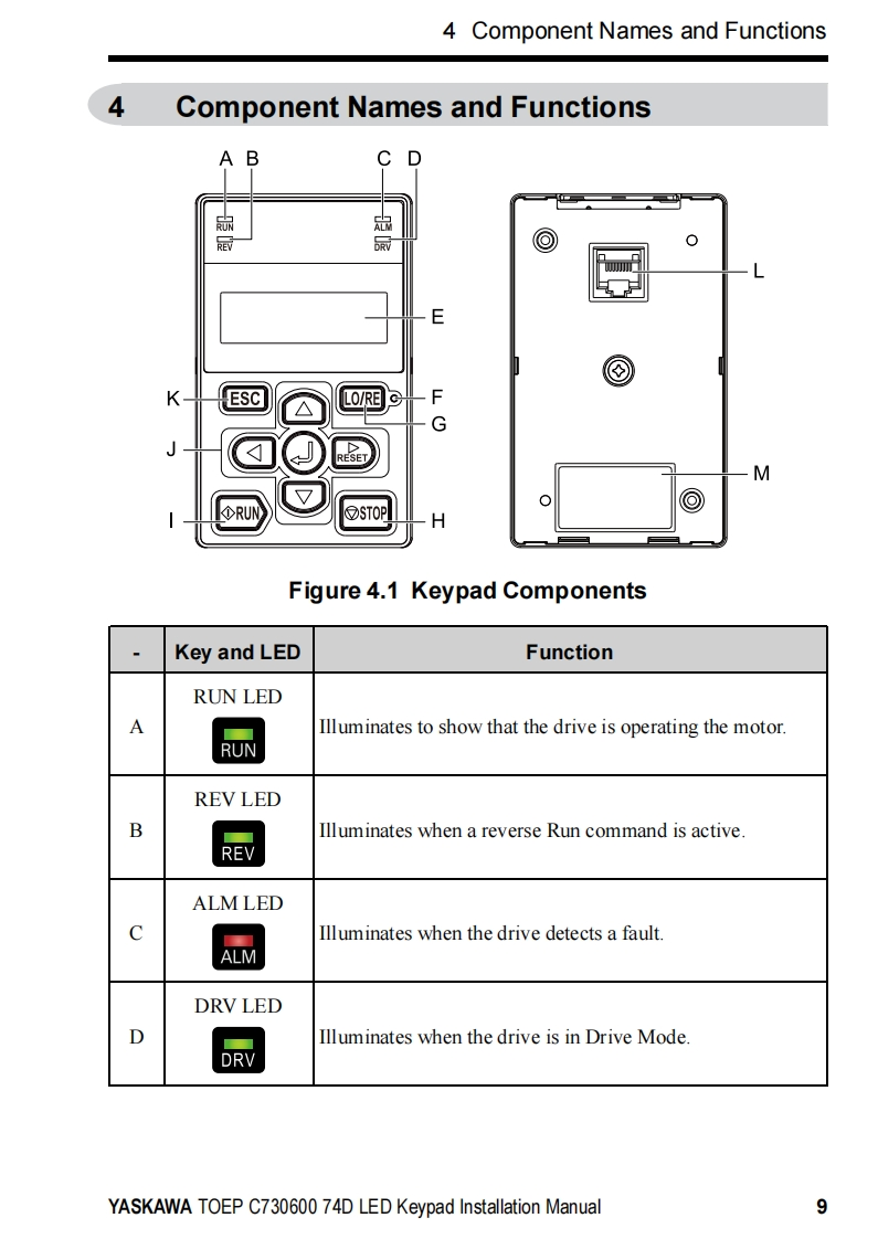 YASKAWAYASKAWA AC Drive OptionLED KeypadInstallation ManualType:JVOP-KPLEA04Axx,JVOP-KPLEA04MxxTo properly use the product,read this manual thoroughly and retain for easyreference,inspection,and maintenance.Ensure the end user receives thismanual.品忌ESCLO/RERESETRUN⑦ST0PMANUAL NO.TOEP C730600 74D